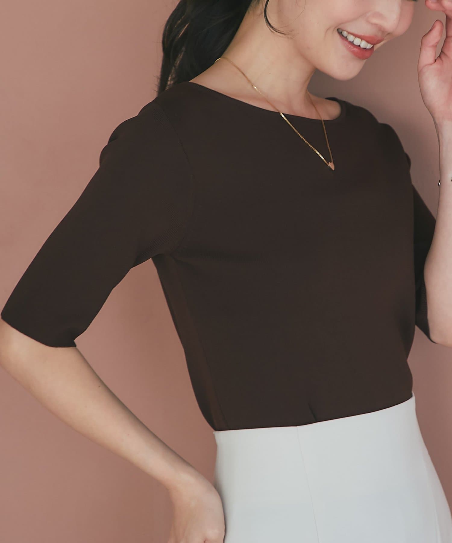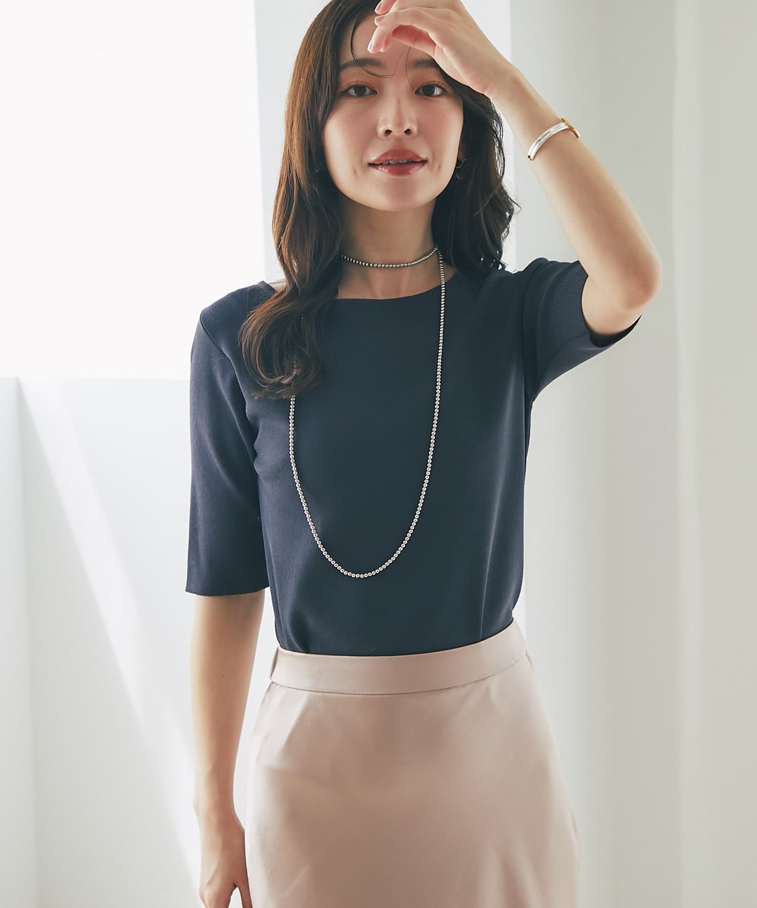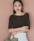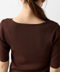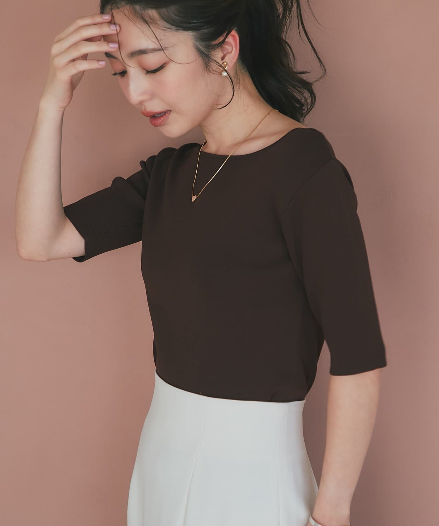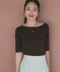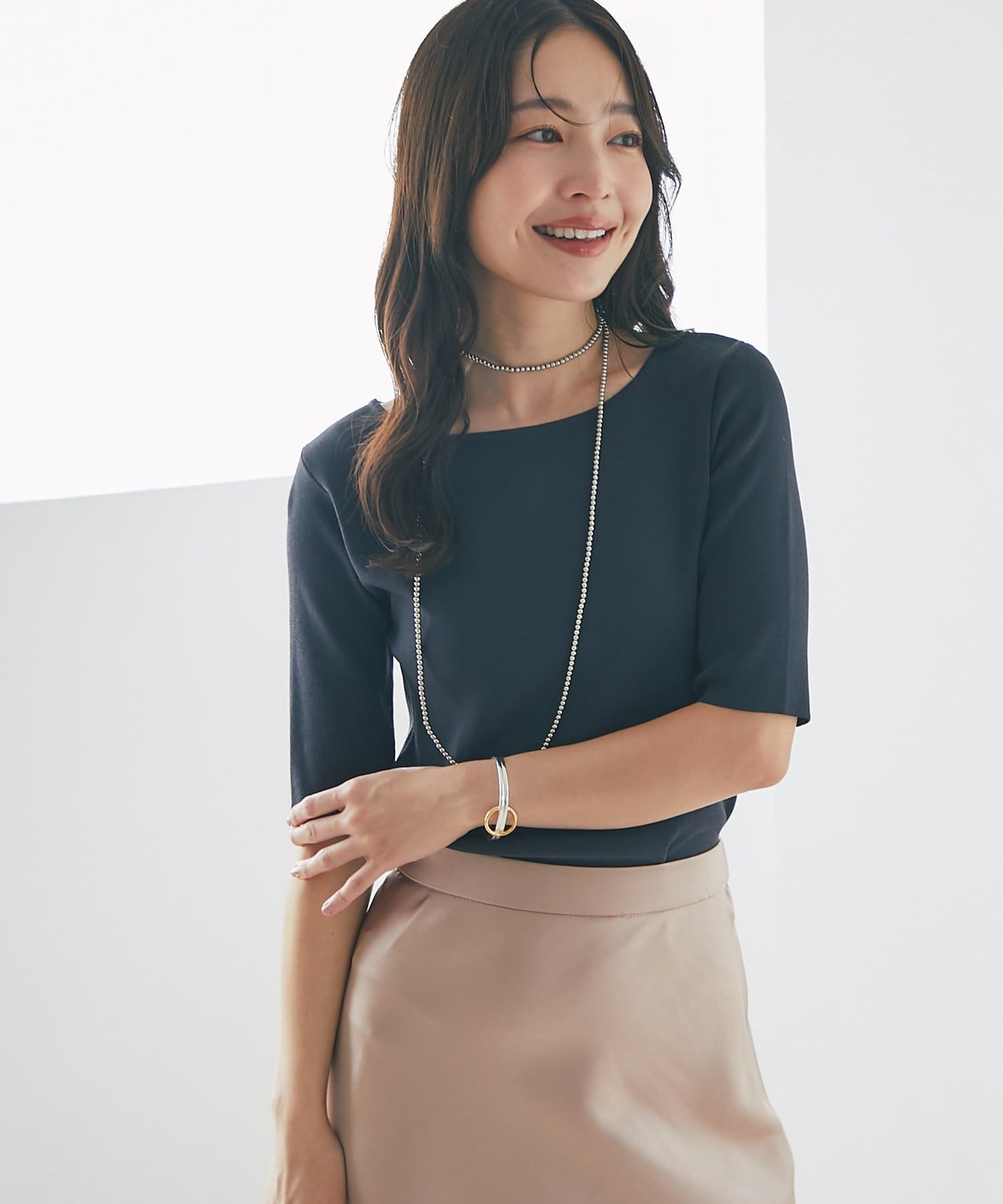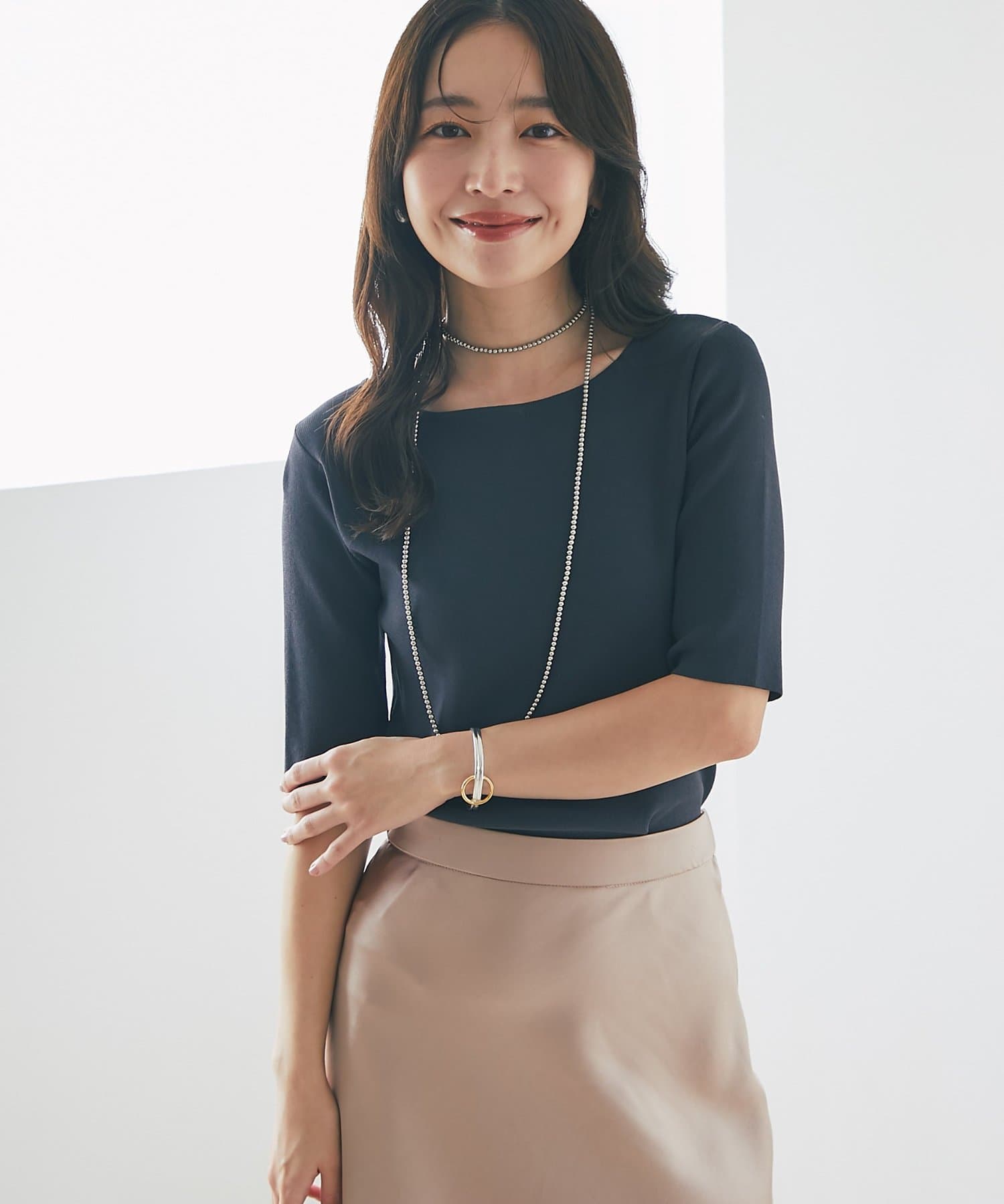浅いボートネックがデコルテをきれいに見せてくれる1枚。