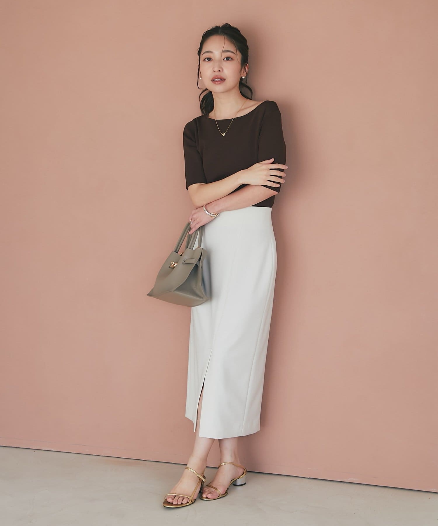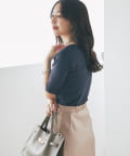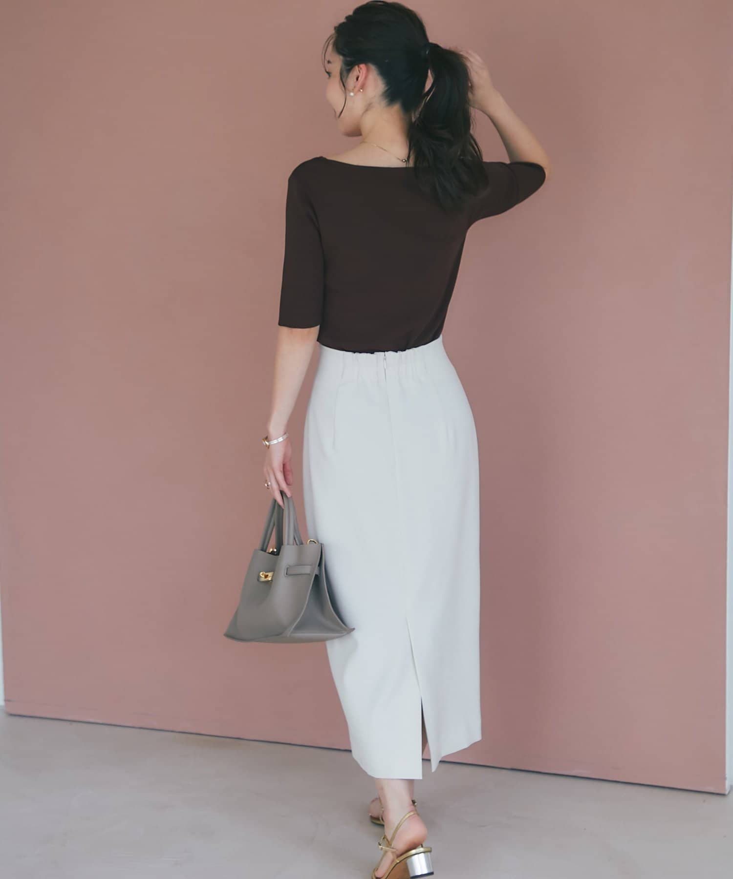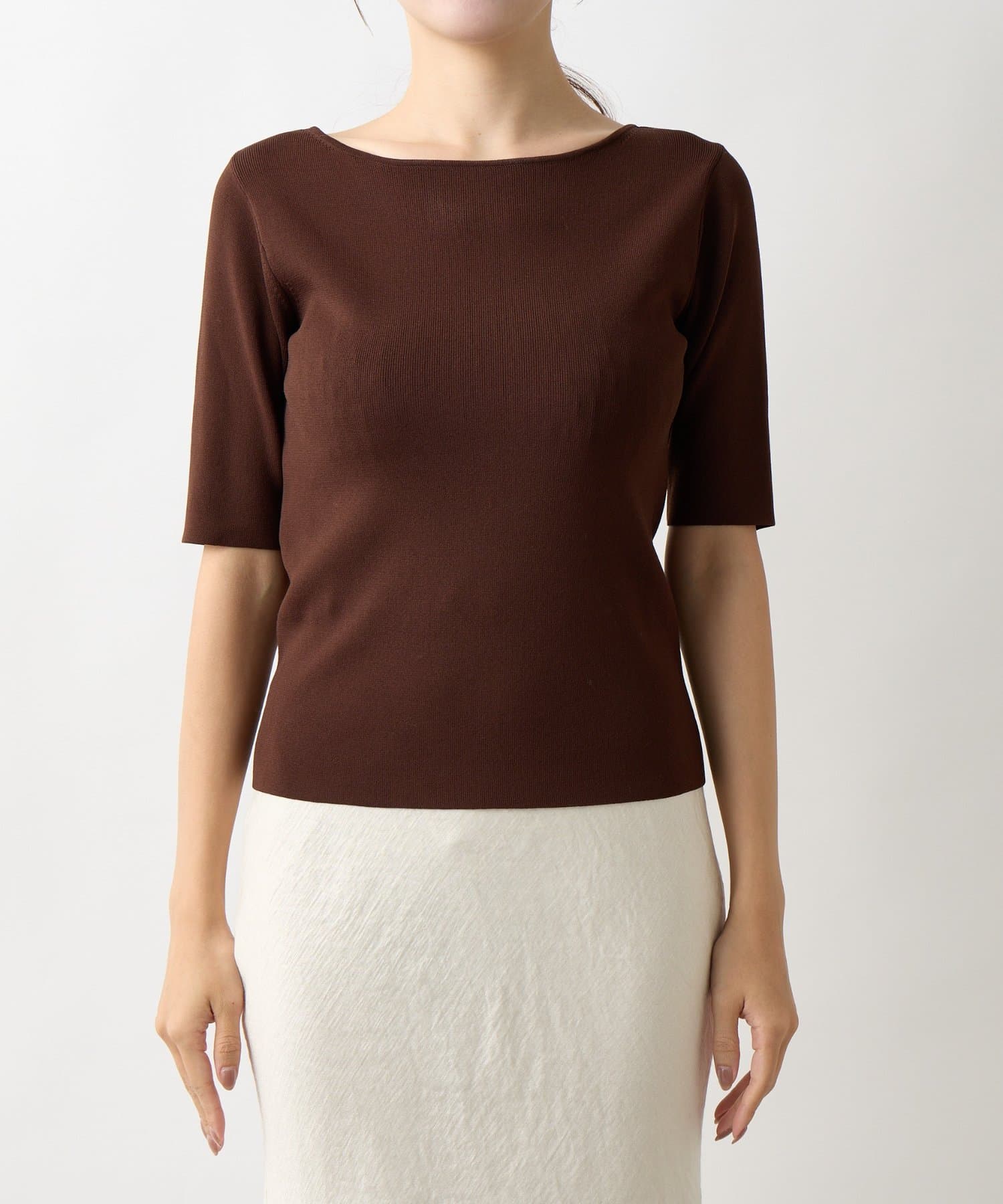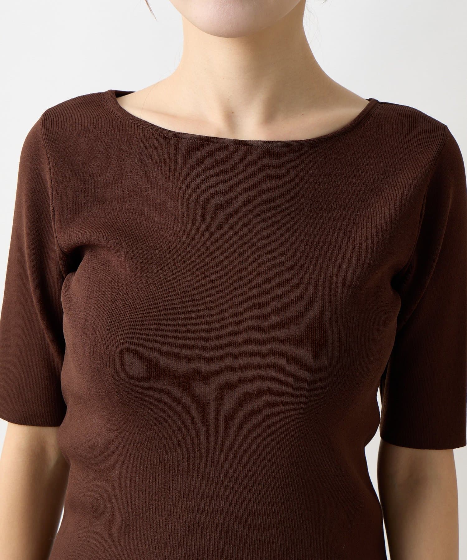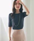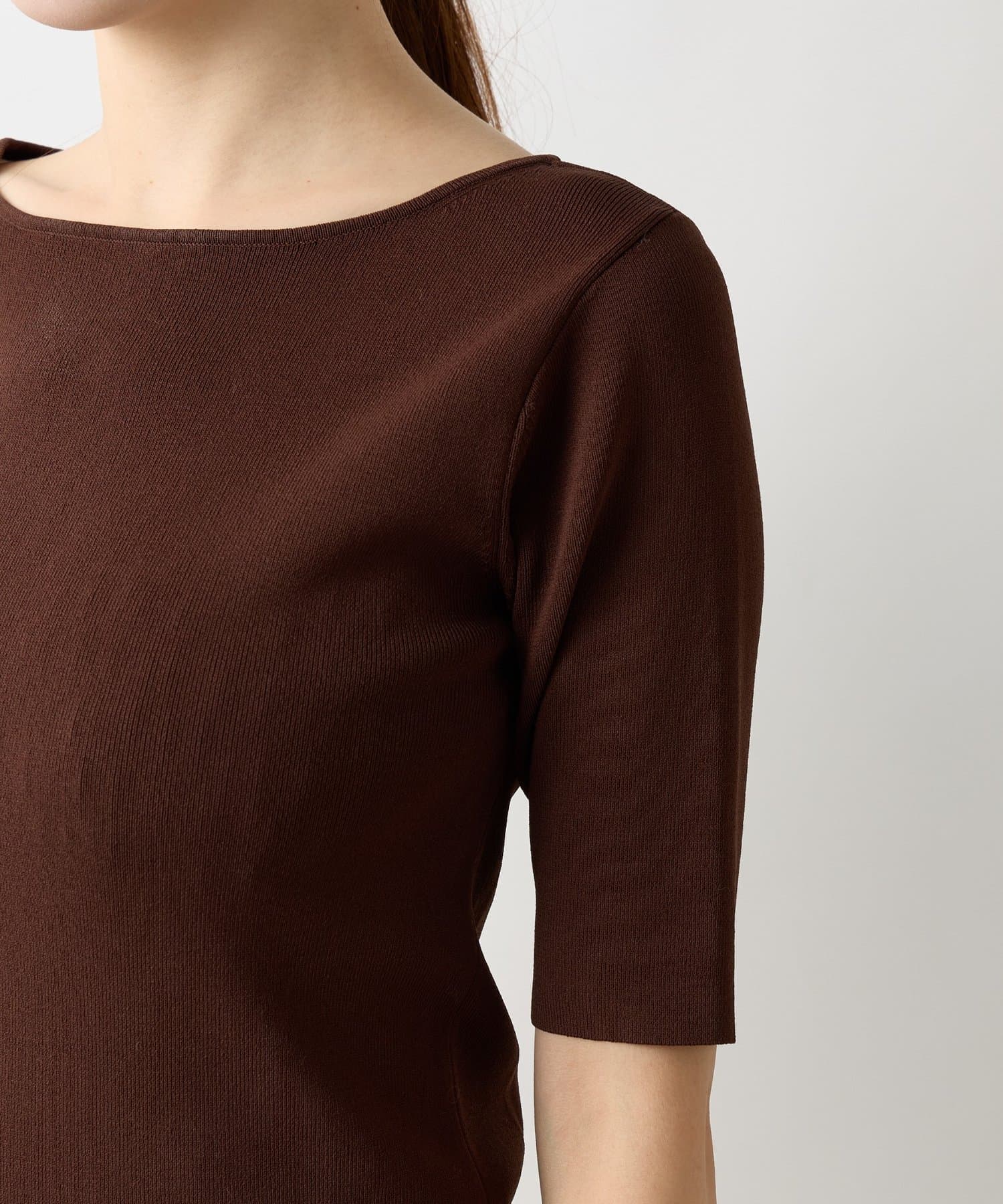 浅いボートネックがデコルテをきれいに見せてくれる1枚。