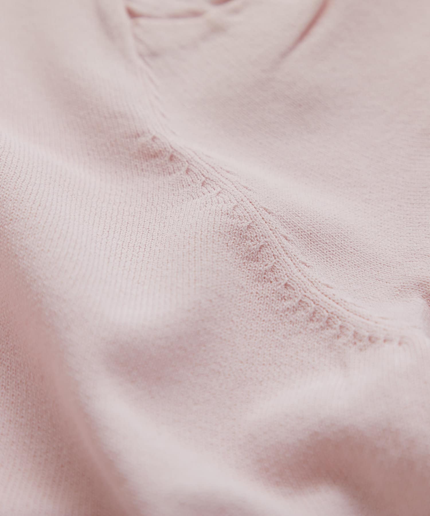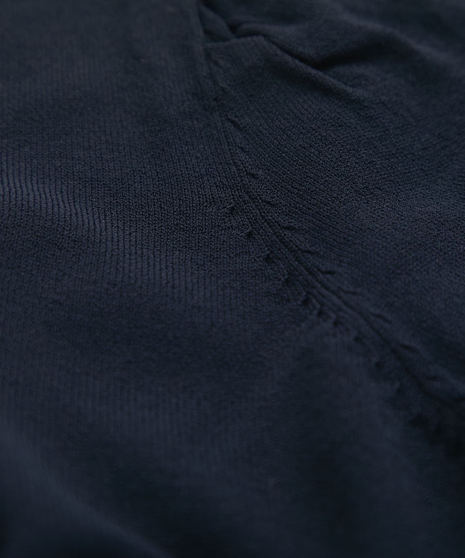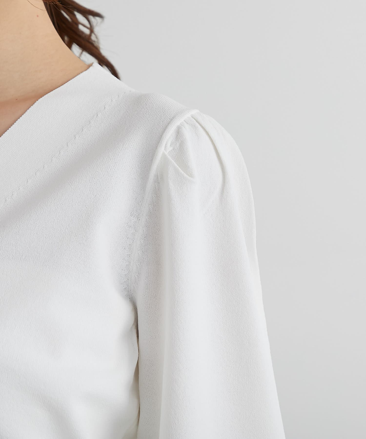 ネックラインはすっきりとデコルテを美しく演出し、一枚着としても着用頂ける浅めのVネックとなっております。