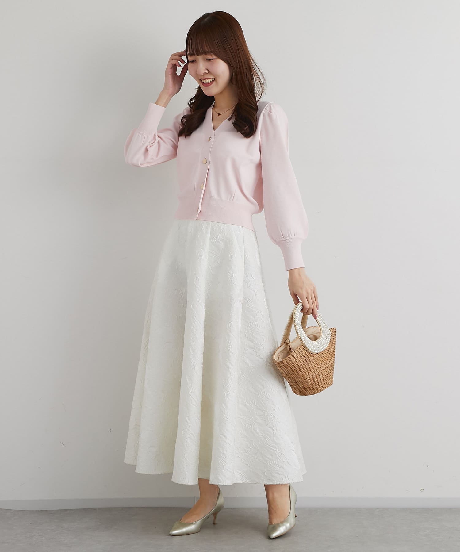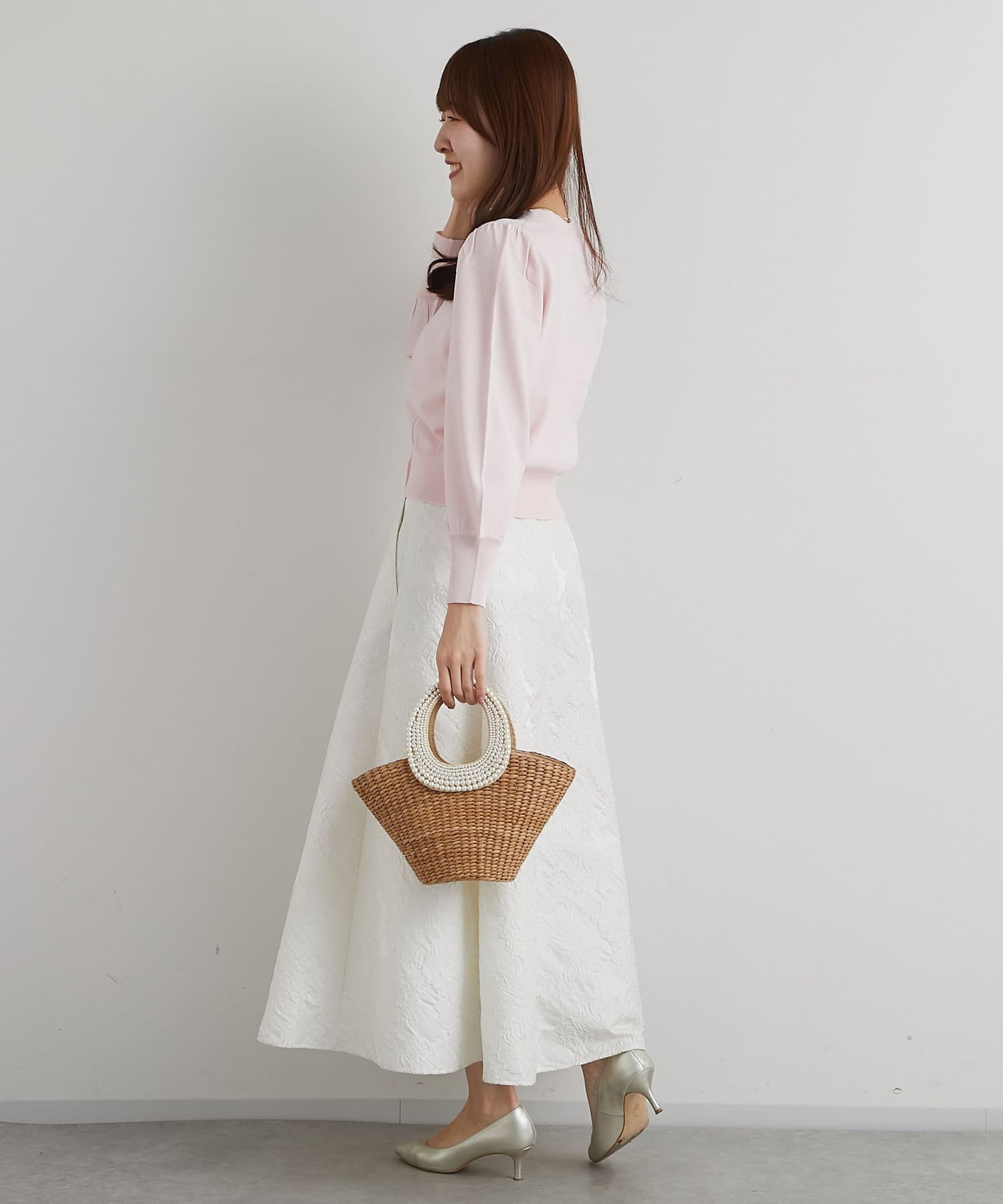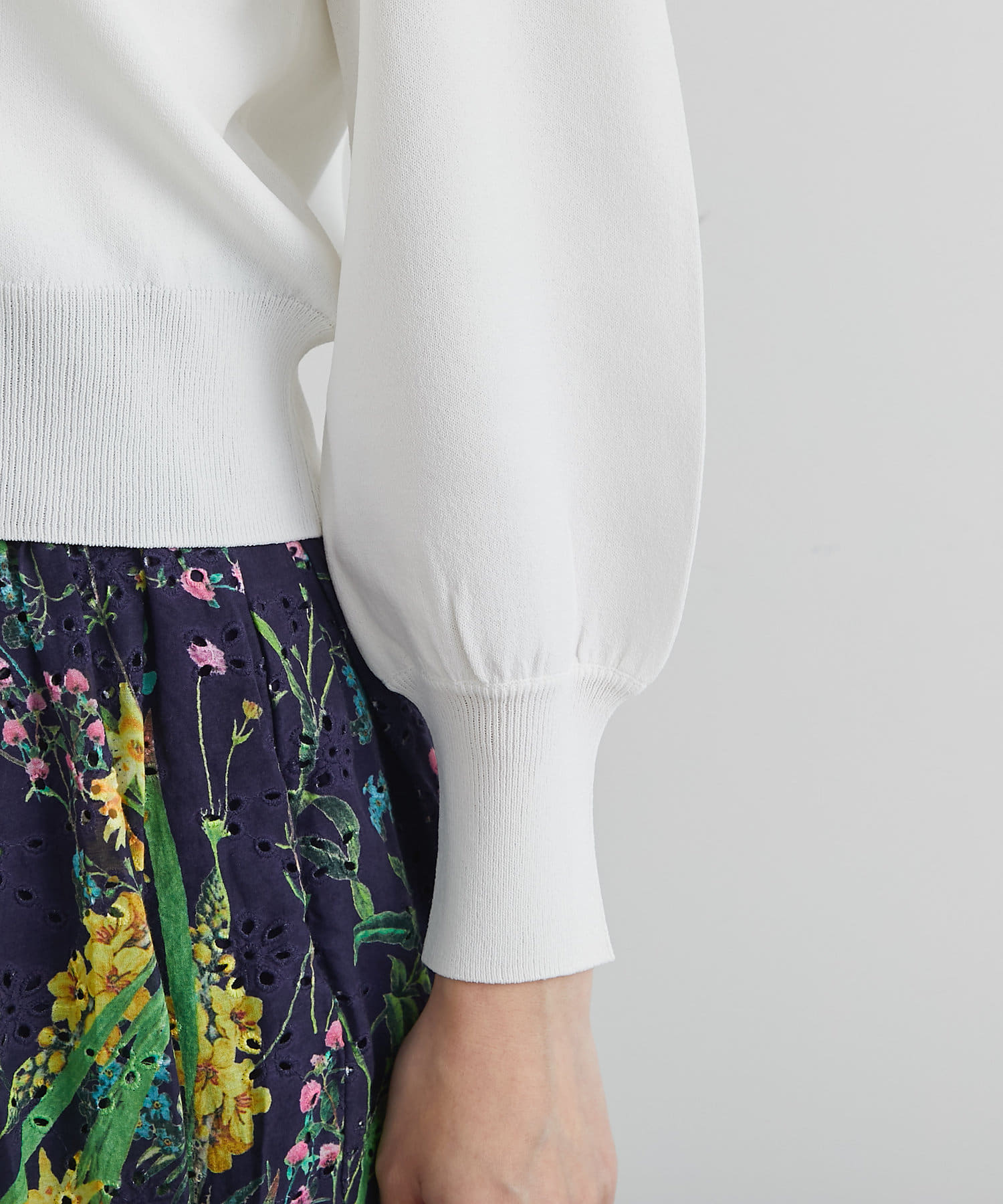 同素材の5分袖ニットとのセットアップもおすすめのアイテムです。