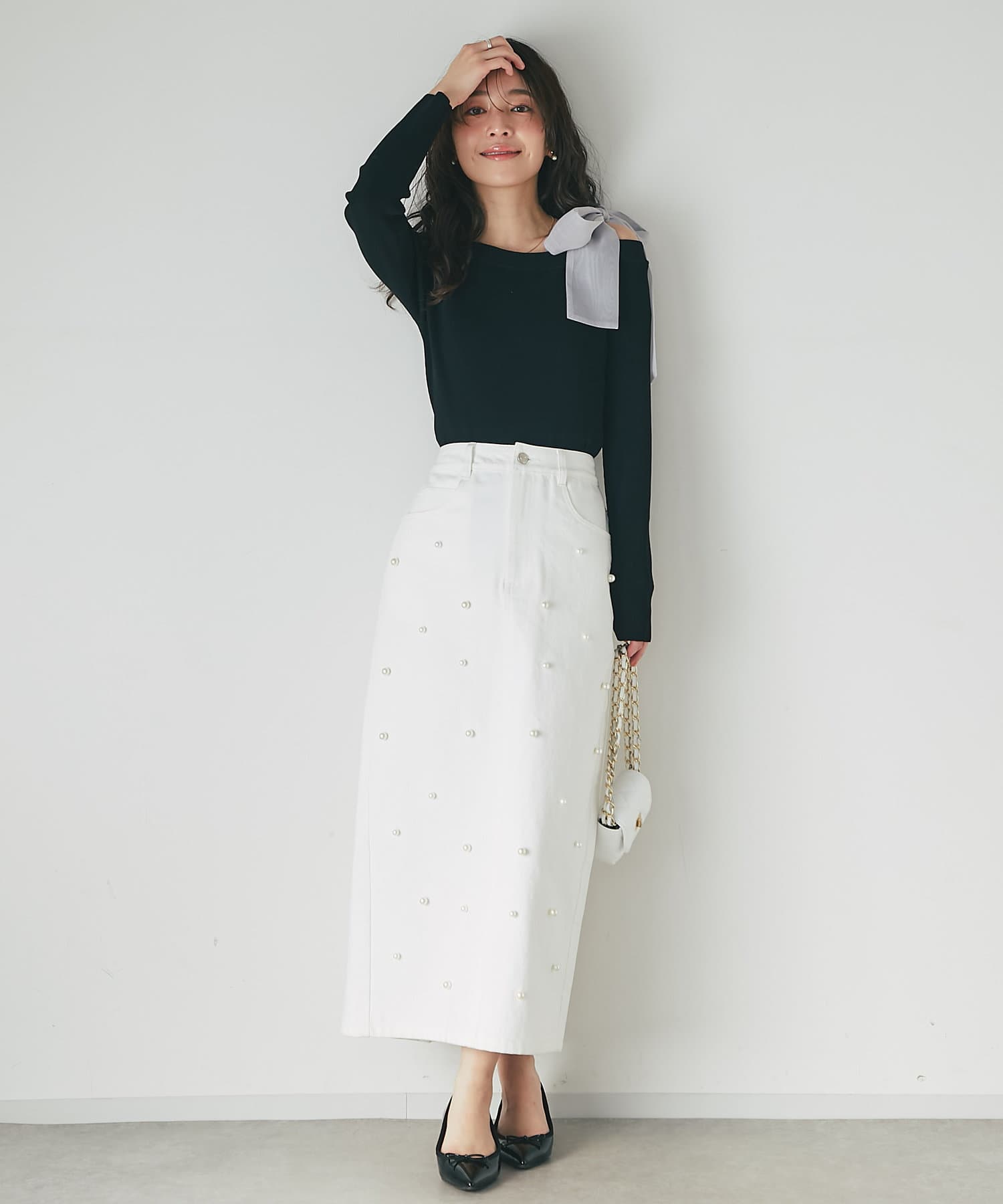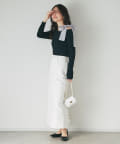 タイトなシルエットなのでフレアスカートとの華やかコーデがおすすめ