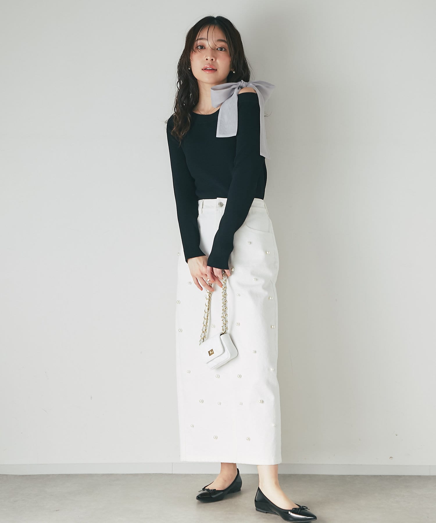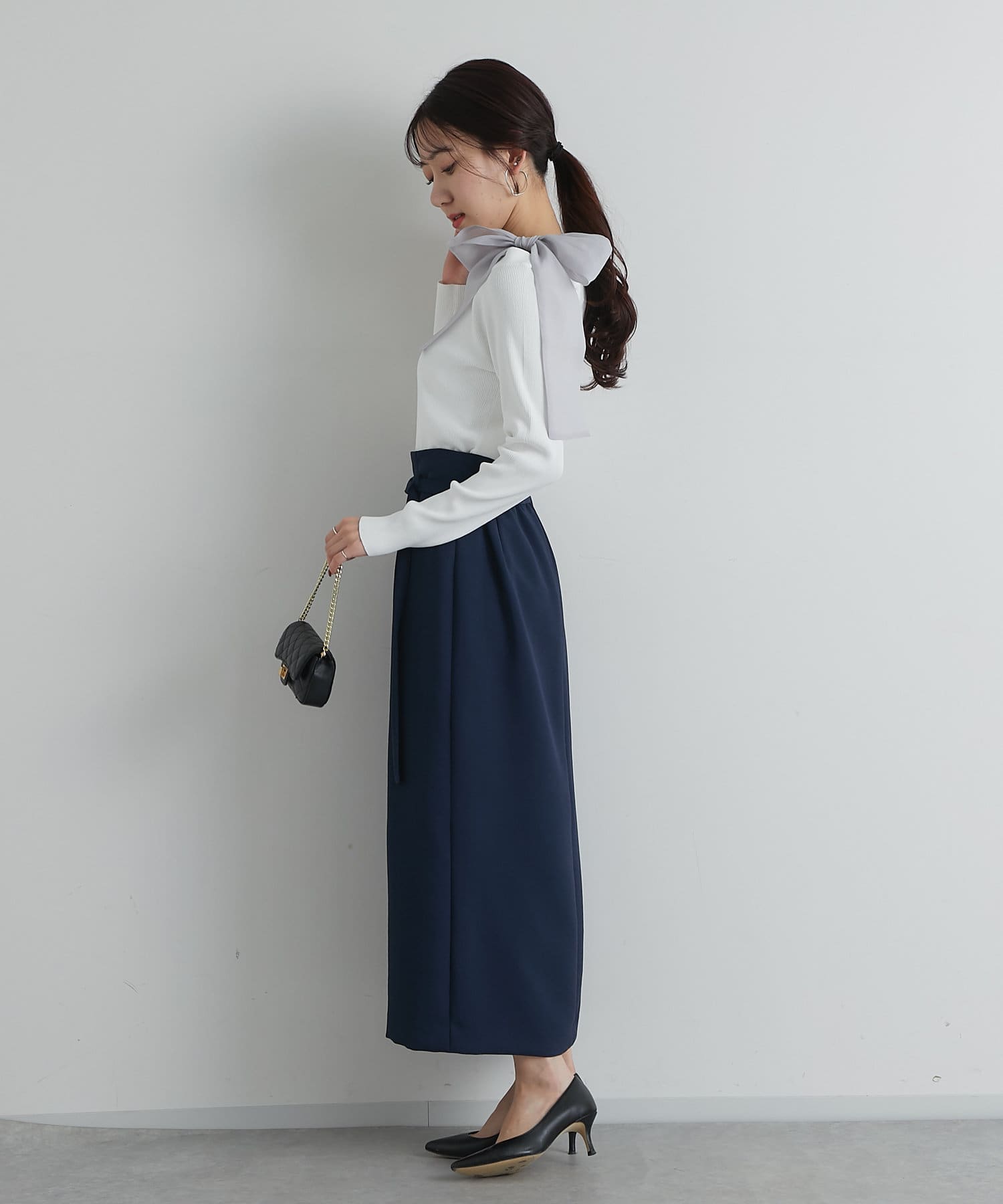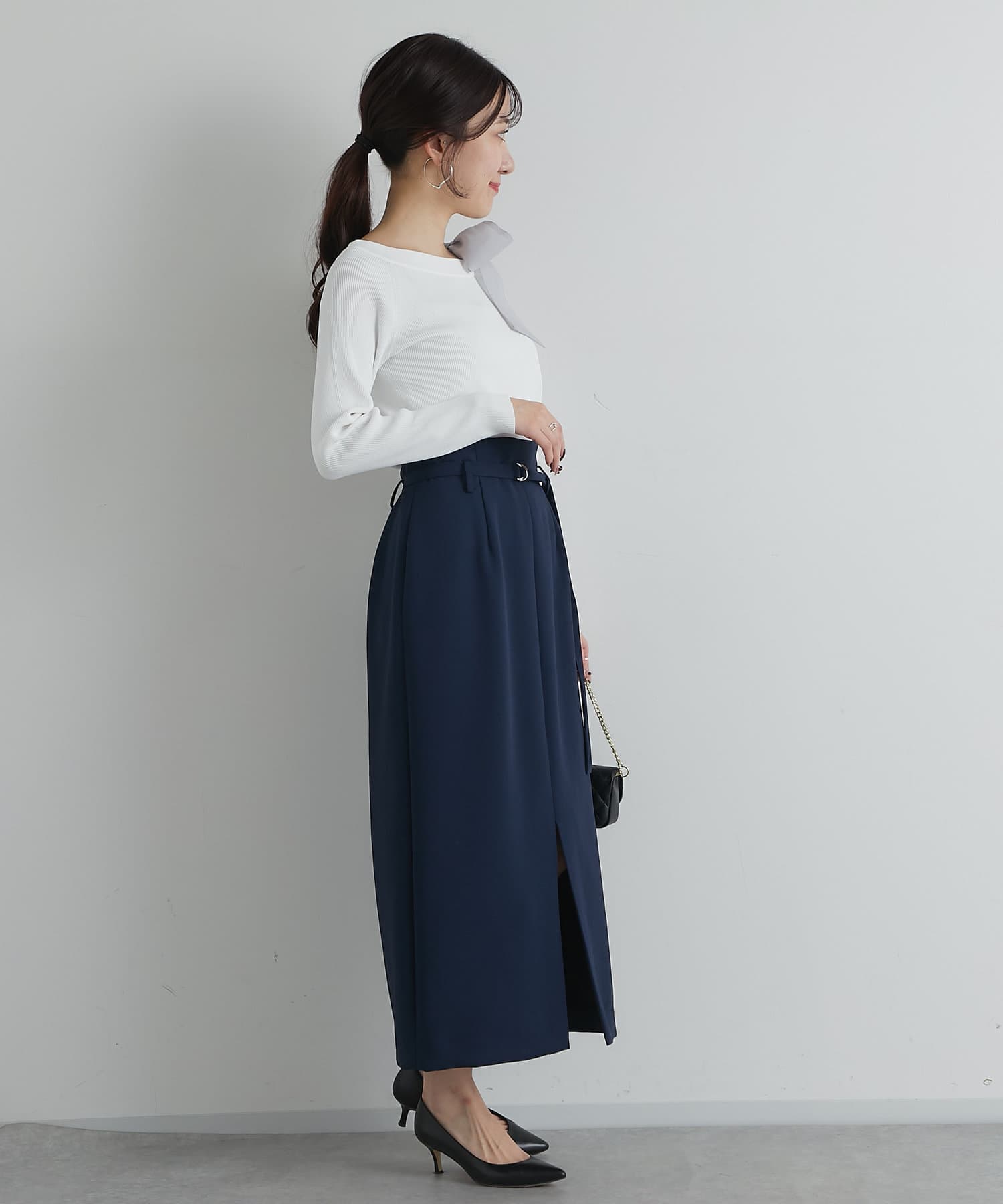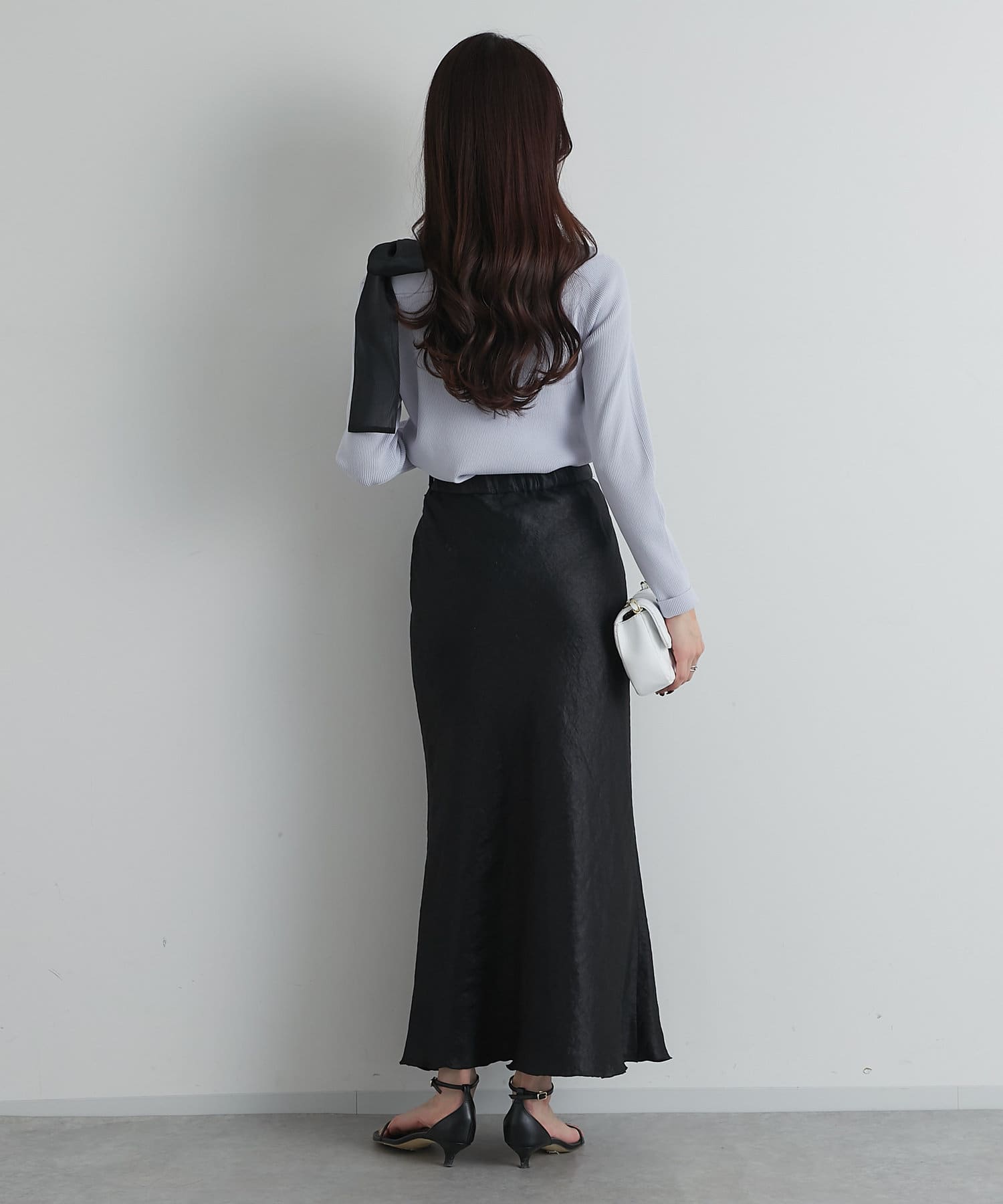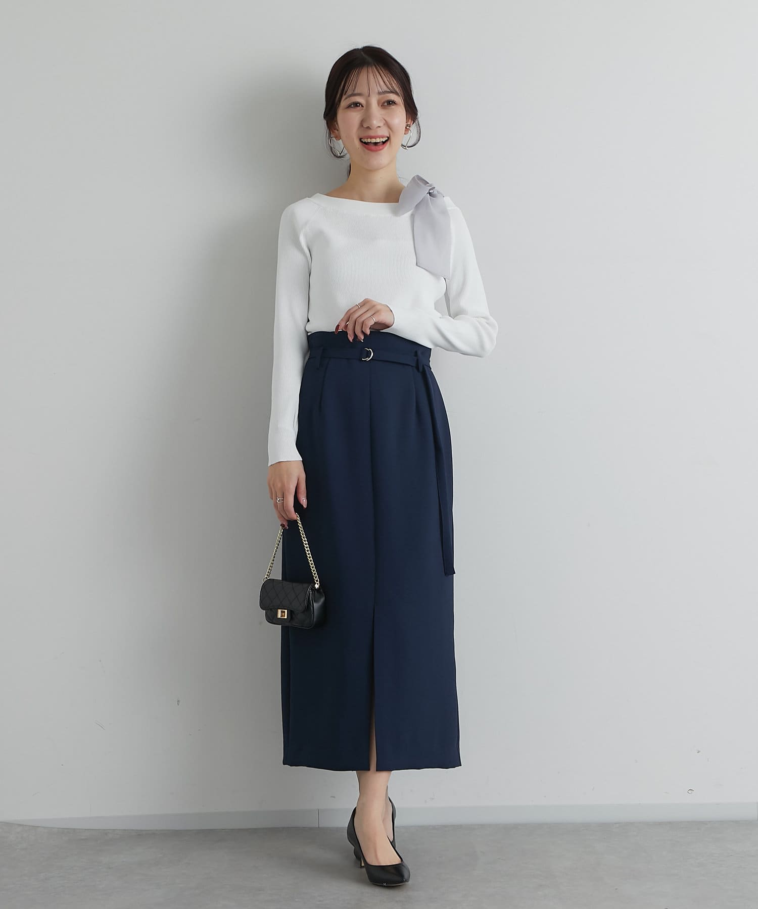 ナロースカートに合わせた縦長コーデはスタイルアップ効果も◎