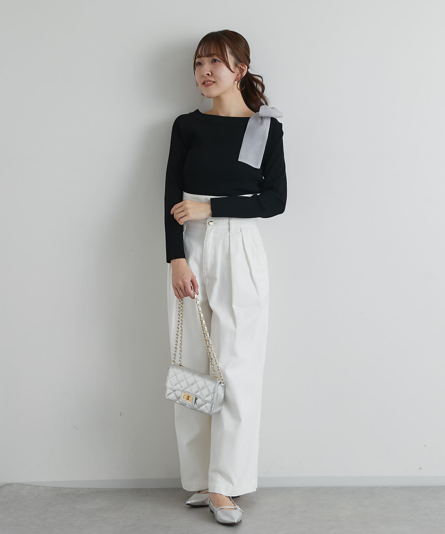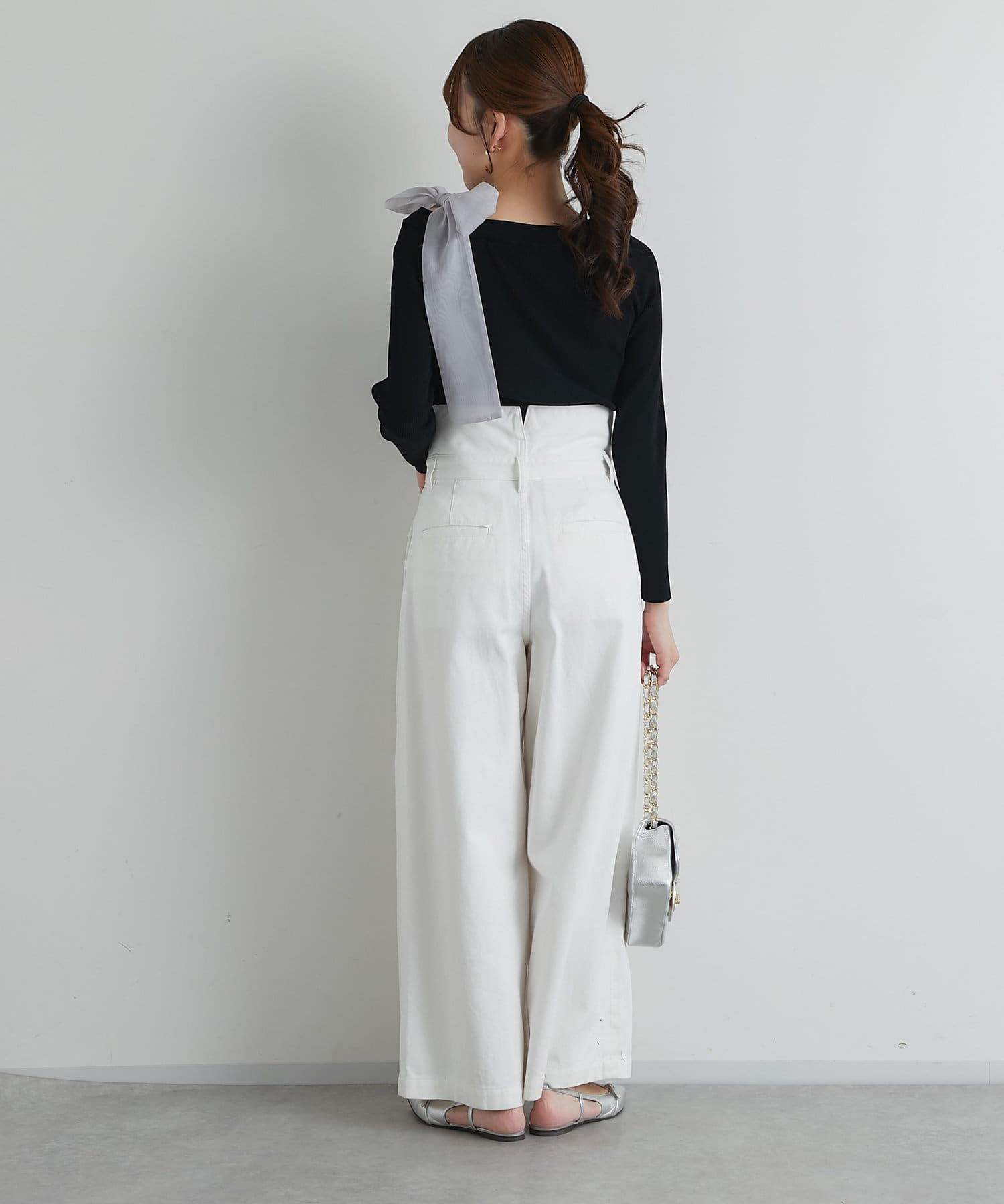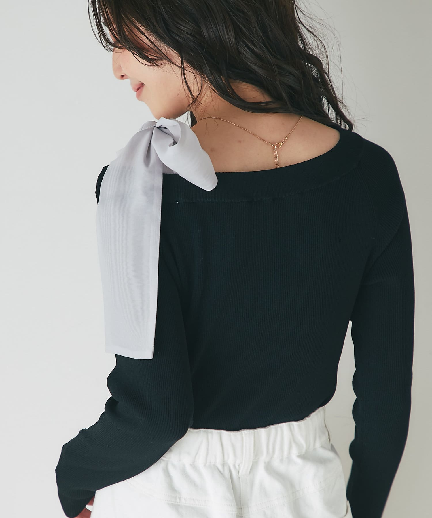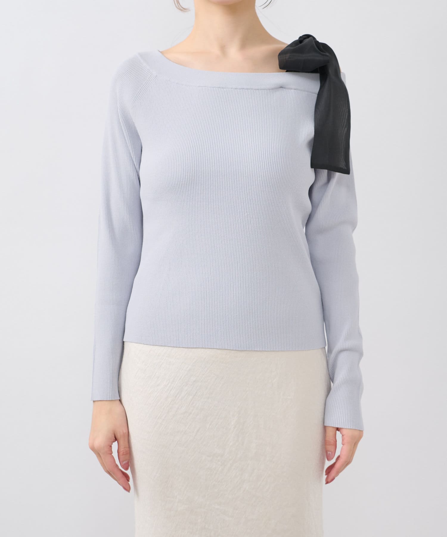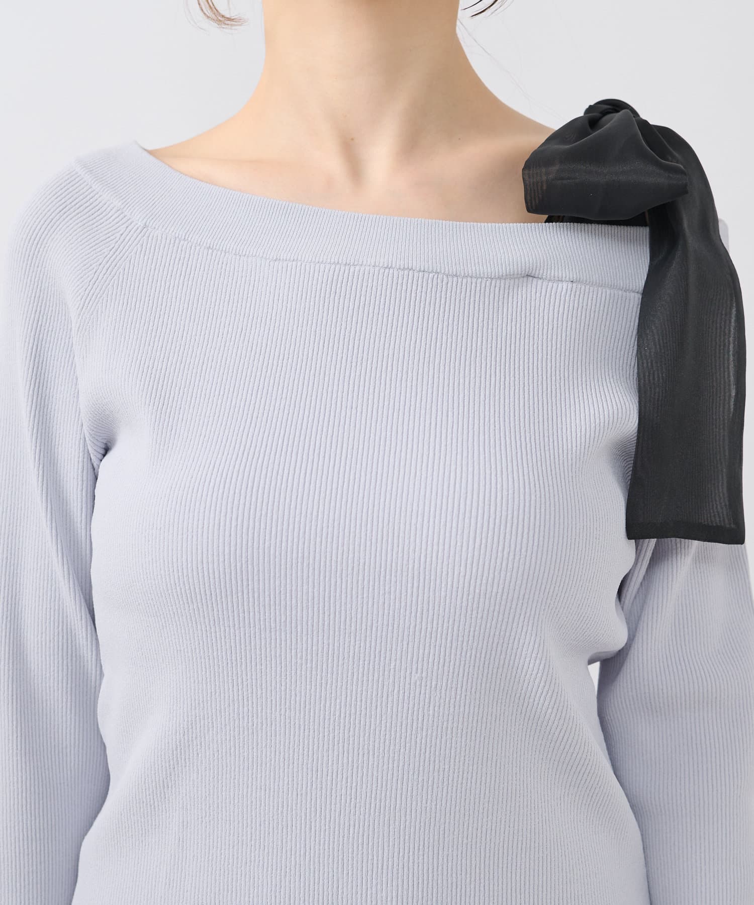 リボンが主役のオフショルリブニット