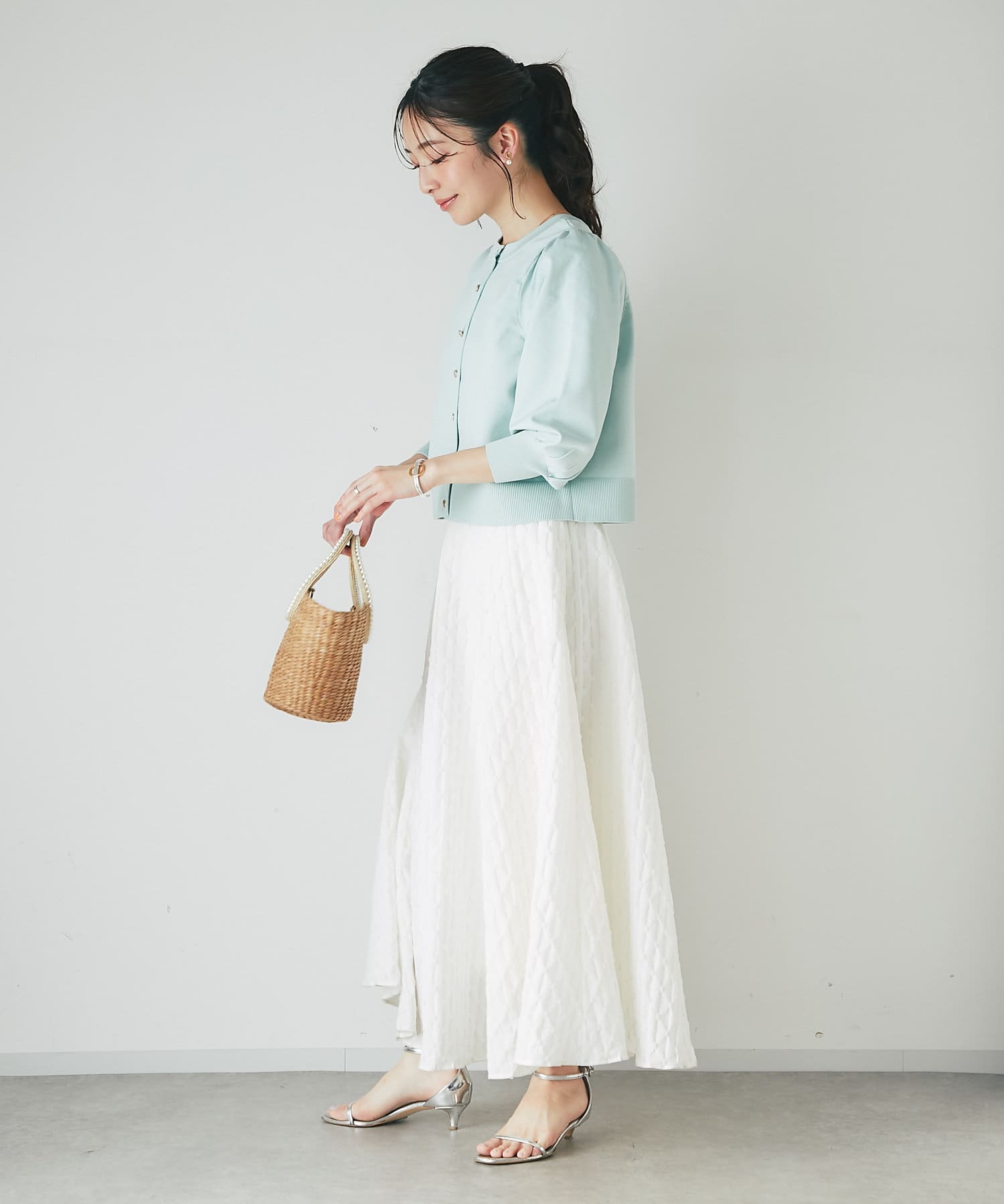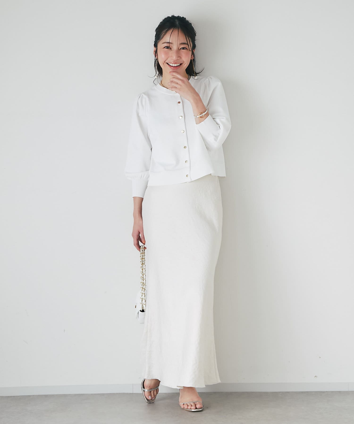 骨格ナチュラルなので肩の骨がしっかりめなのですが、このカーディガンはすごく華奢見えして着用できます。インして着るのが苦手なのでクロップド丈なのも嬉しいし、手首出したい派なので袖の長さが短めなのも良いです。ホワイトは黄みの全く無い真っ白な色味です。