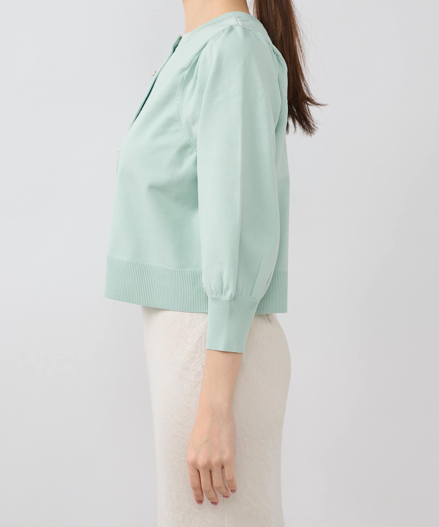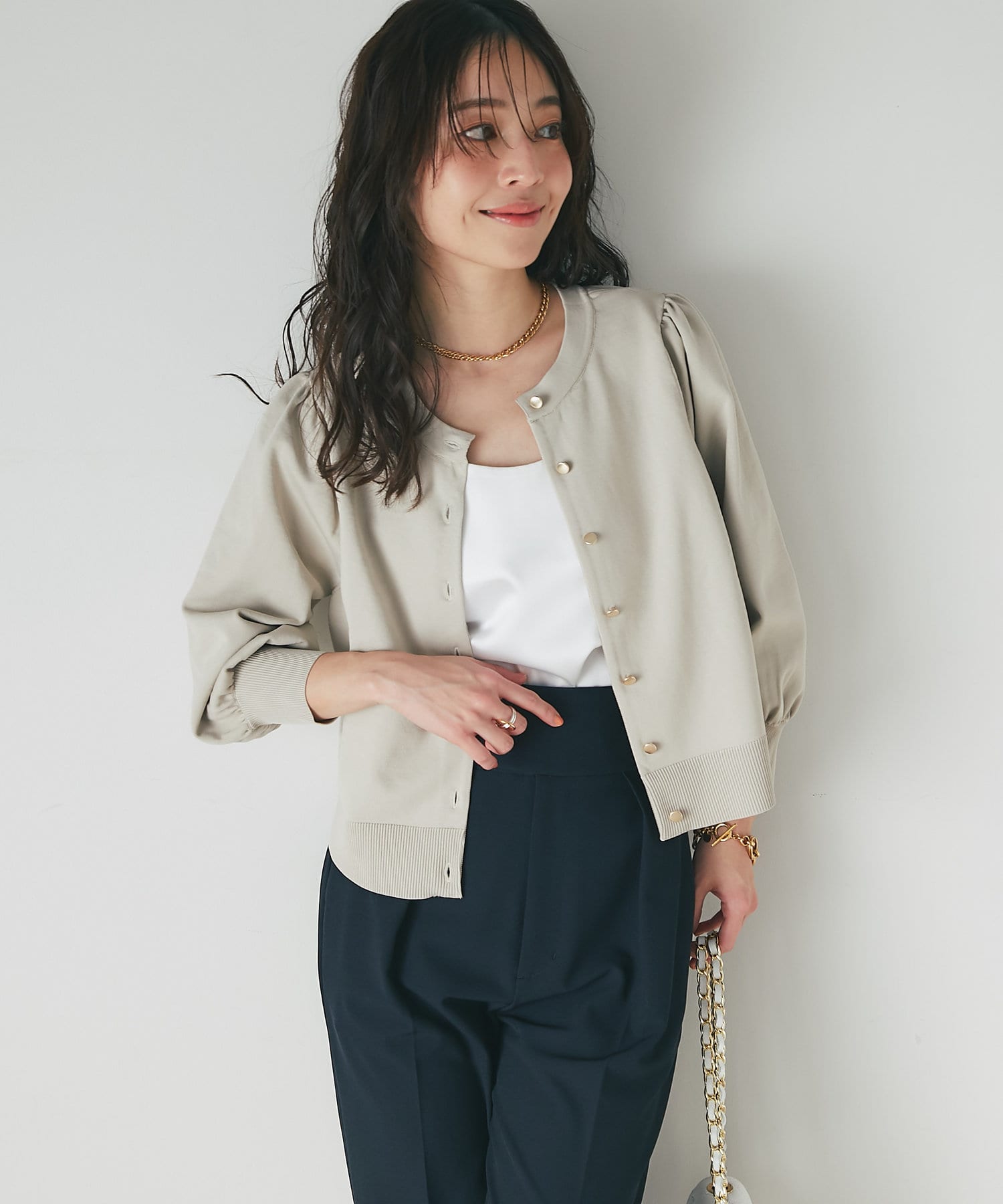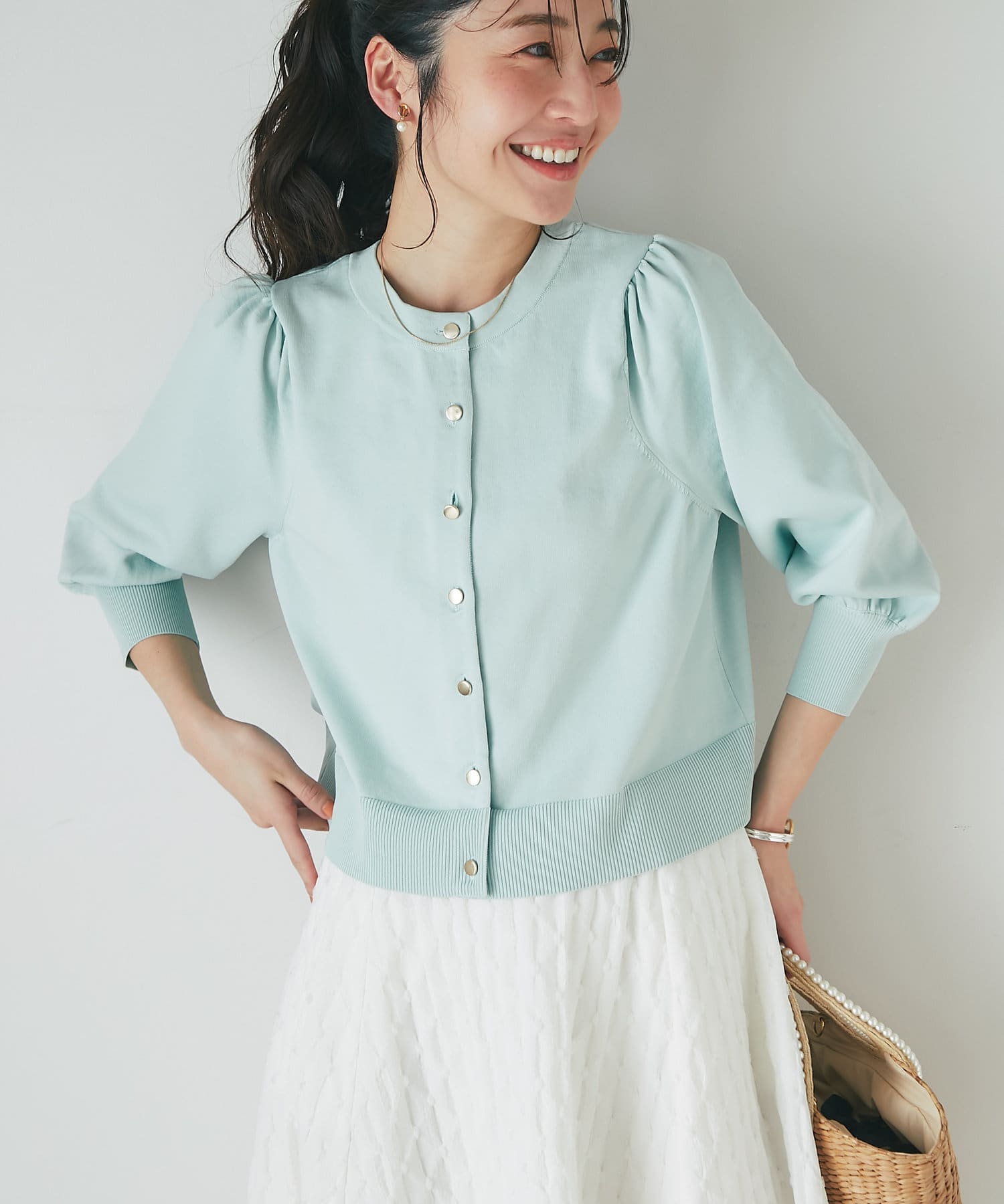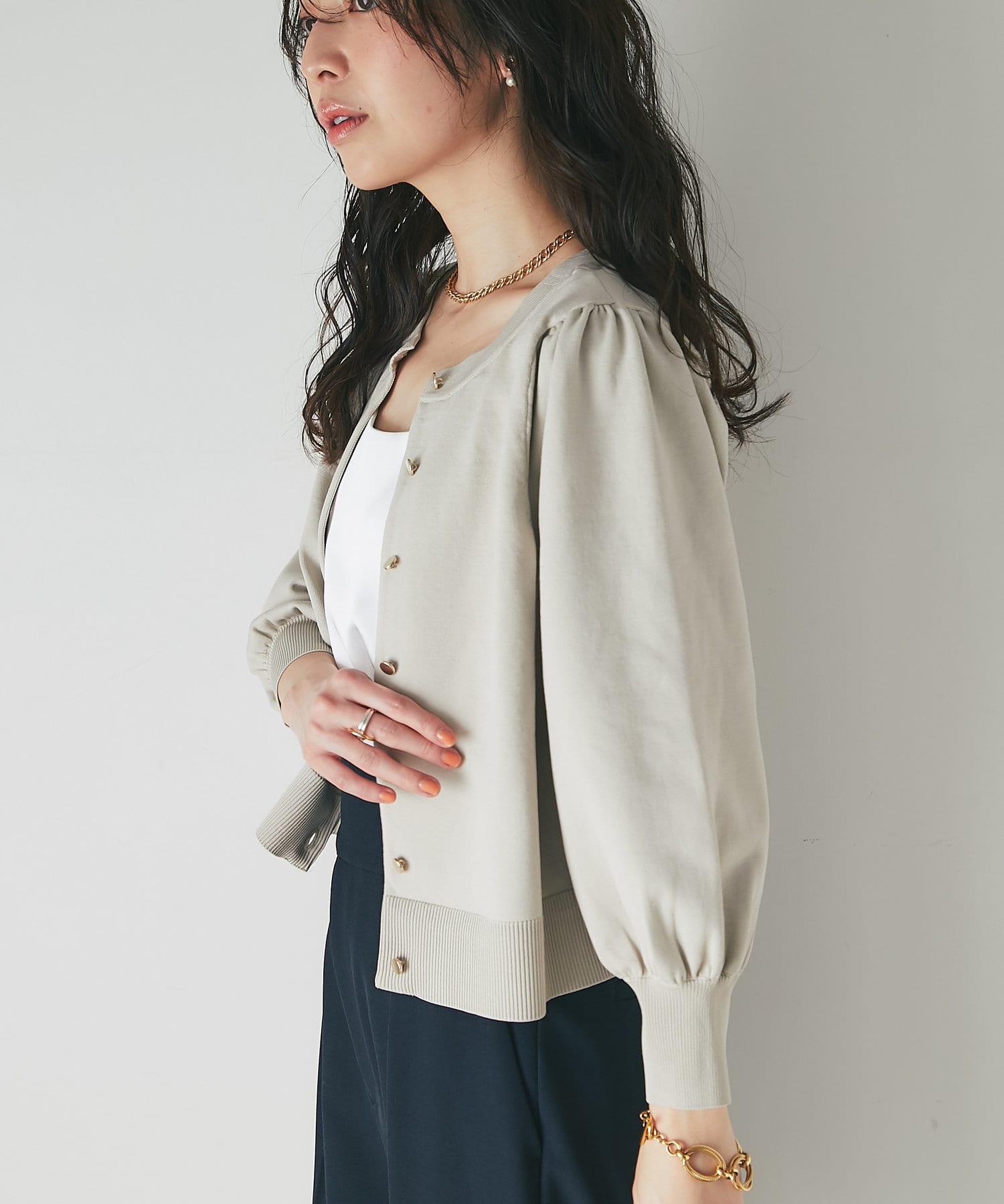ボリュームスリーブが大人可愛いコンパクトなカーディガン。
