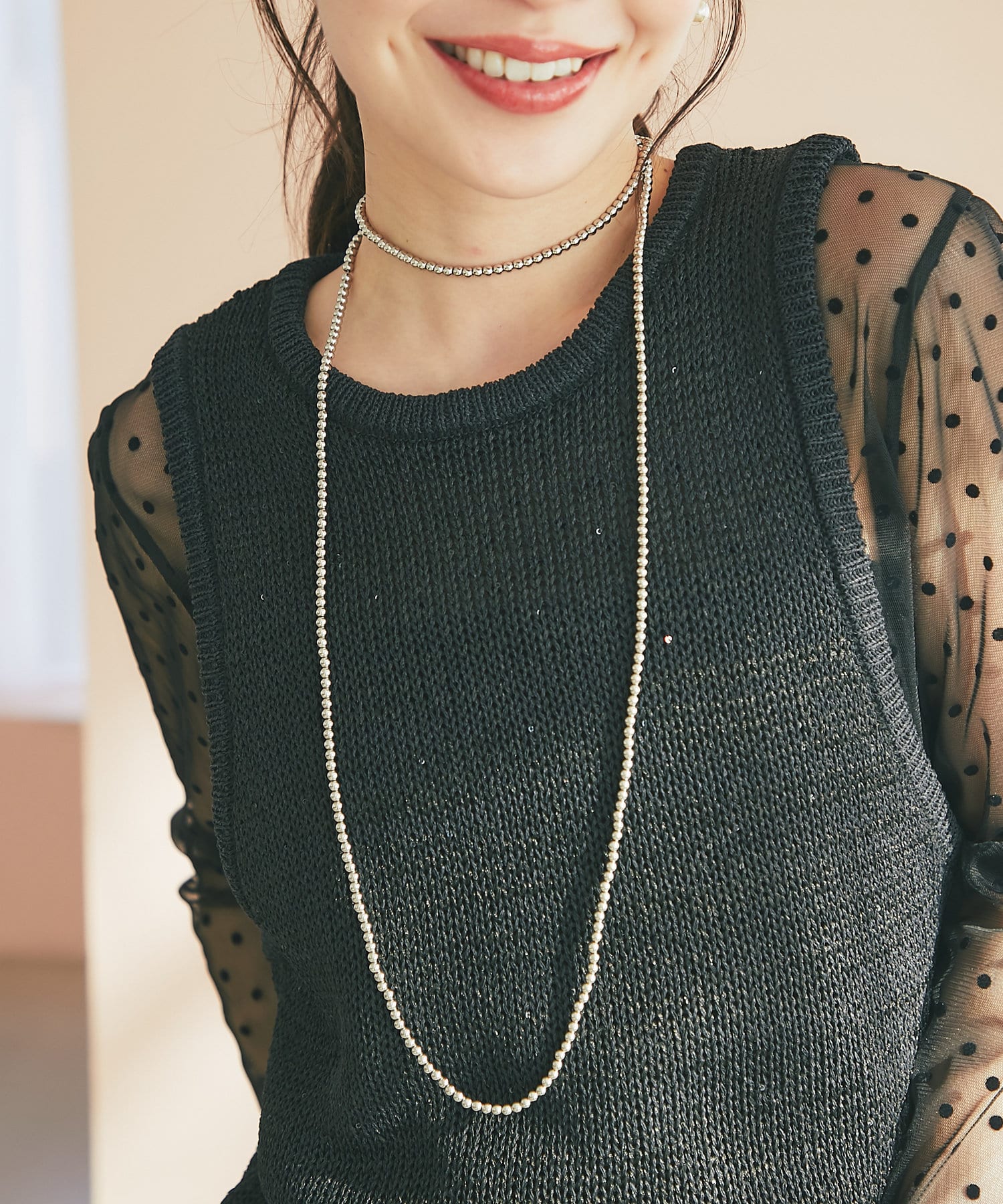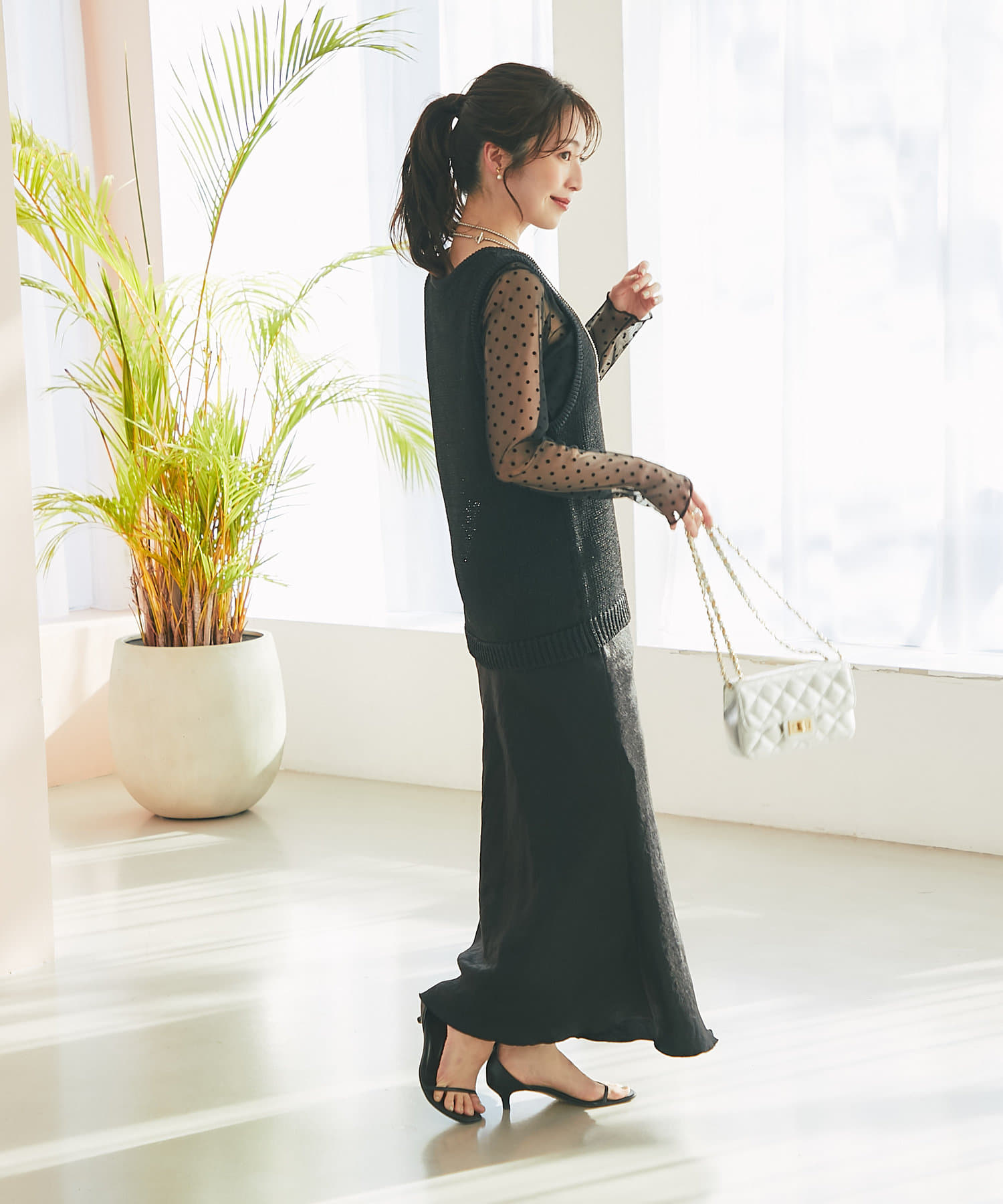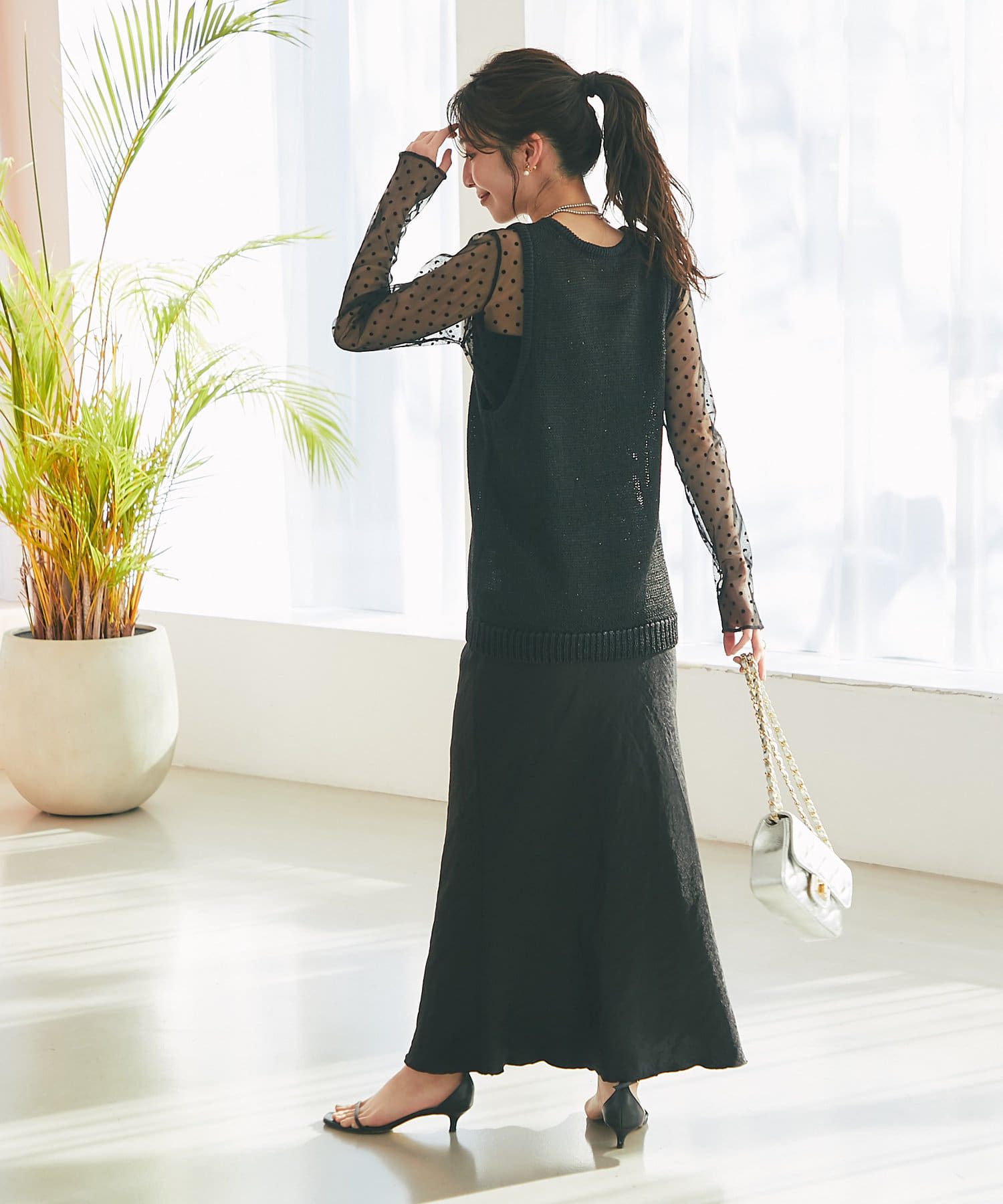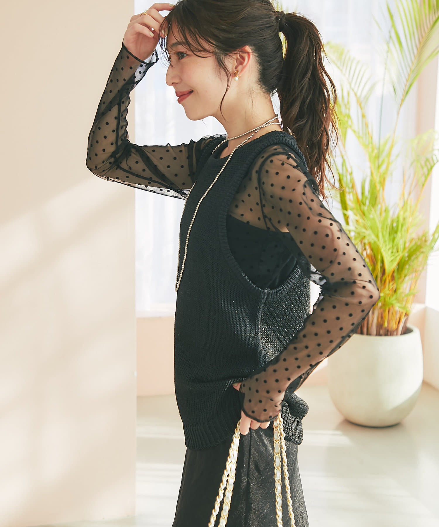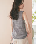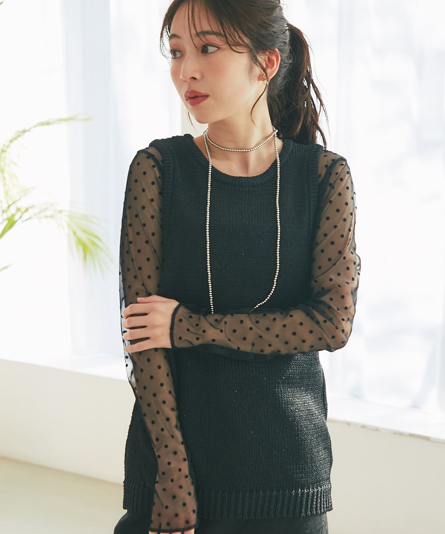スパンコールのきらめきが目を惹くノースリーブニット。