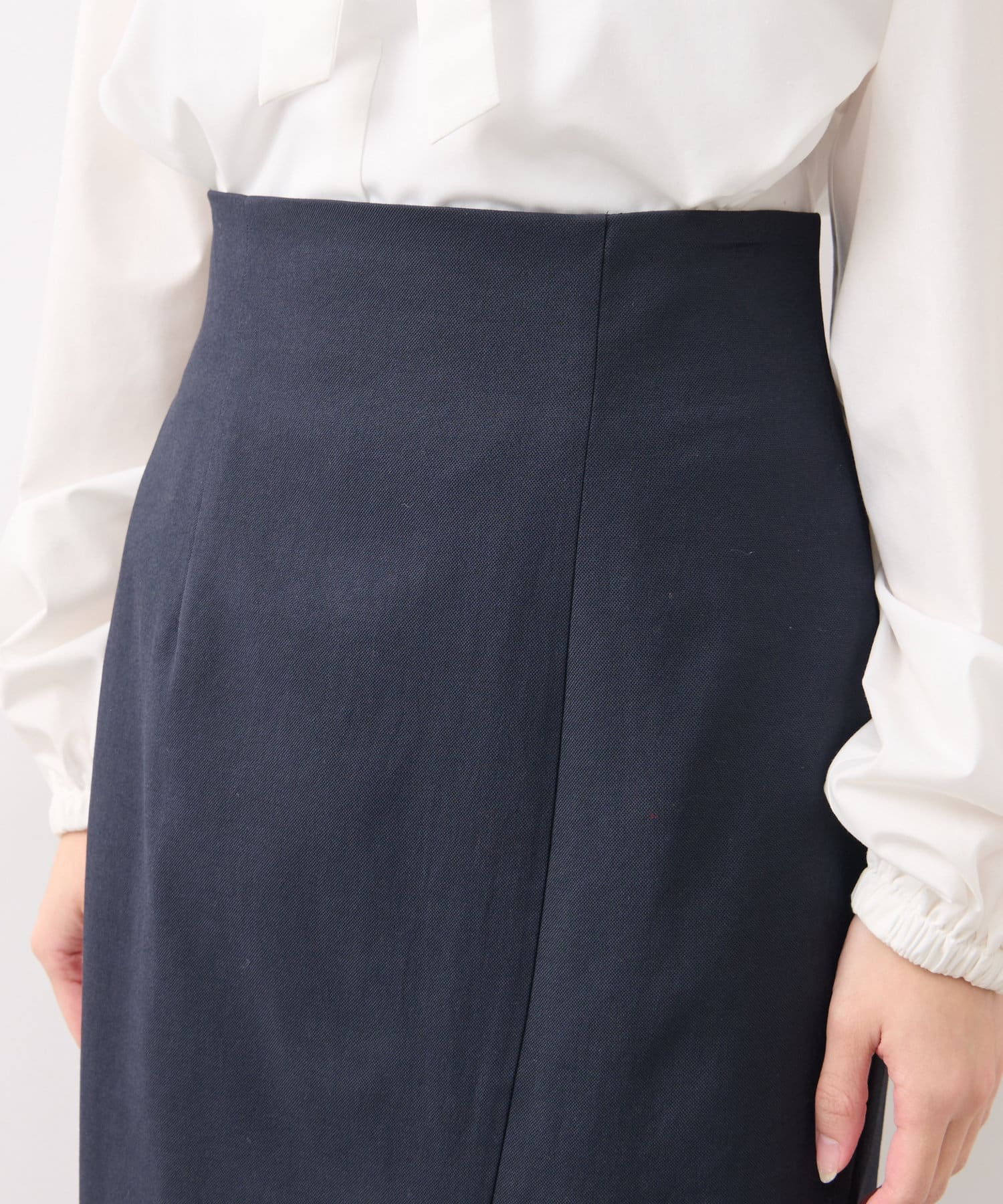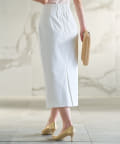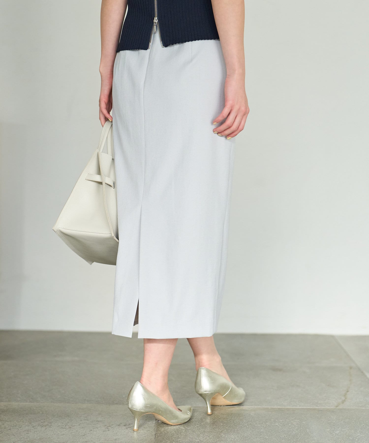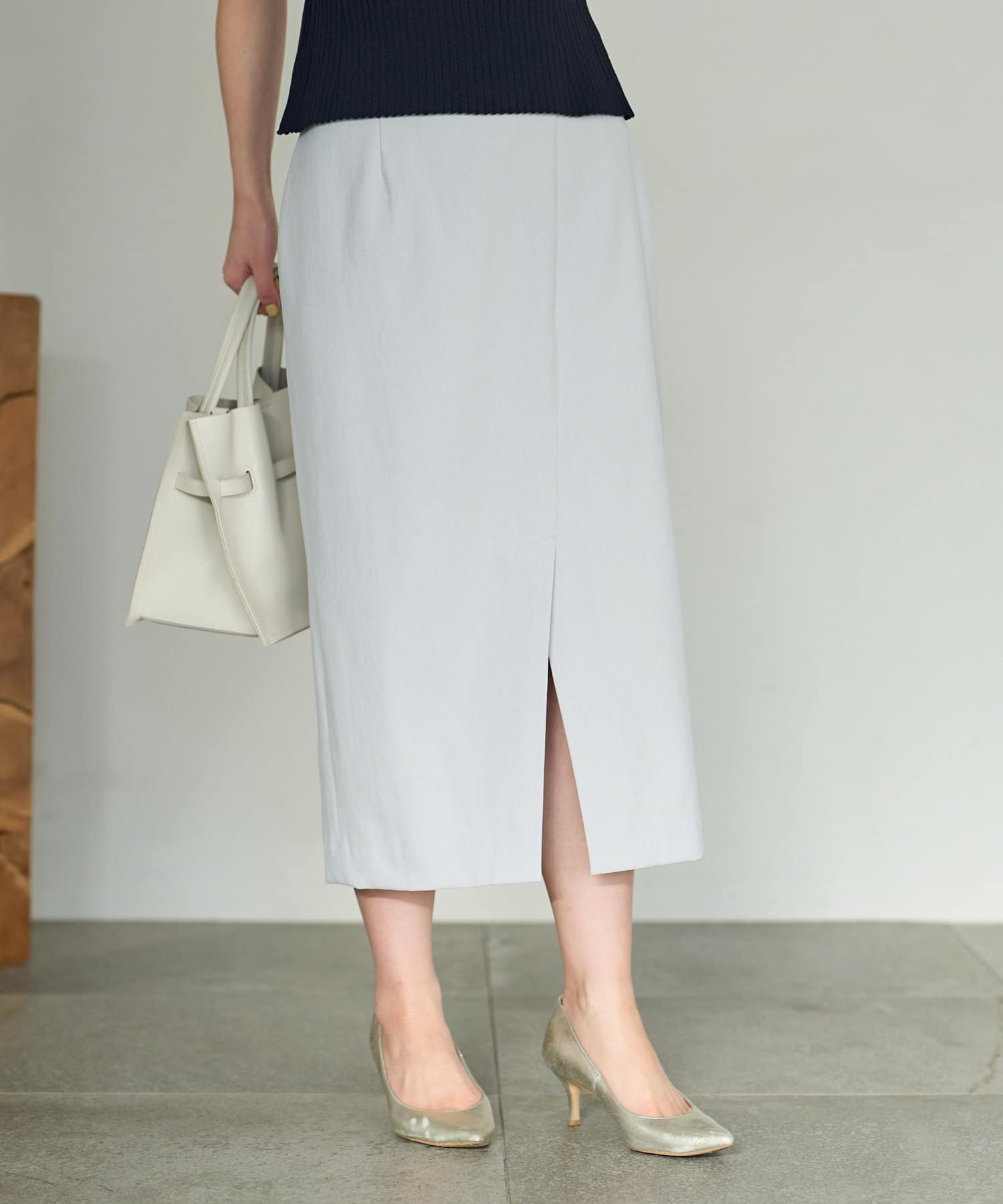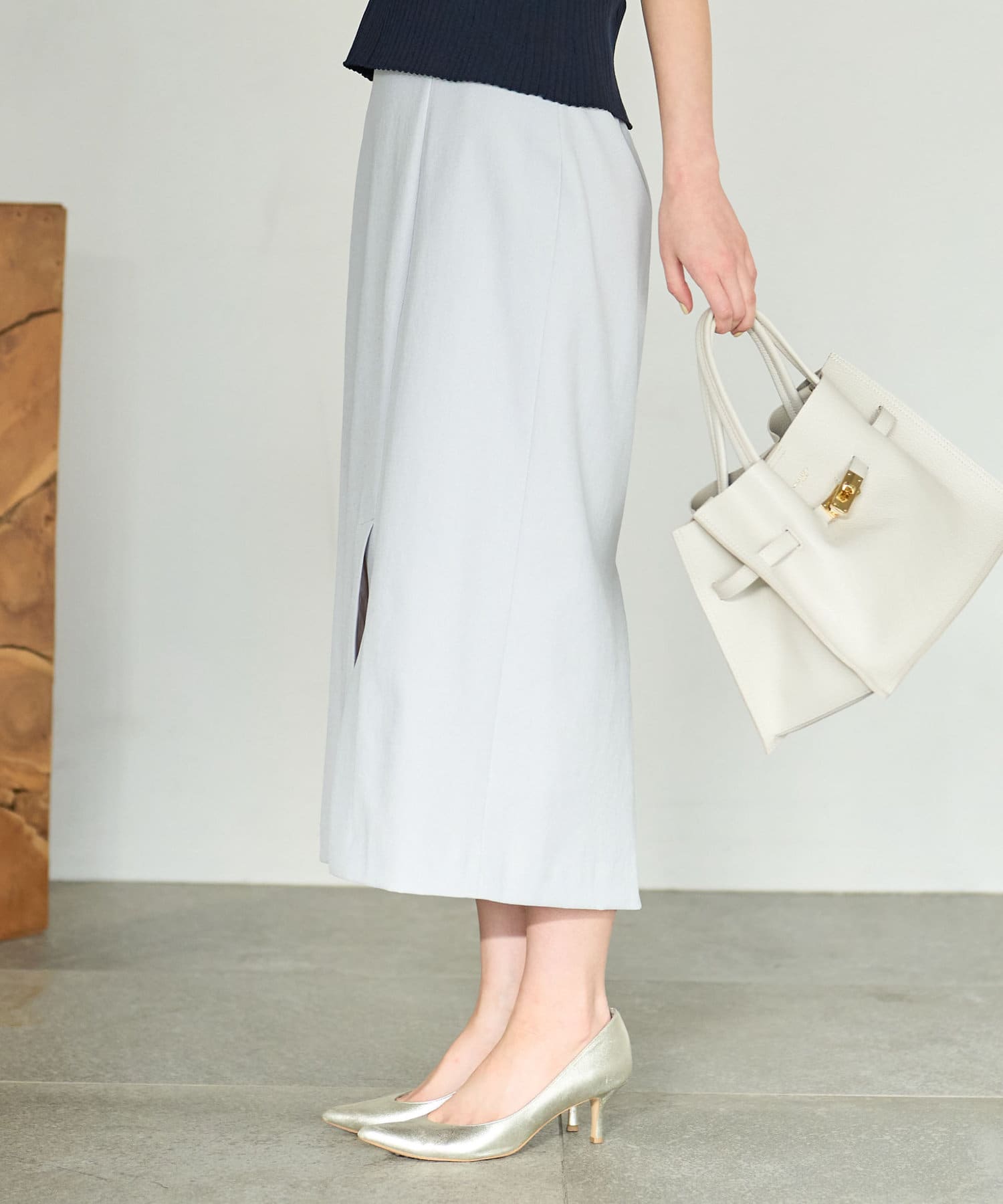 身体のラインを拾いすぎず、細見えするナロースカート。