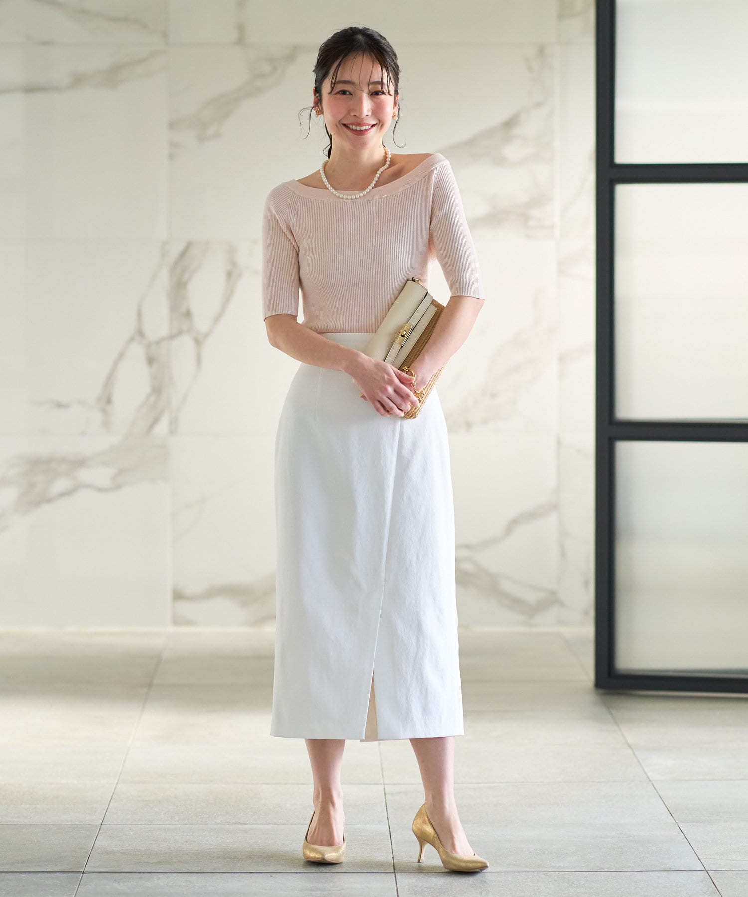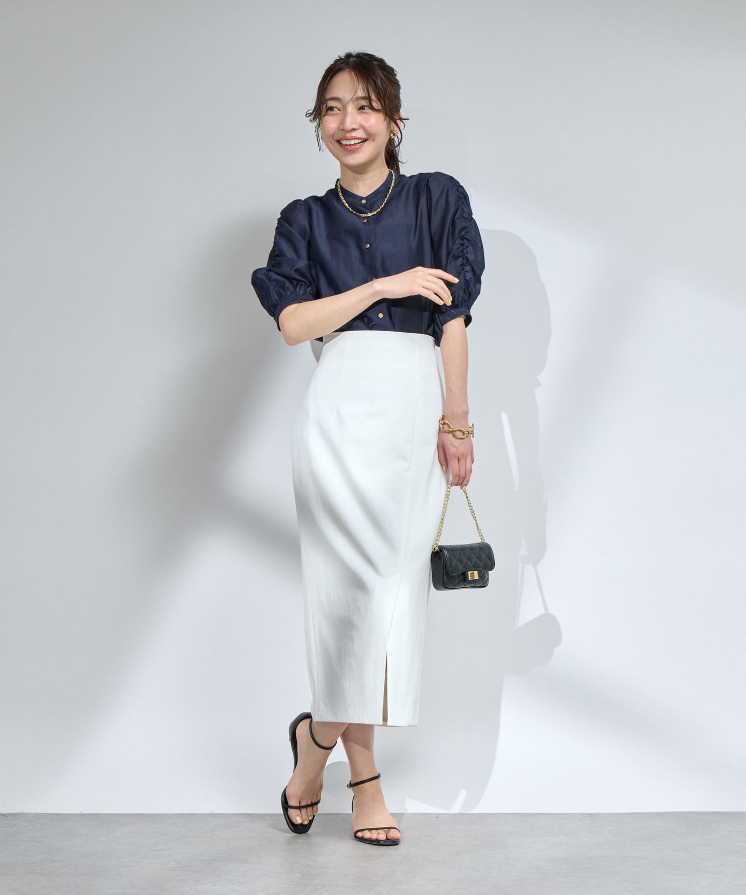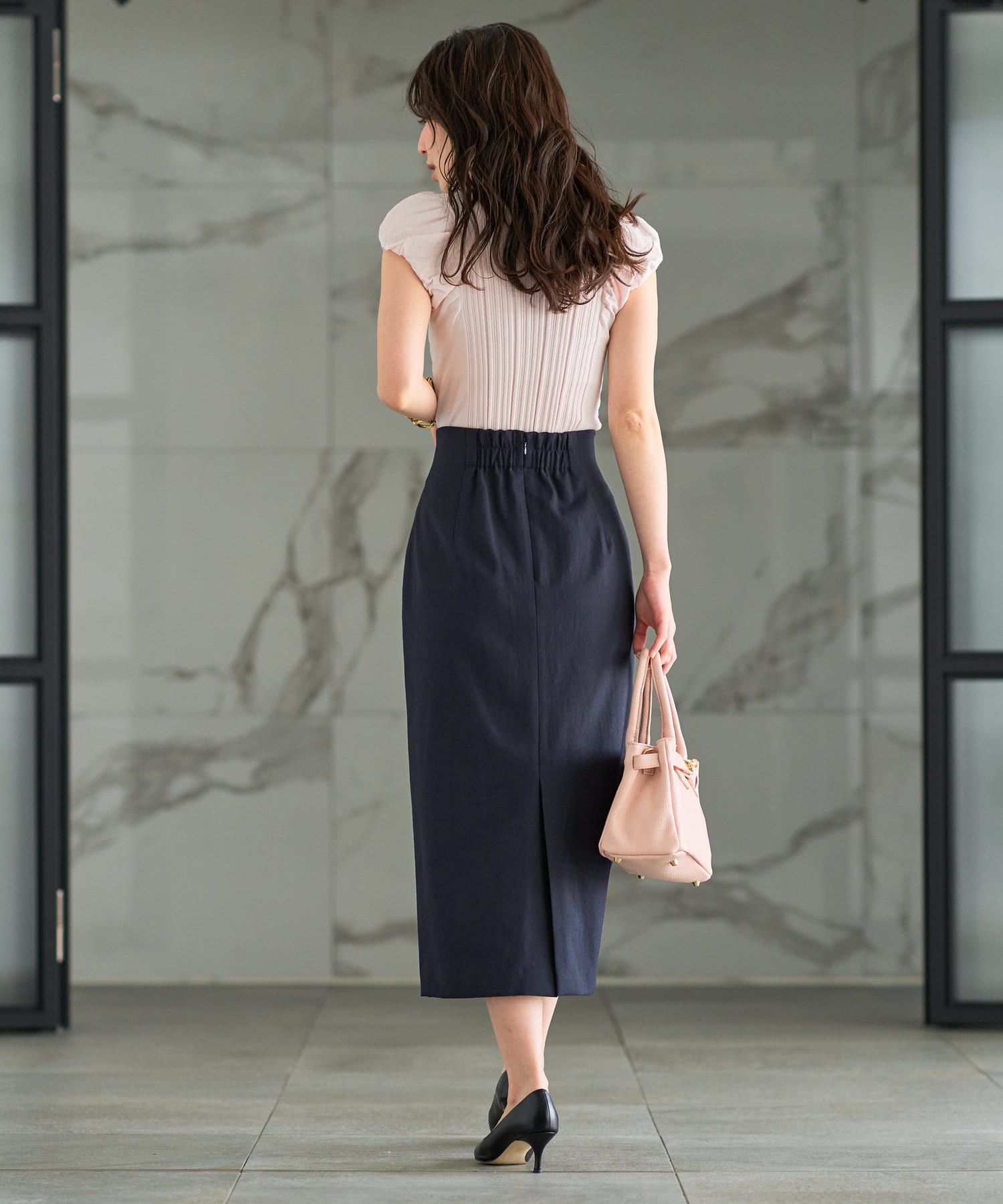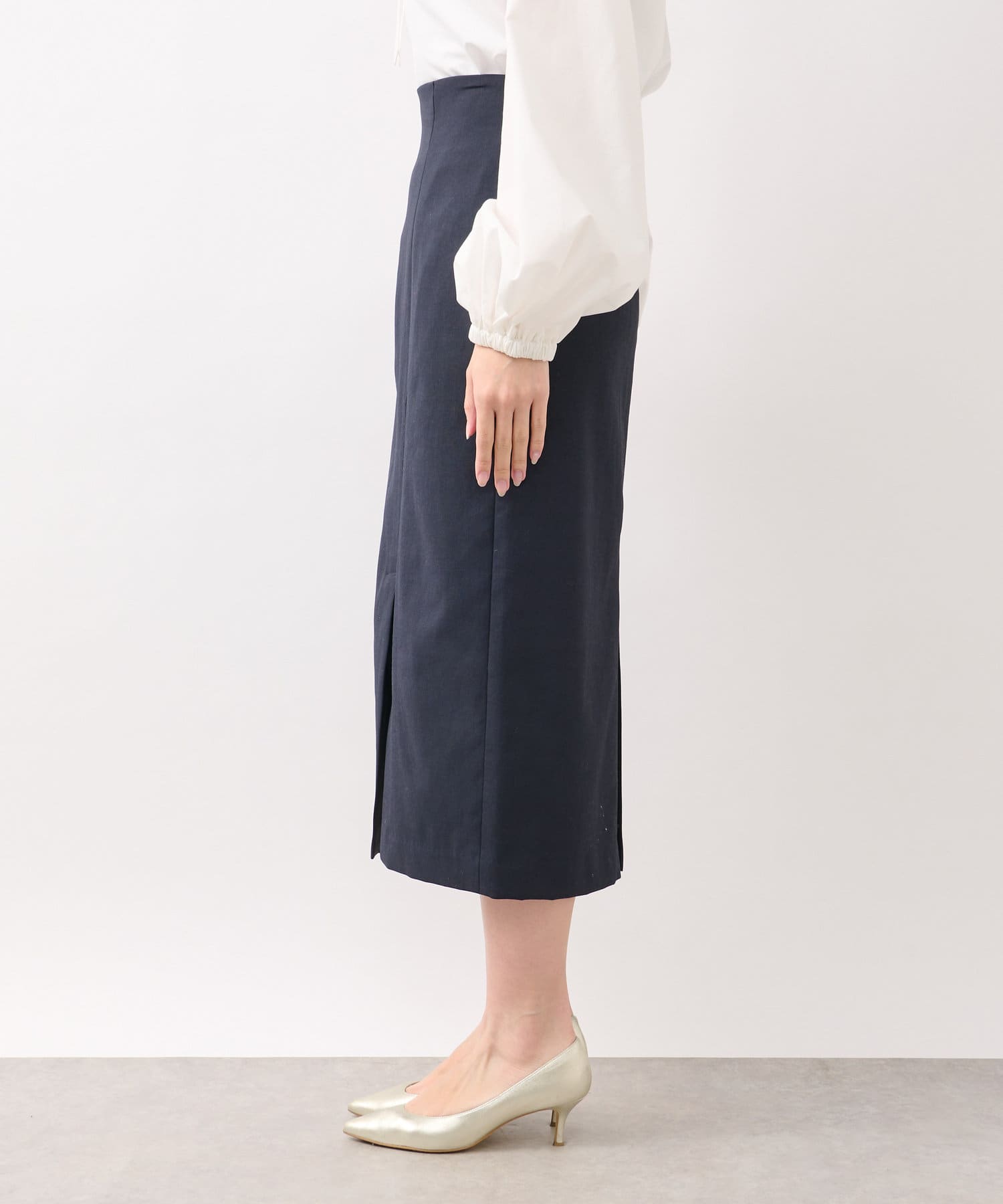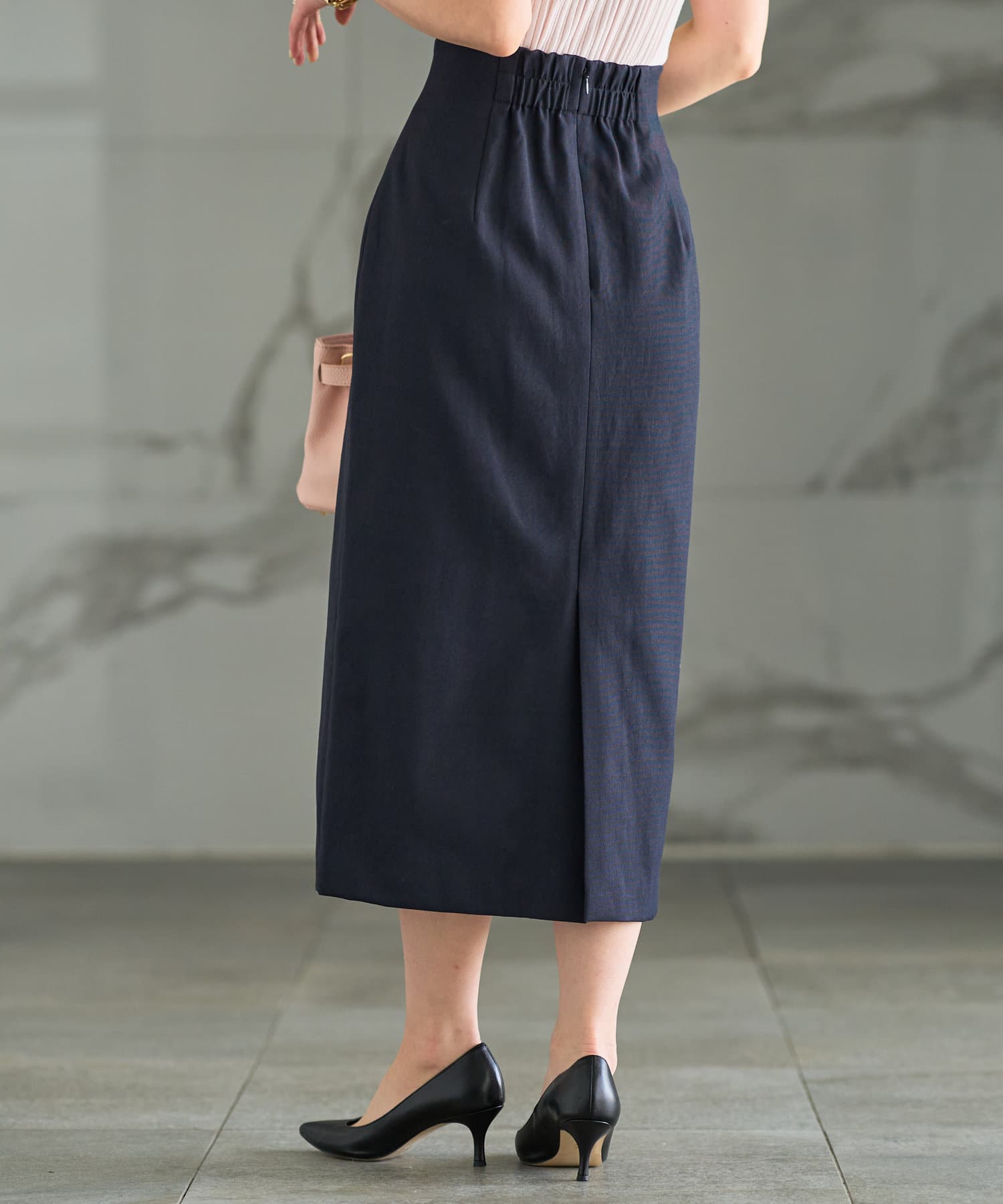 身体のラインを拾いすぎず、細見えするナロースカート。
