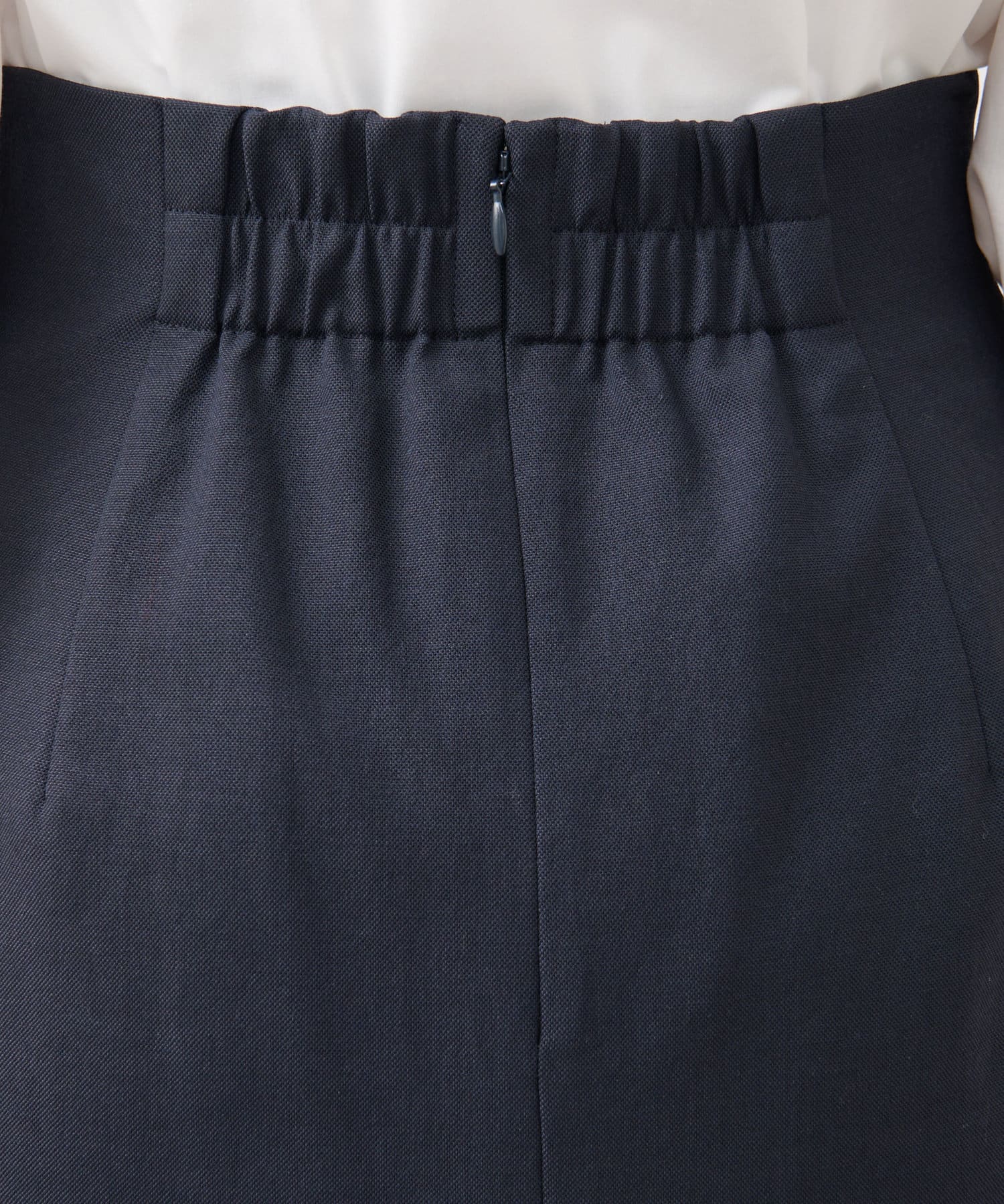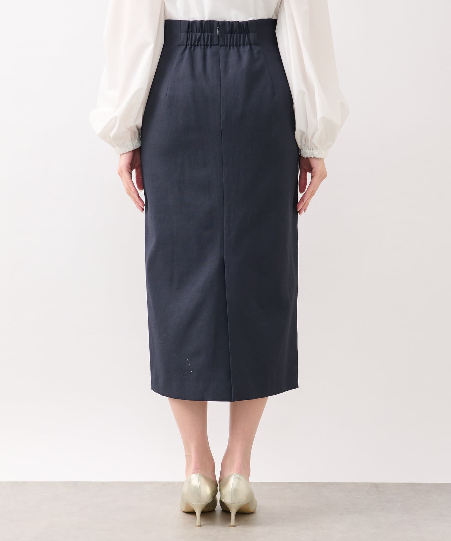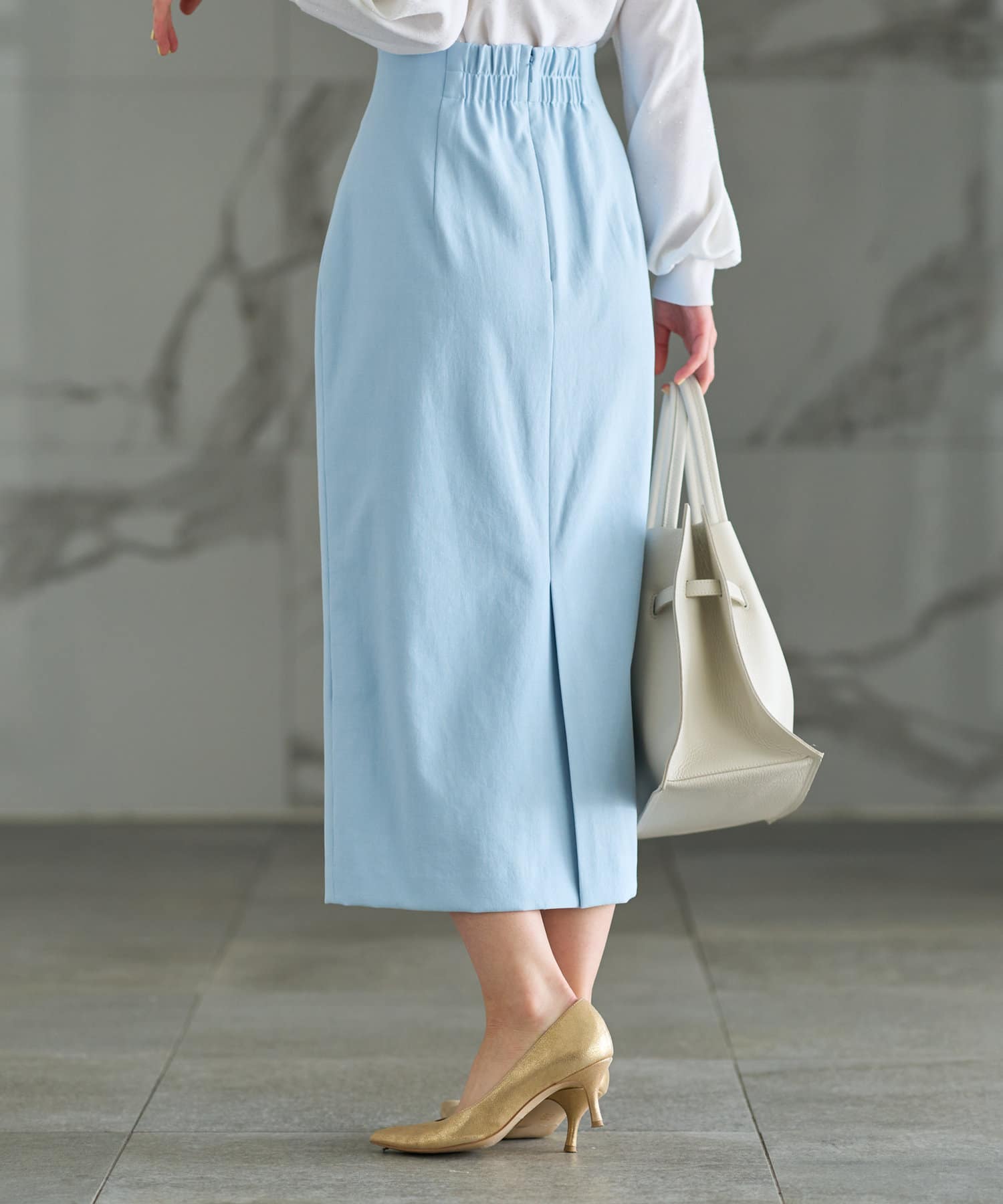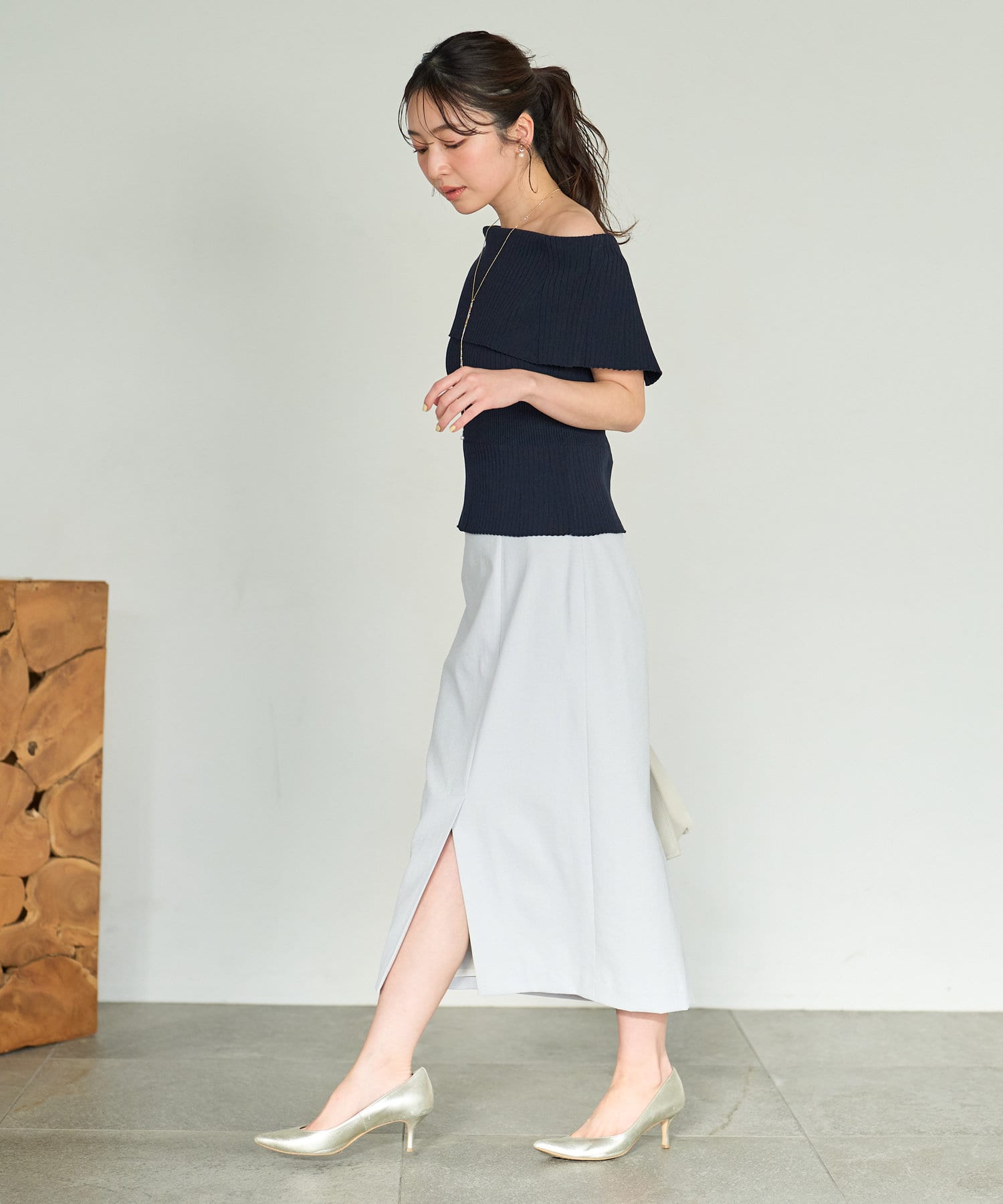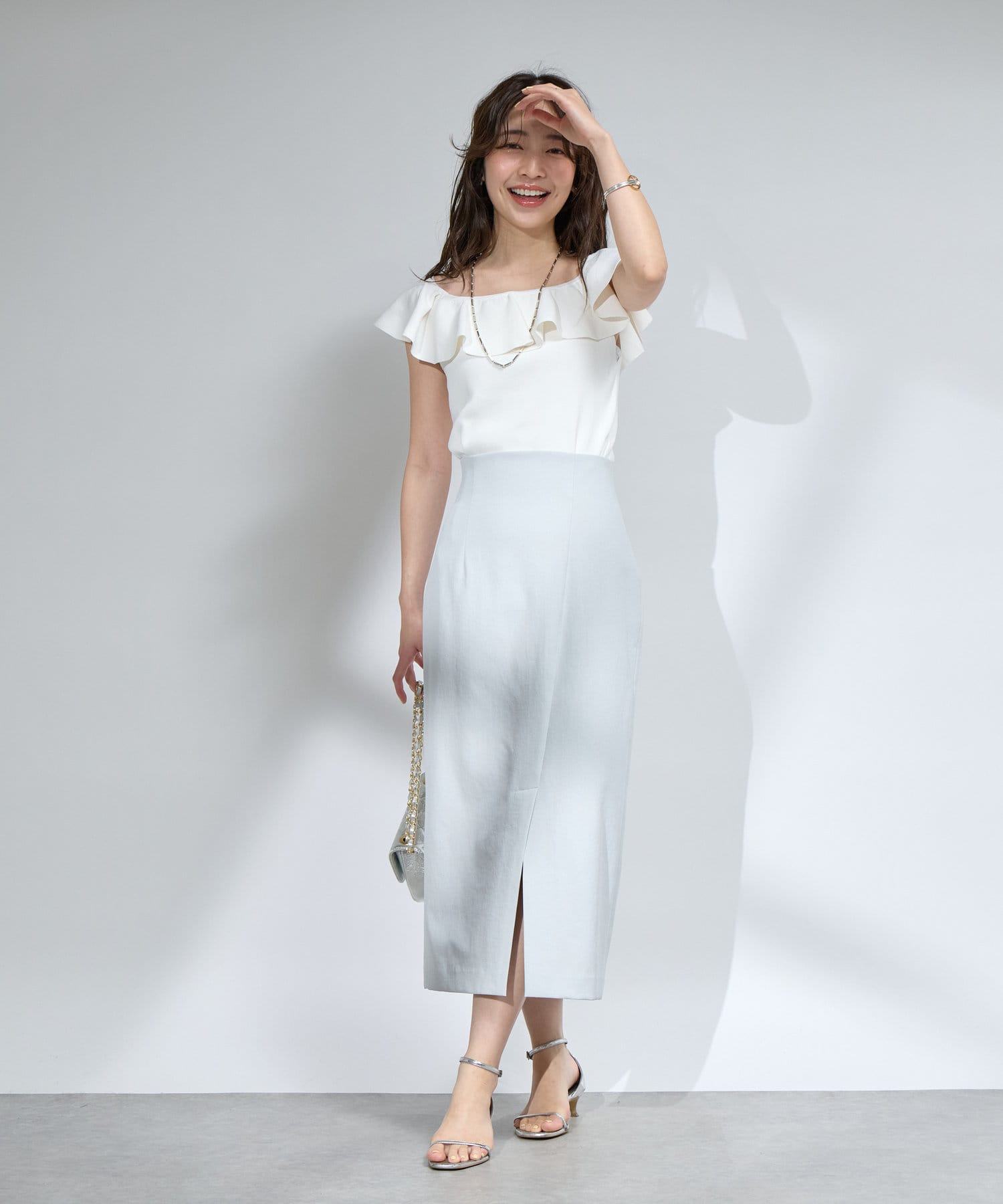 身体のラインを拾いすぎず、細見えするナロースカート。