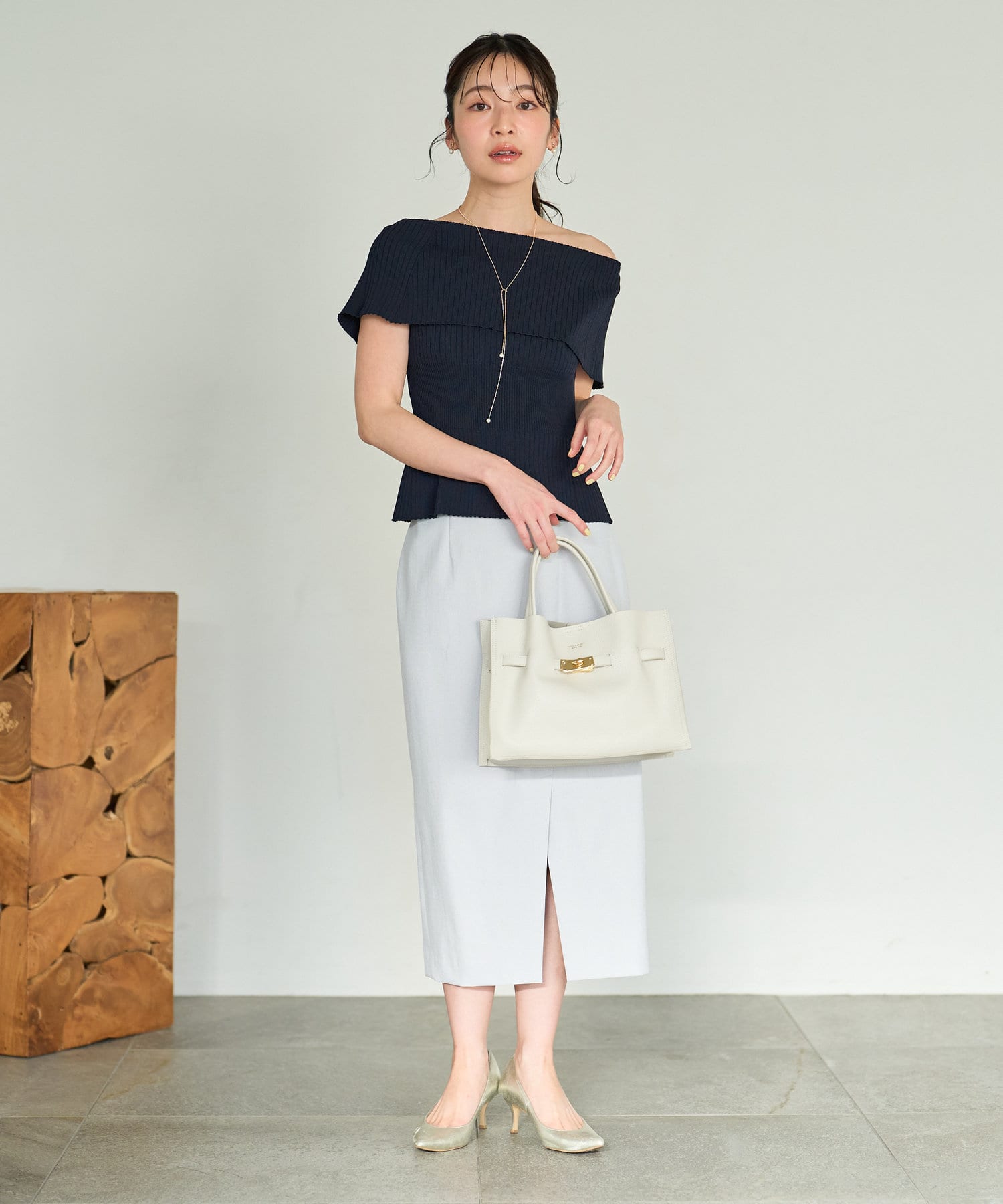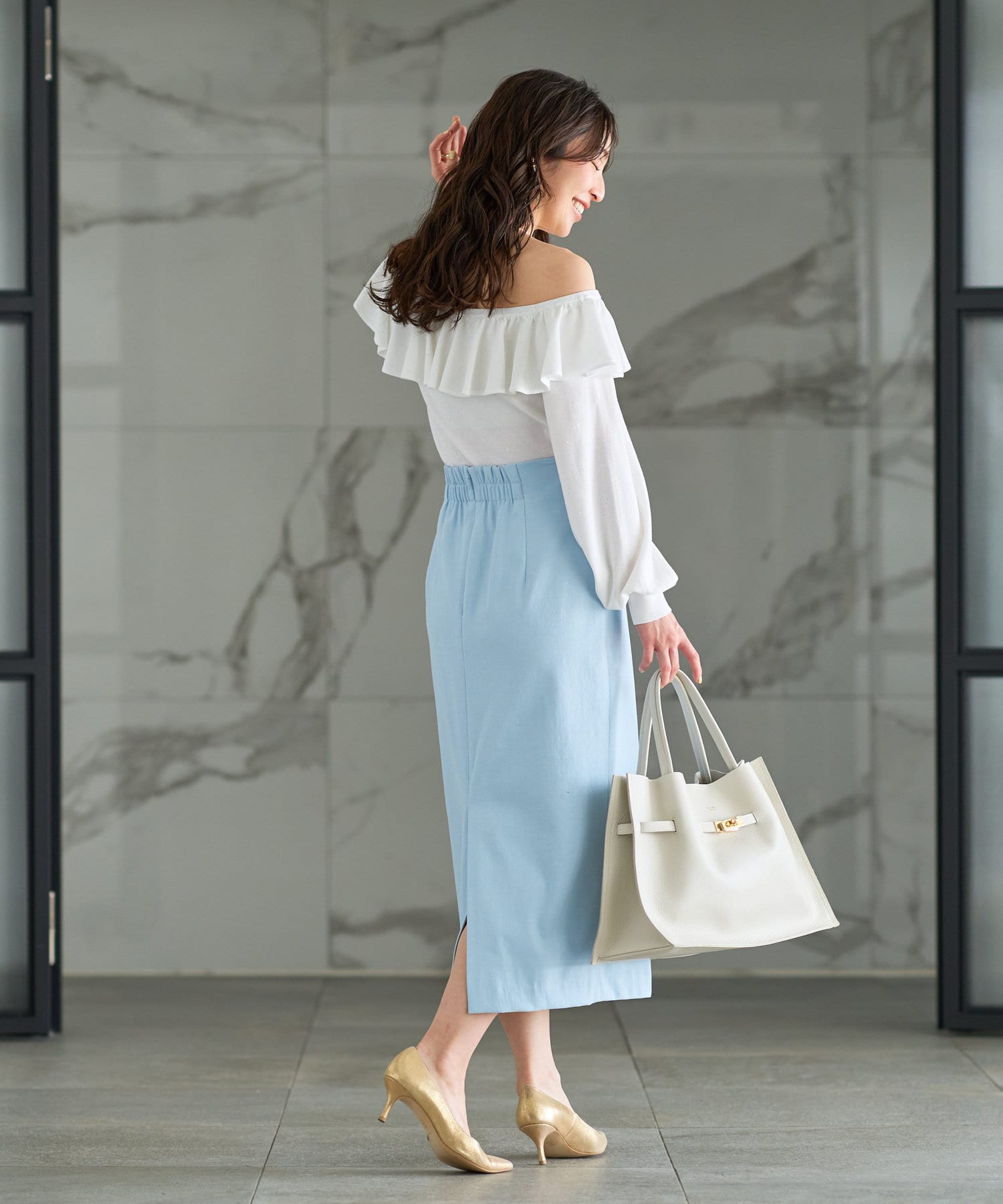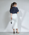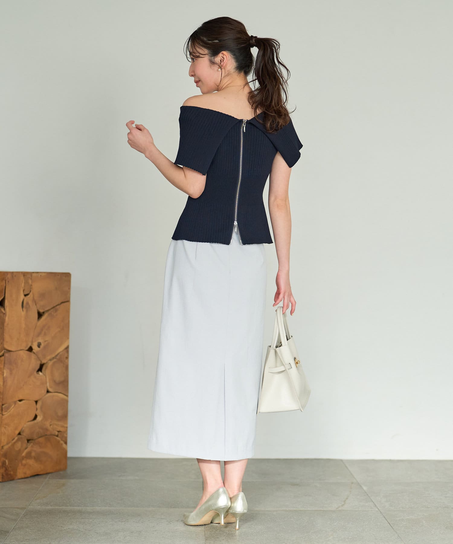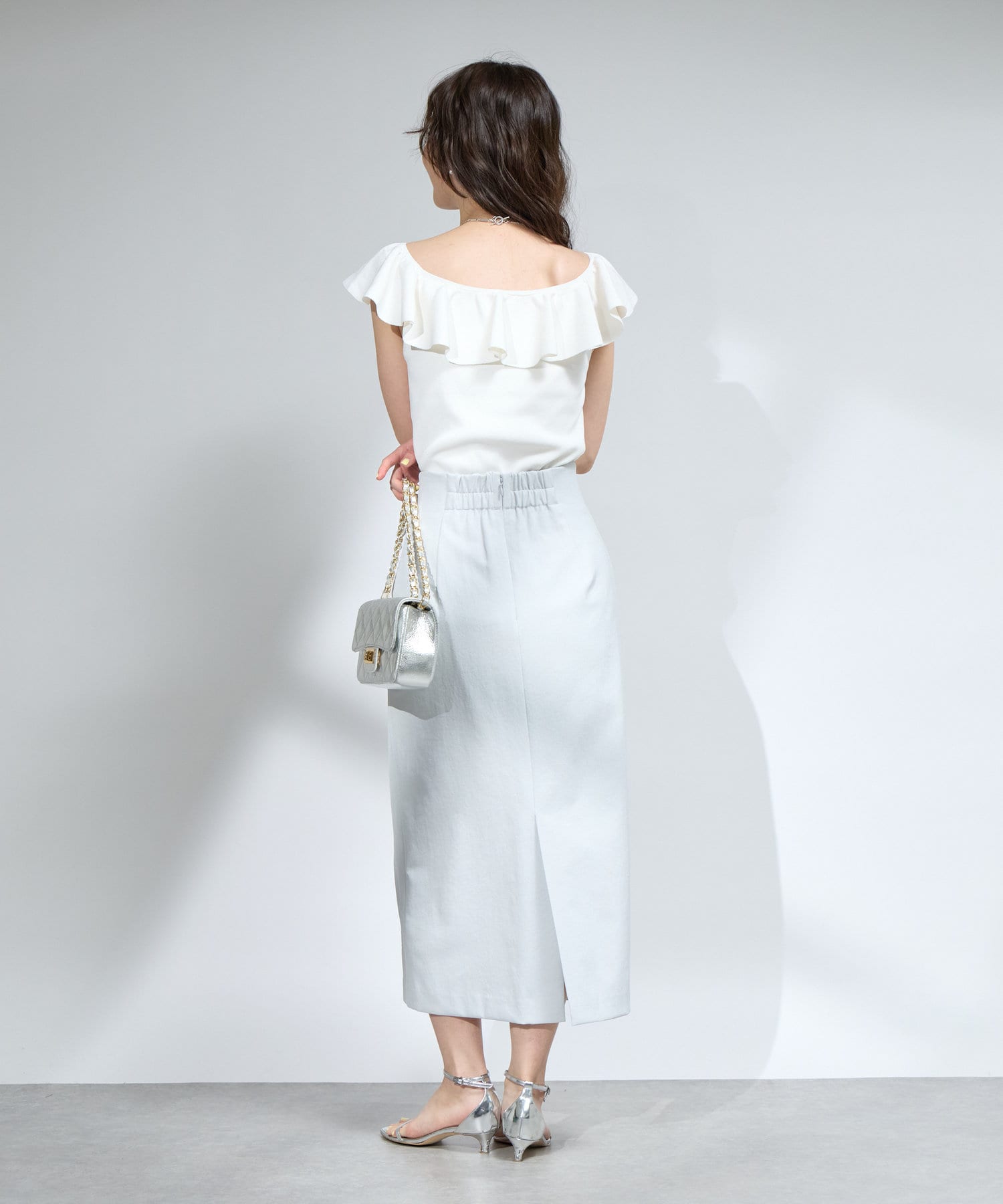 身体のラインを拾いすぎず、細見えするナロースカート。