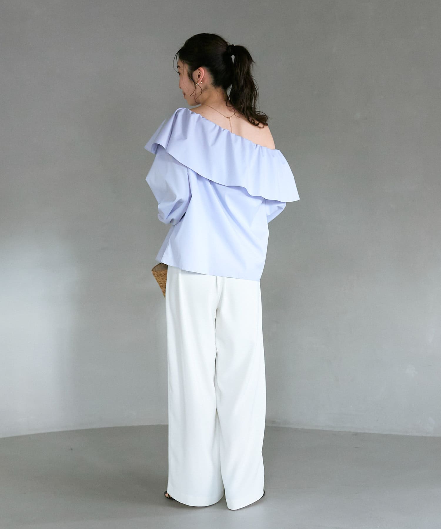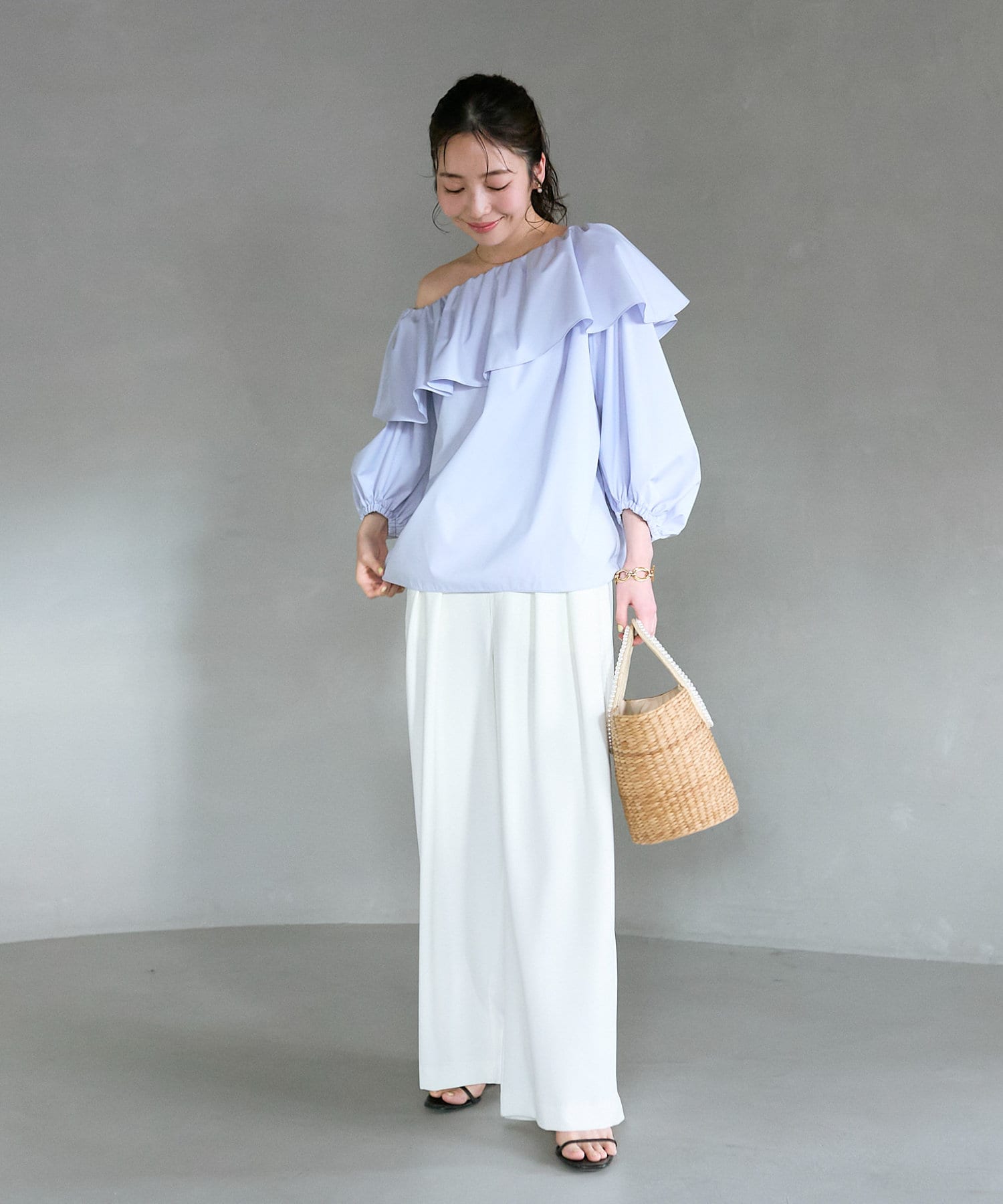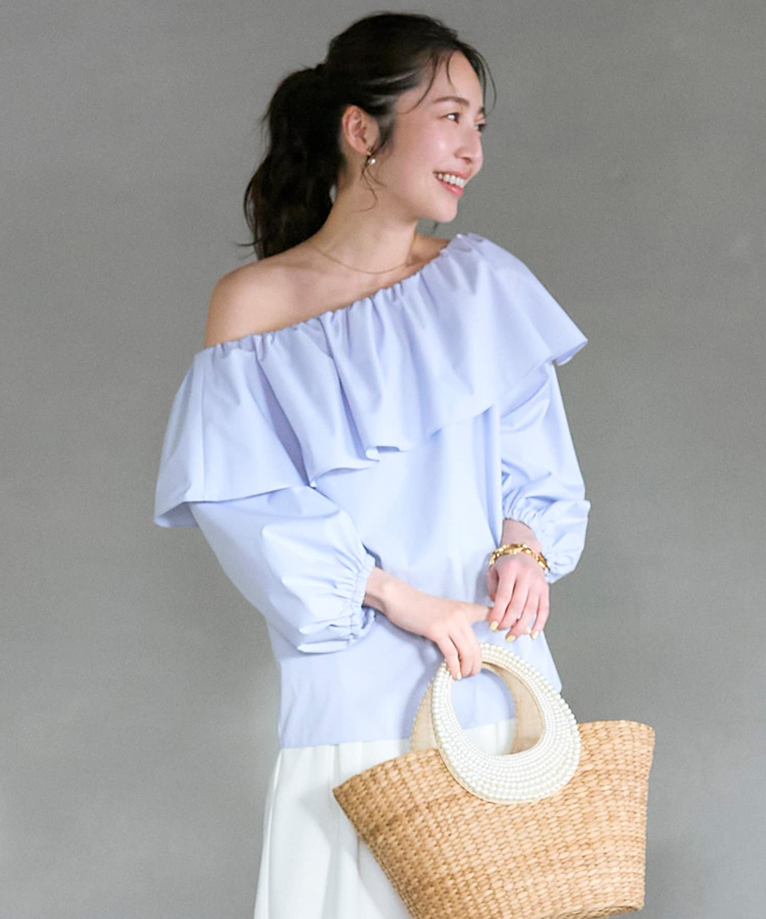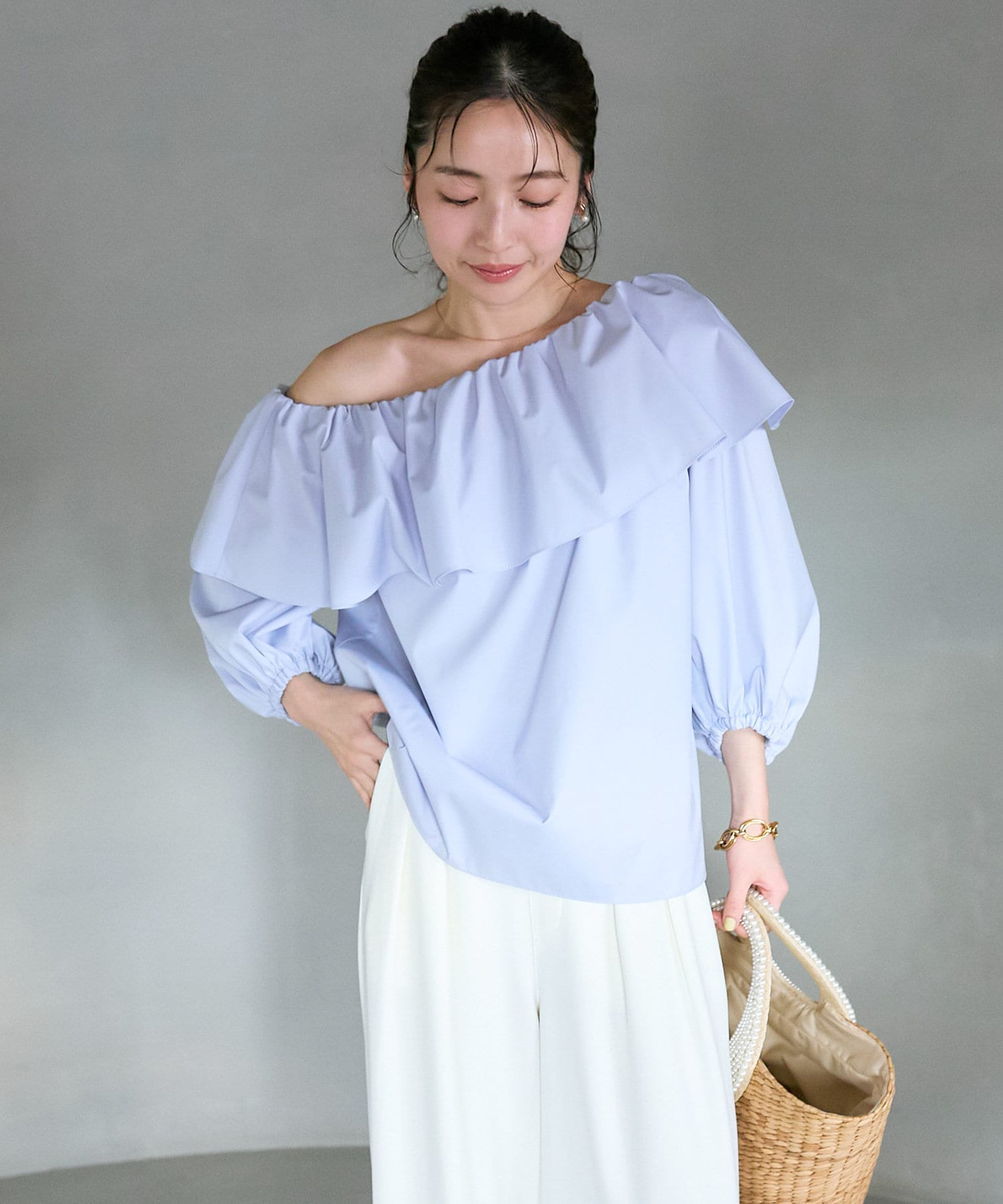 ハリのある生地で仕立てた大胆なラッフルが目を引く華やかワンショルブラウス