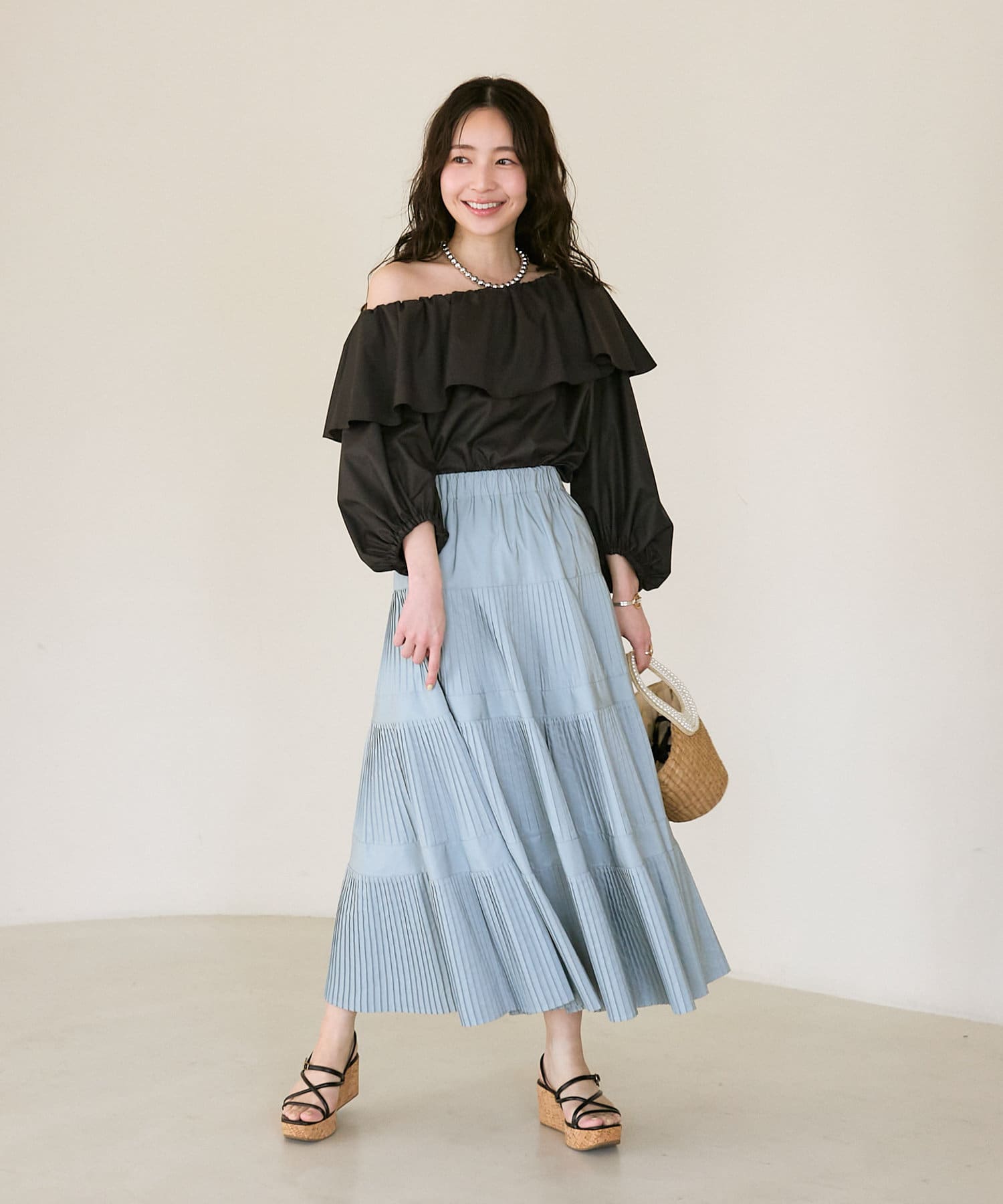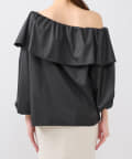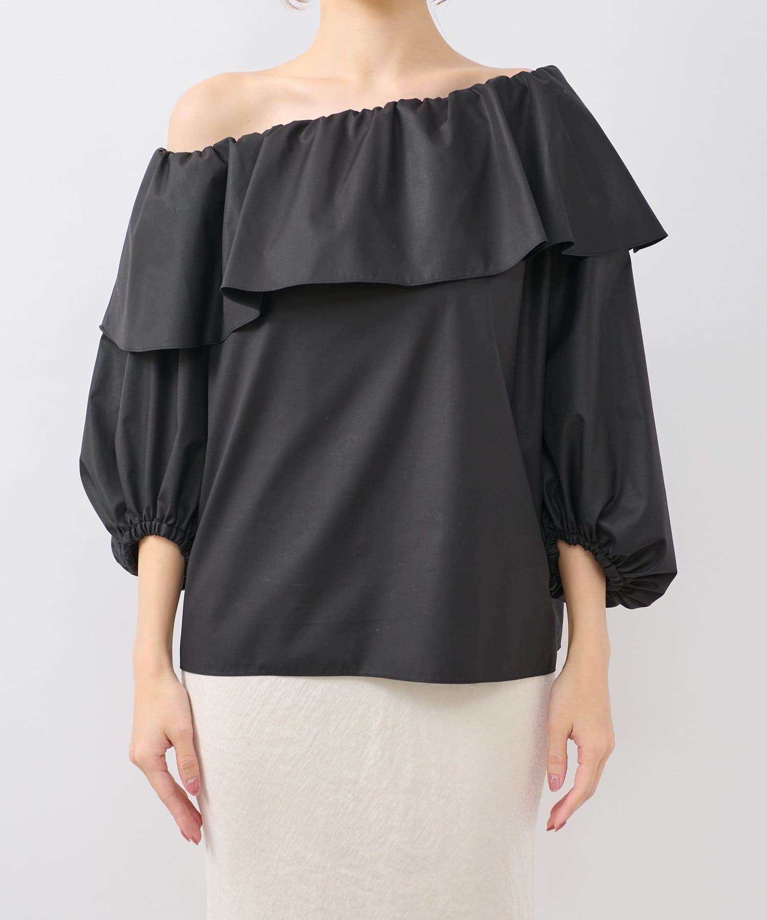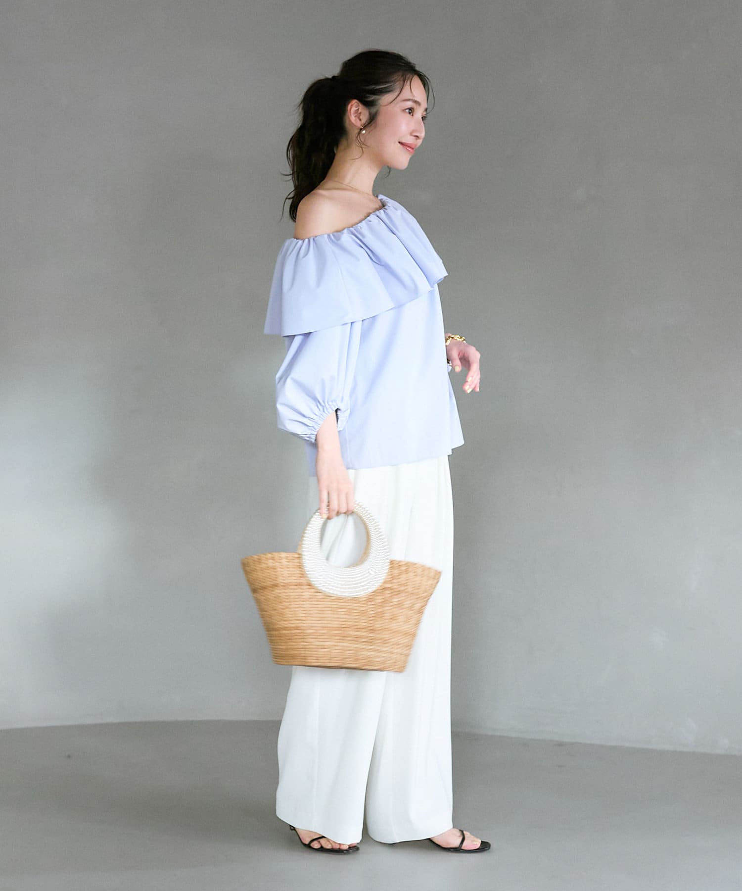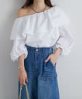 ハリのある生地で仕立てた大胆なラッフルが目を引く華やかワンショルブラウス