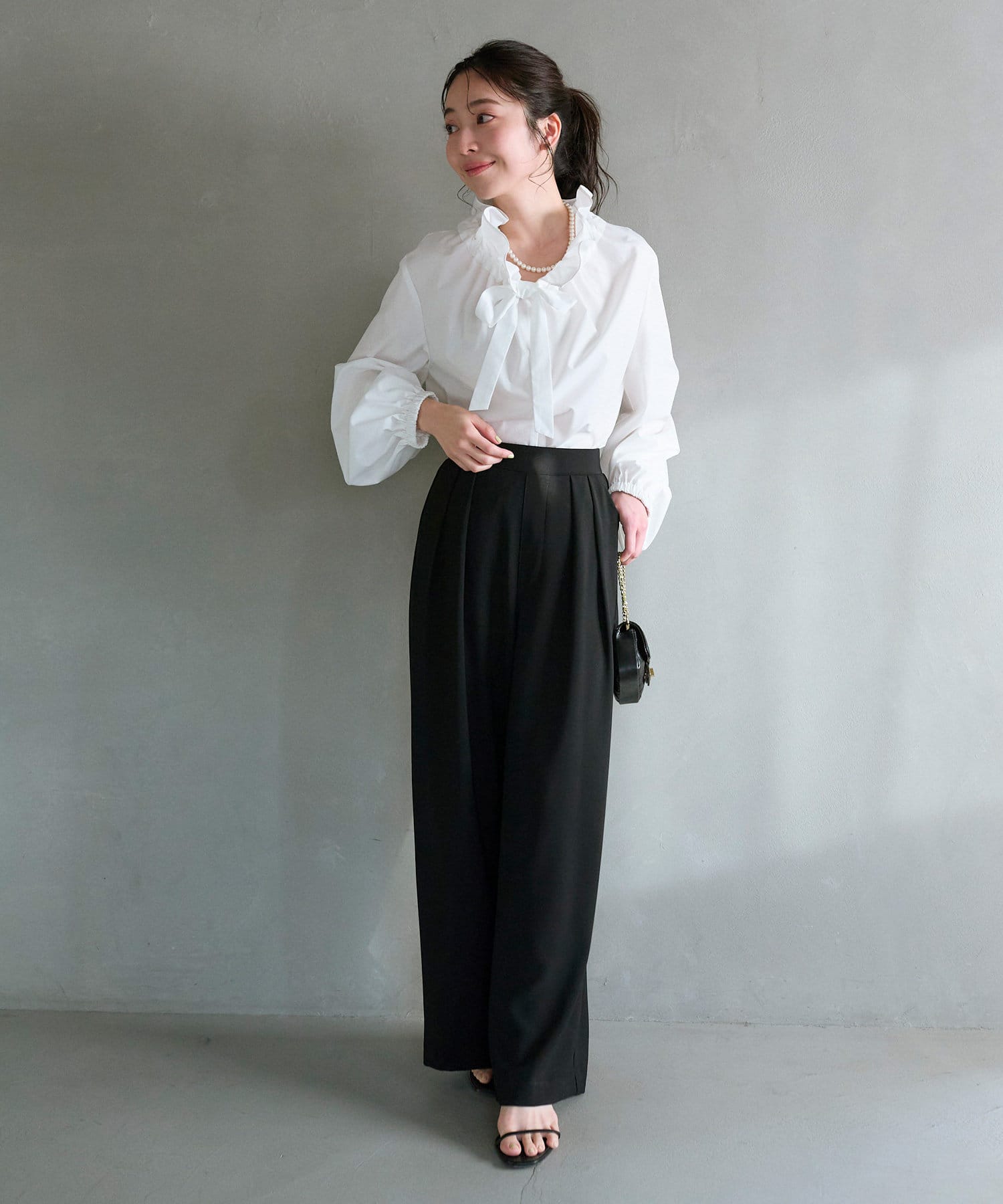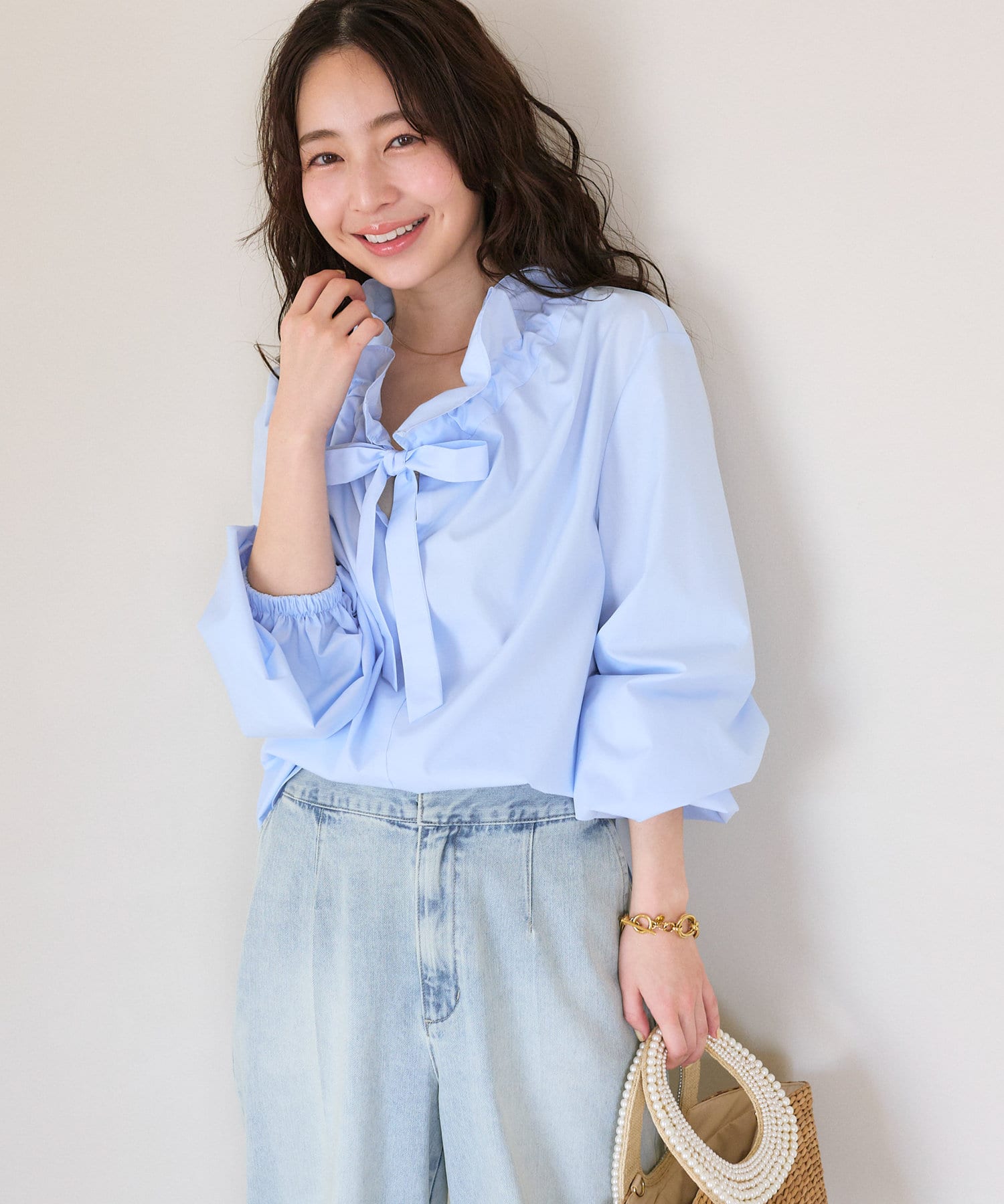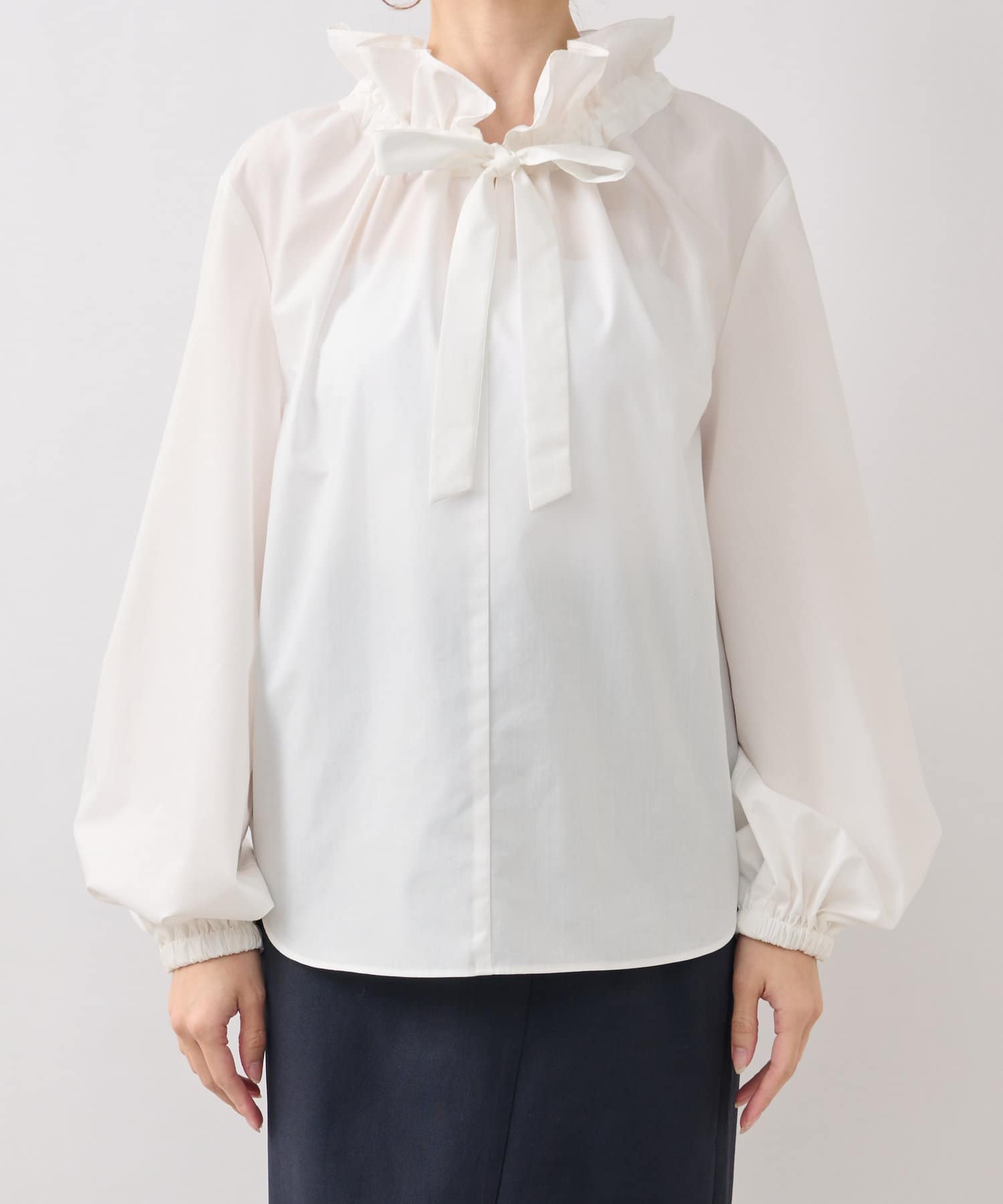 フリル襟が印象的なリボンブラウス