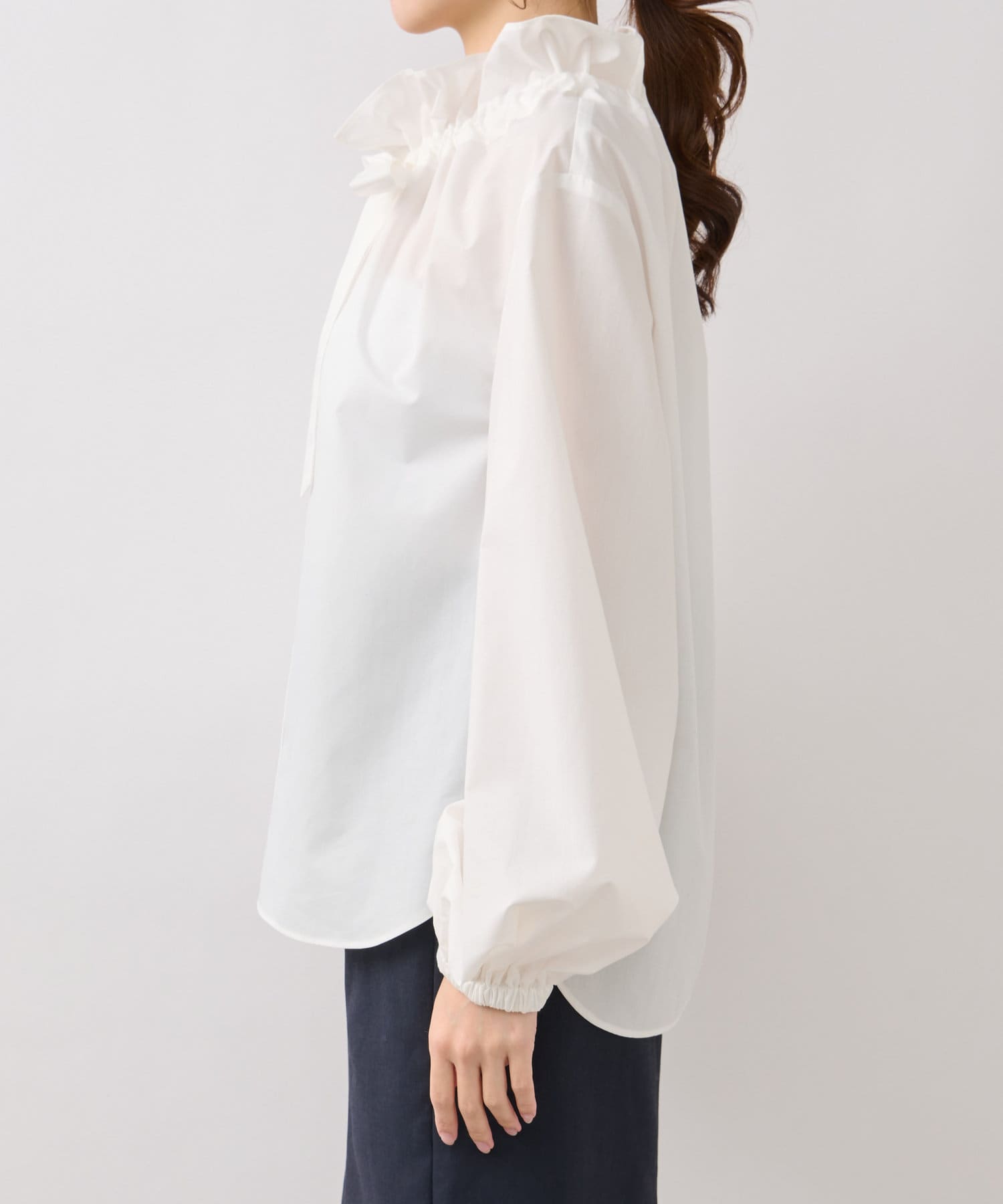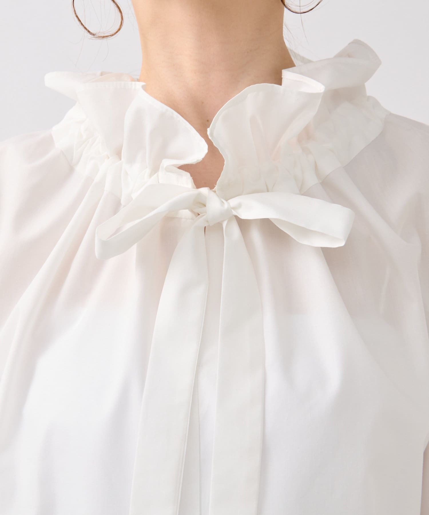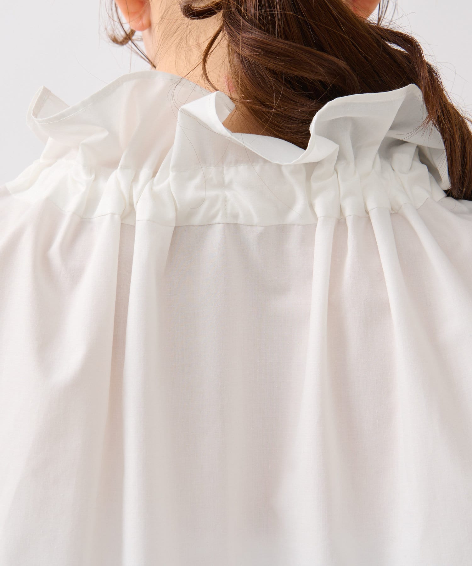 立体的な襟元のフリルが印象的で小顔効果も叶います。