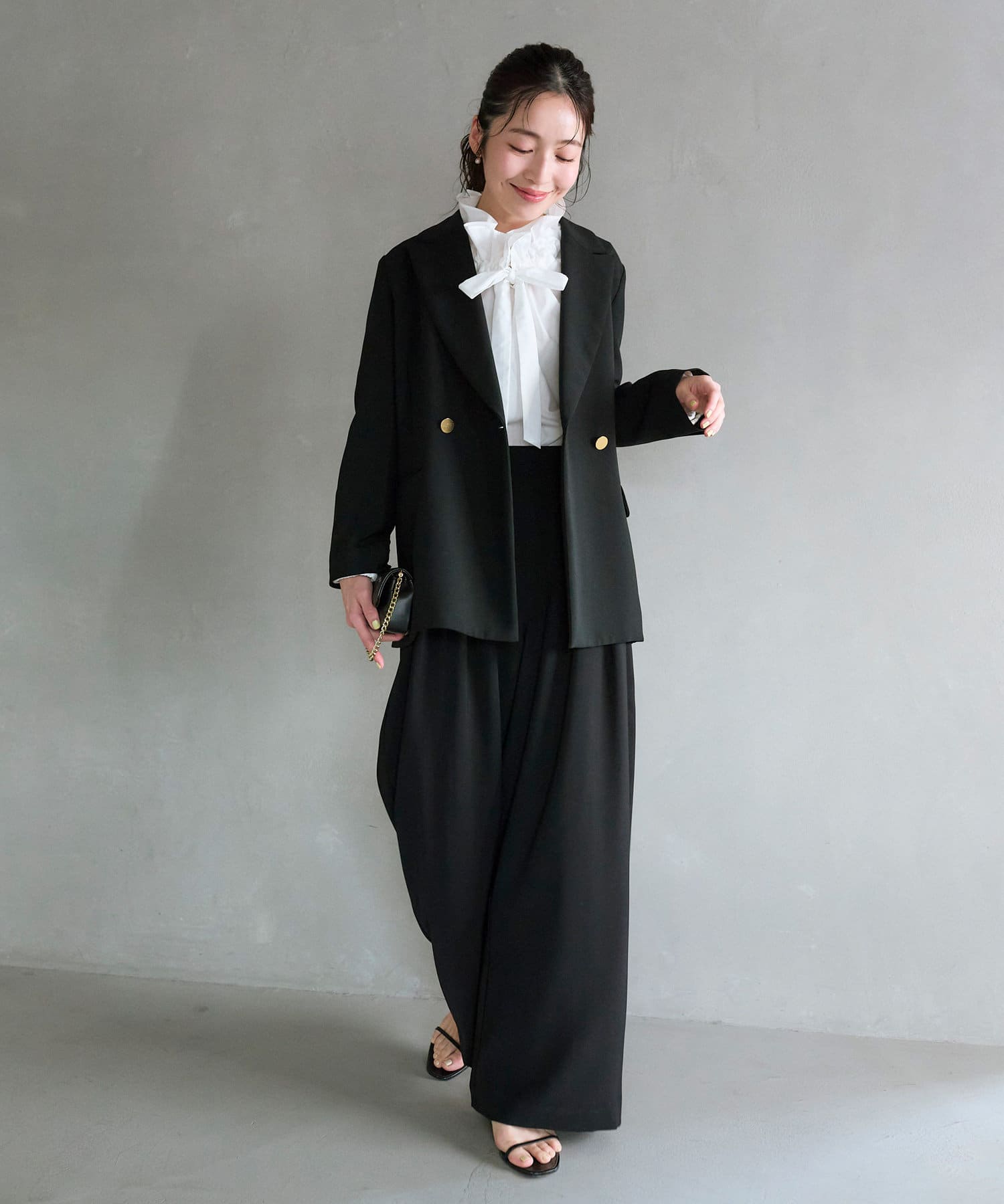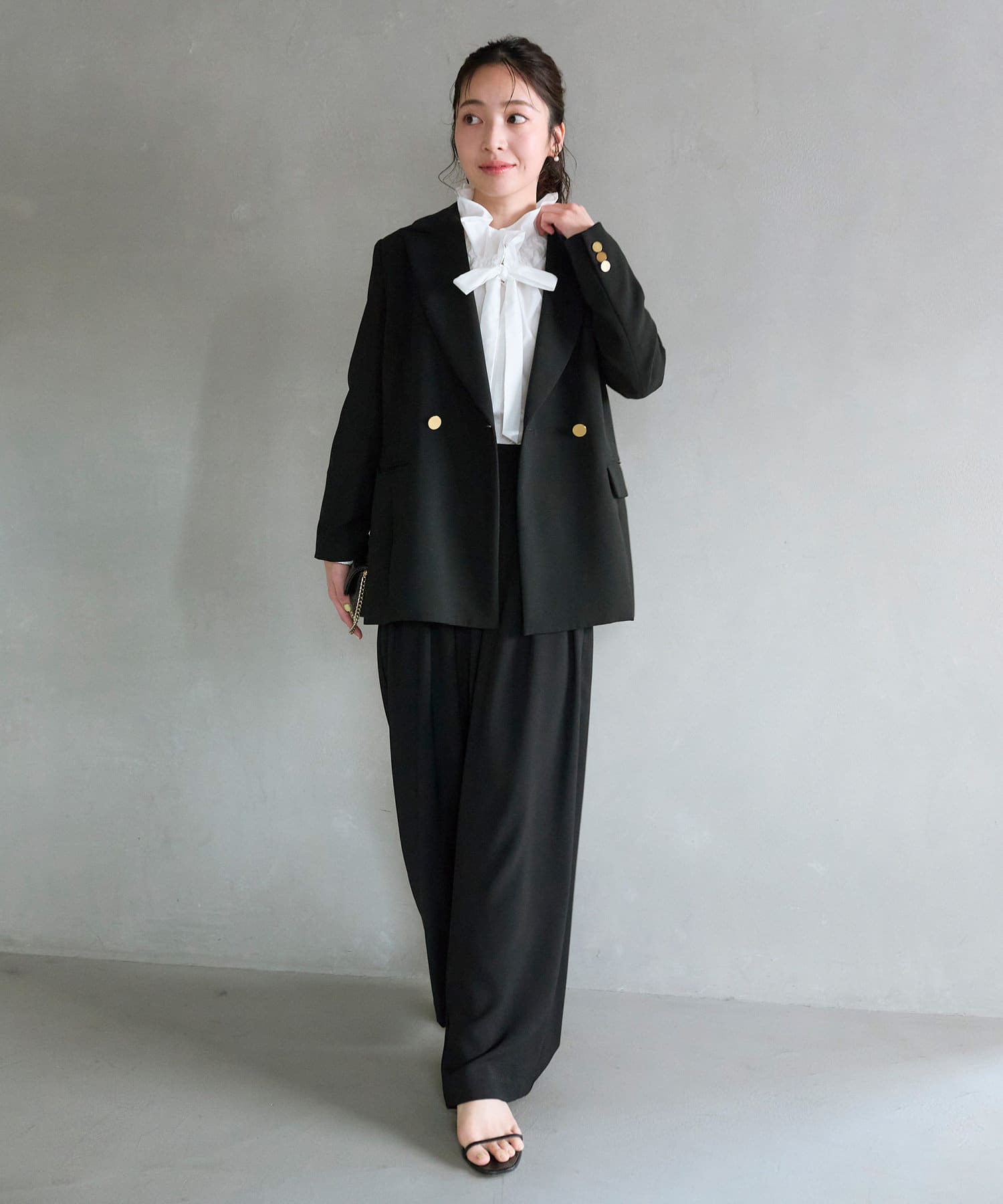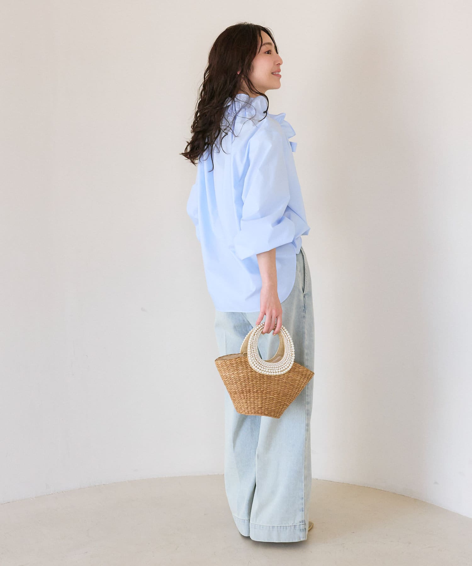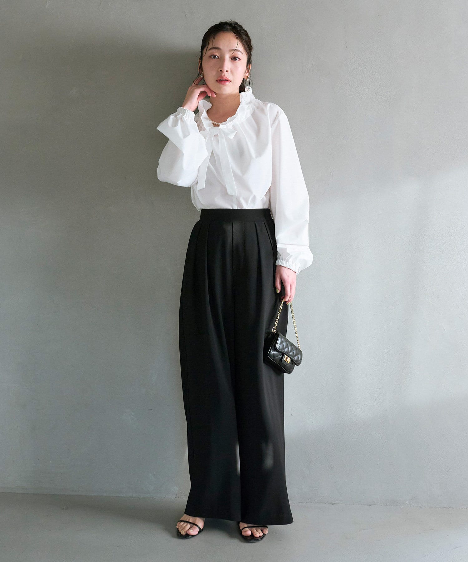 立体的な襟元のフリルが印象的で小顔効果も叶います。