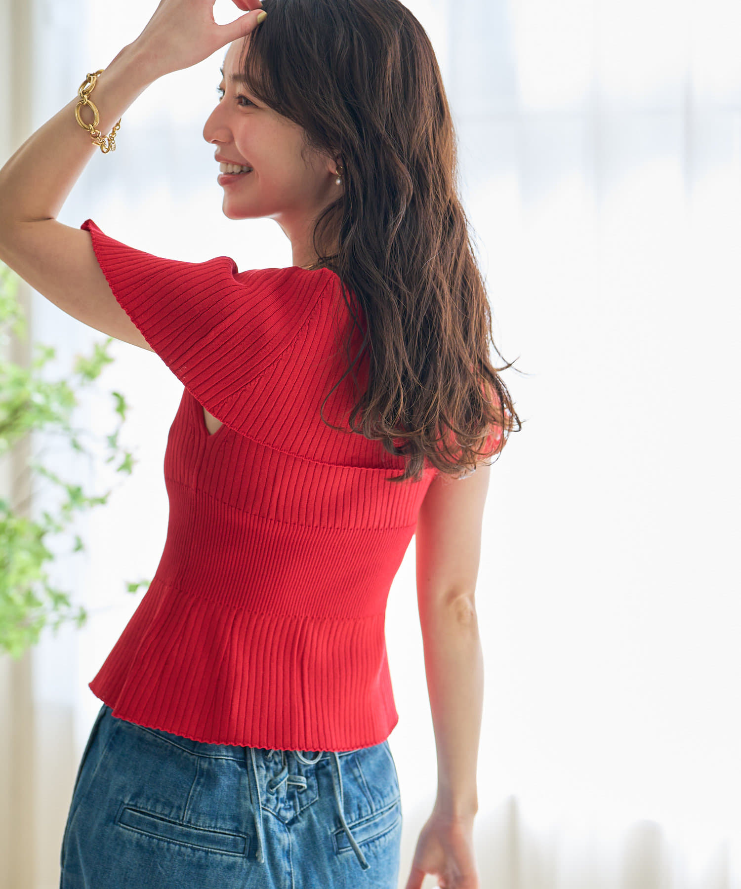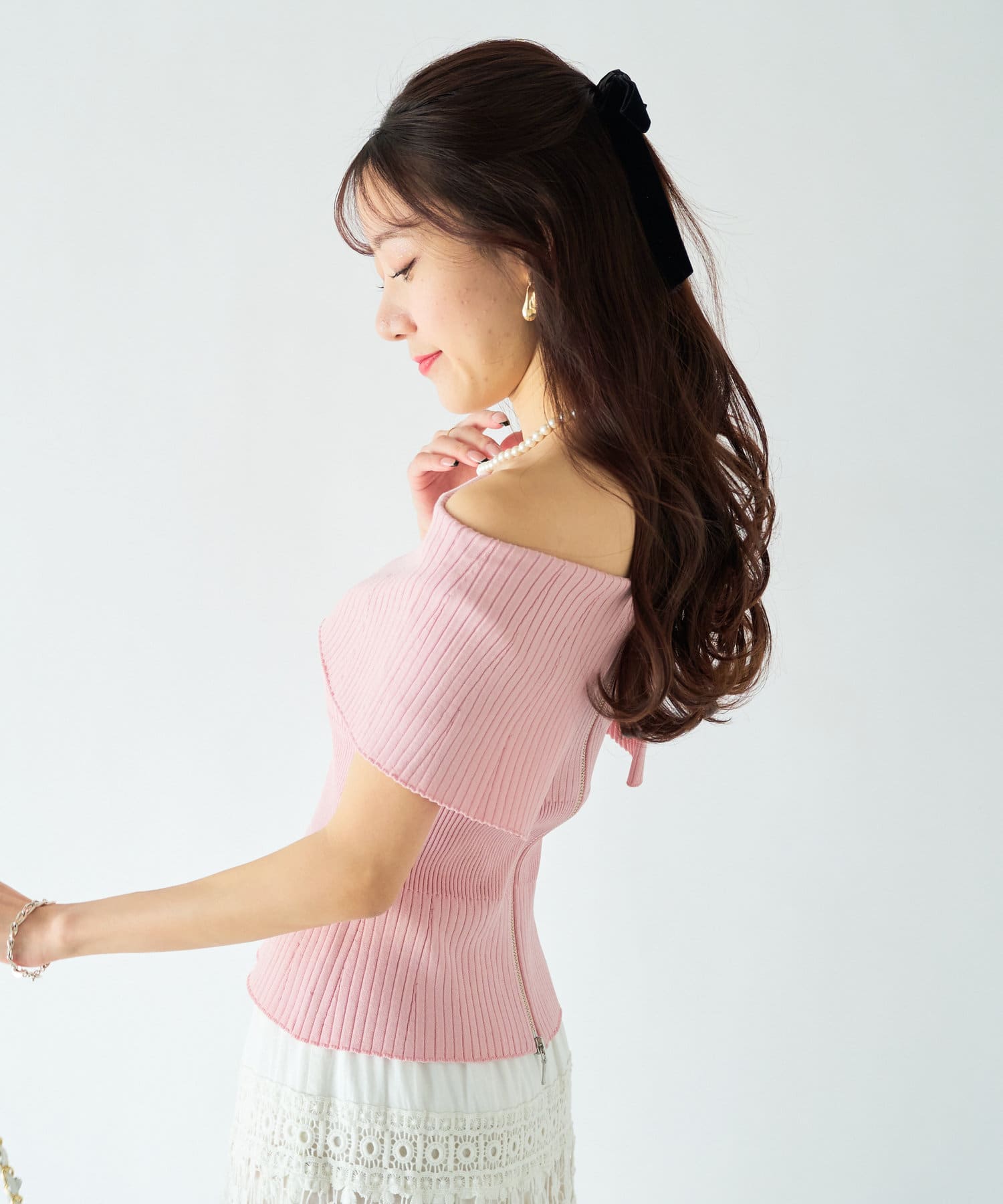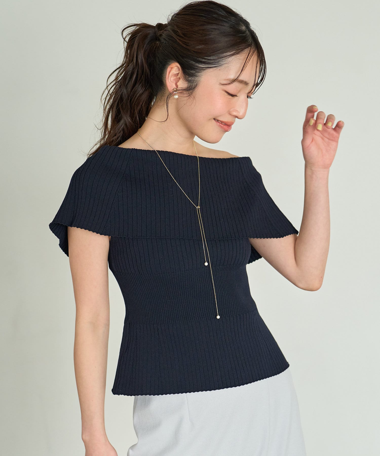 オフショルとしても着ていただけるので、1枚で着こなしの幅が広がるアイテム。