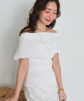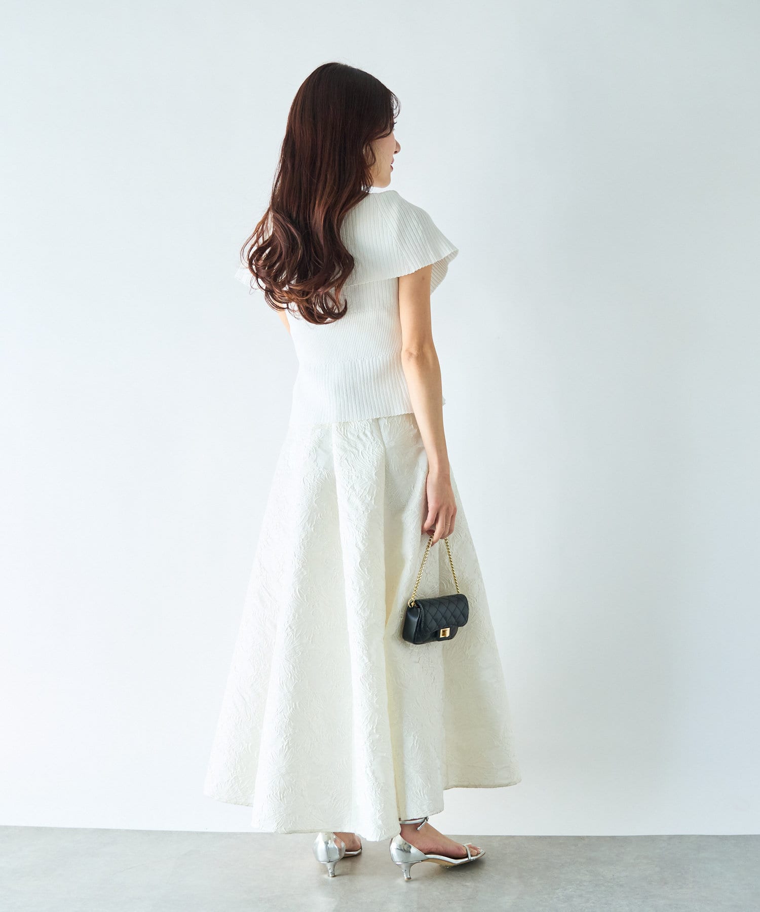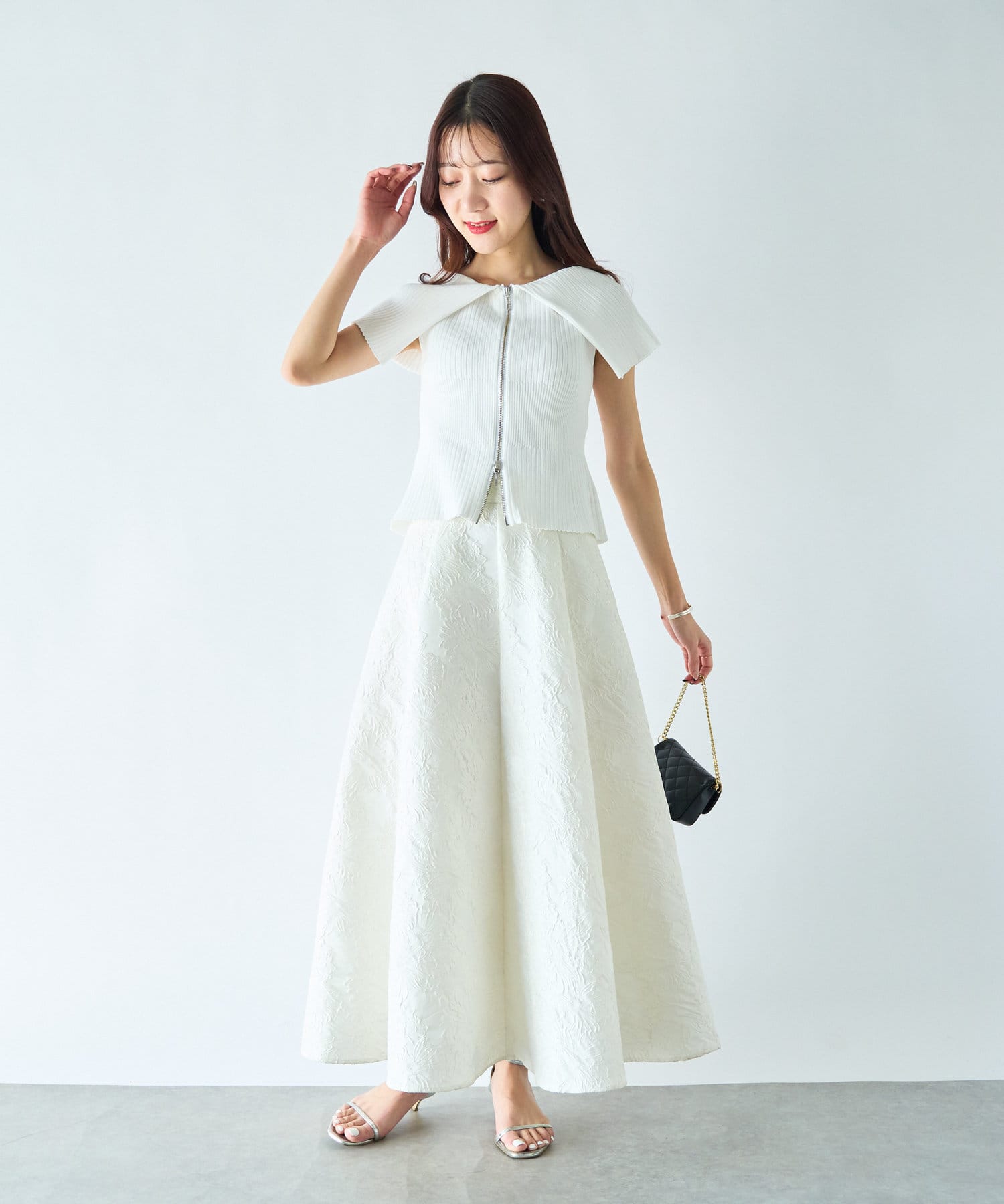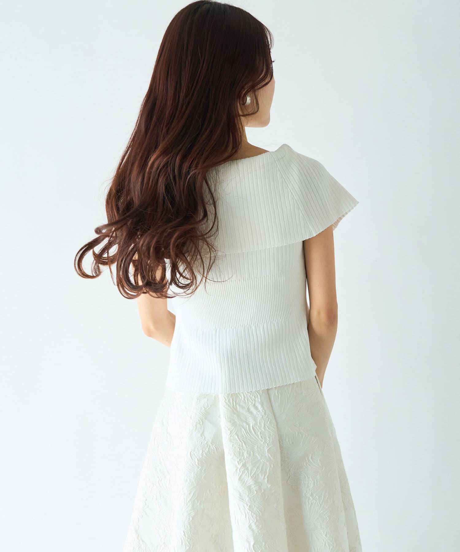 人気のジャガードスカートでフェミニンなコーデはオフショルで着たい。