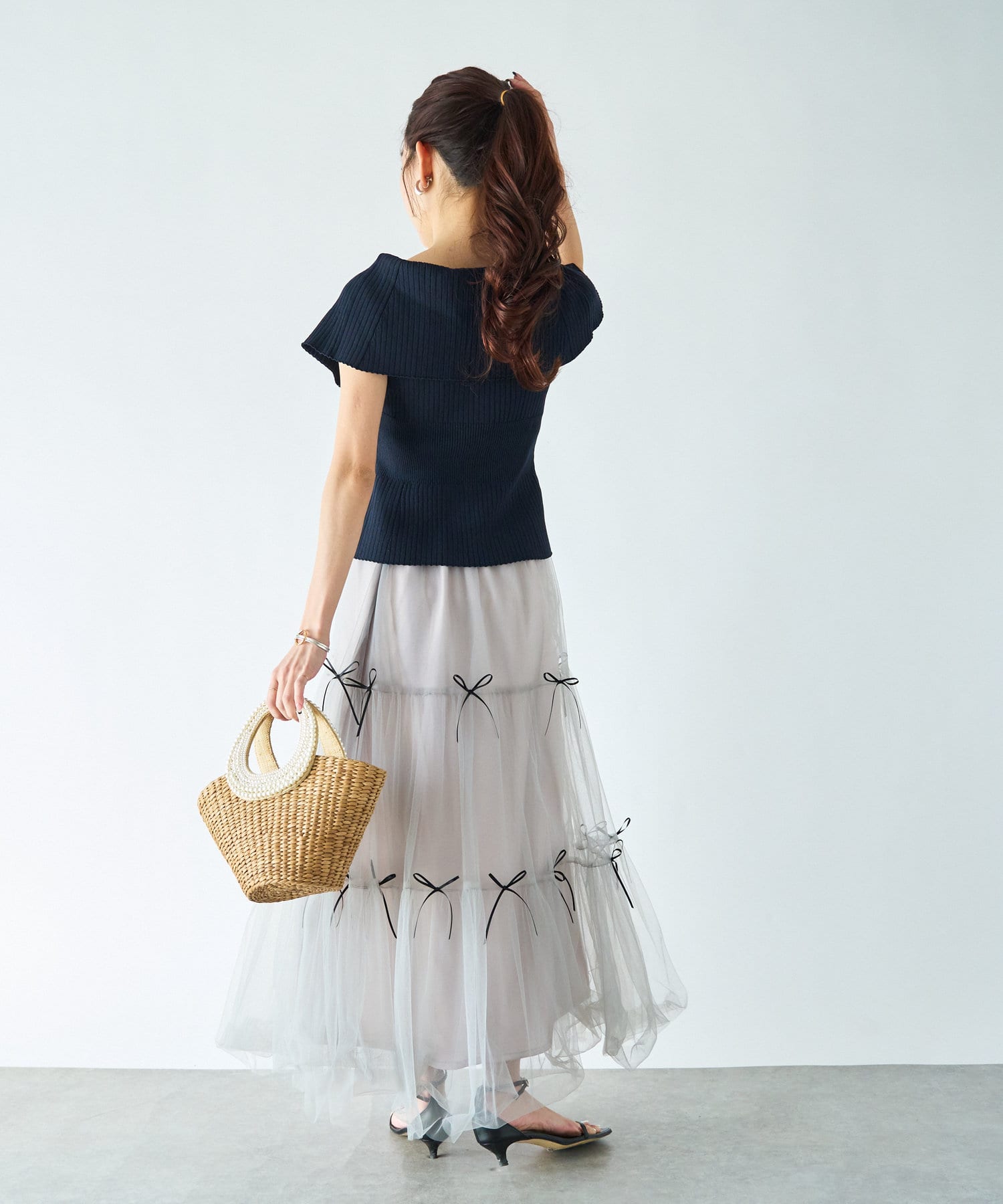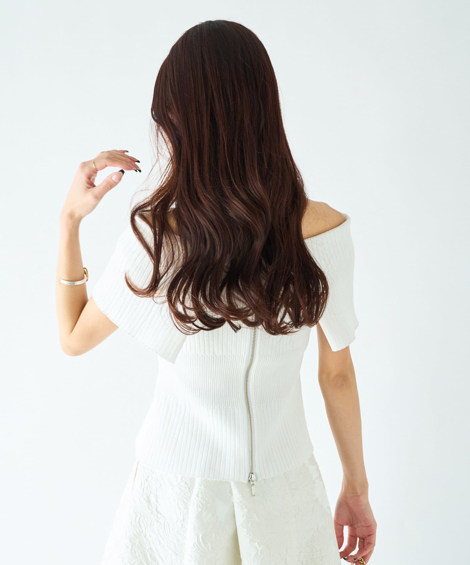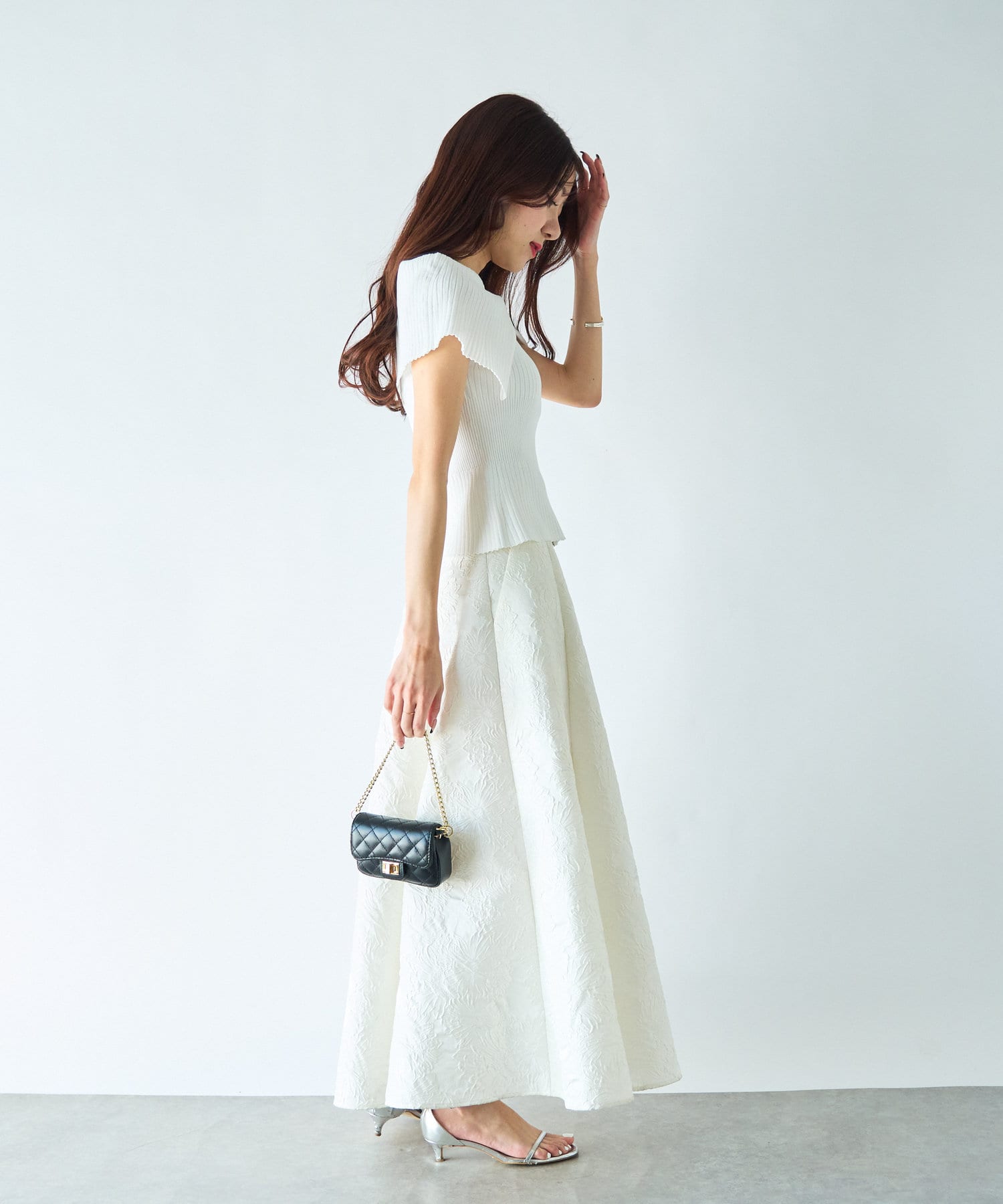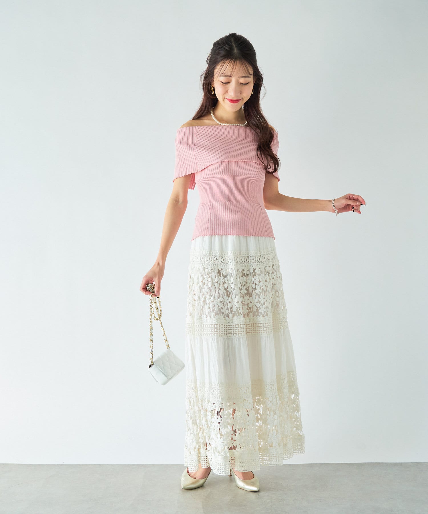 人気のジャガードスカートでフェミニンなコーデはオフショルで着たい。