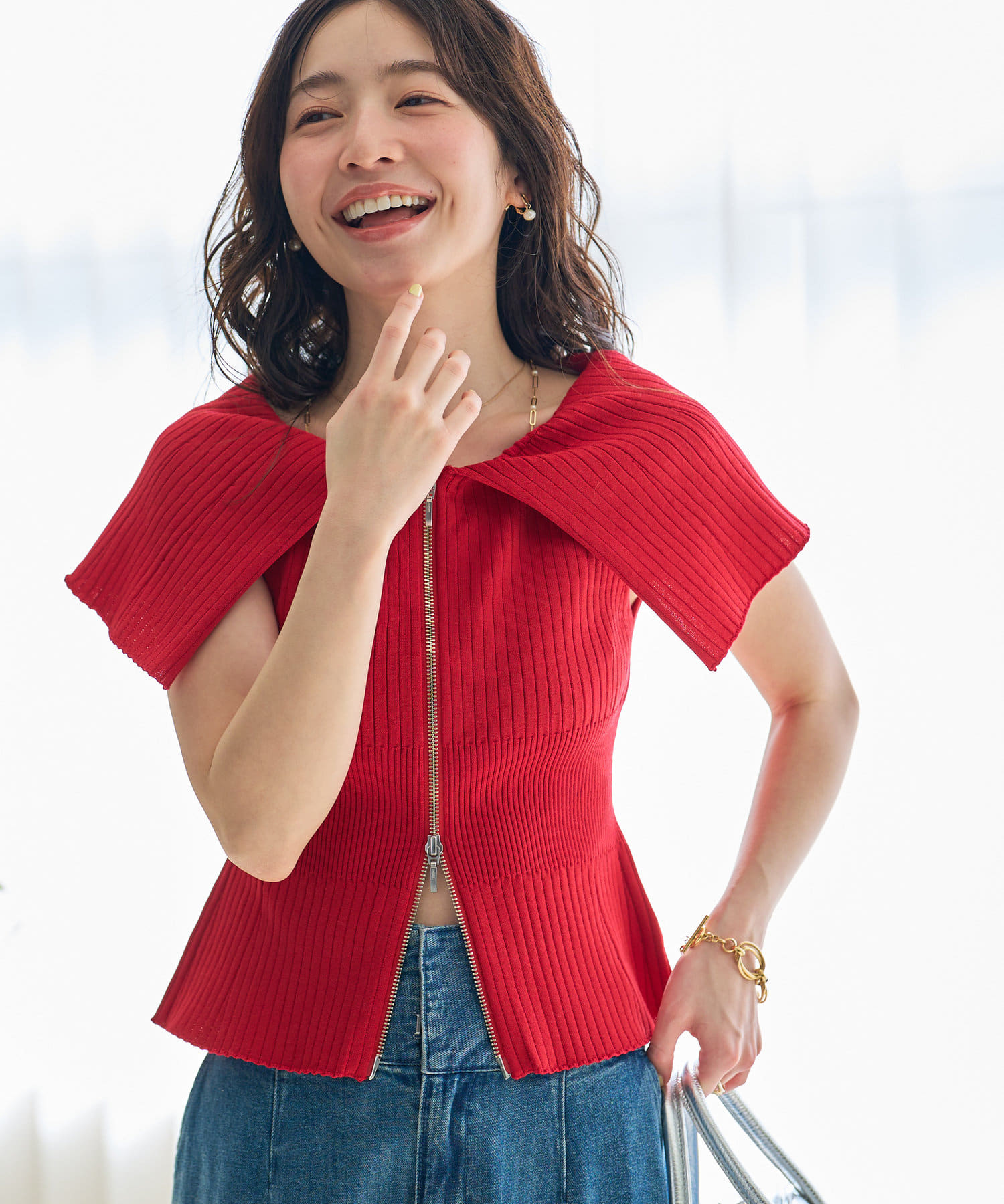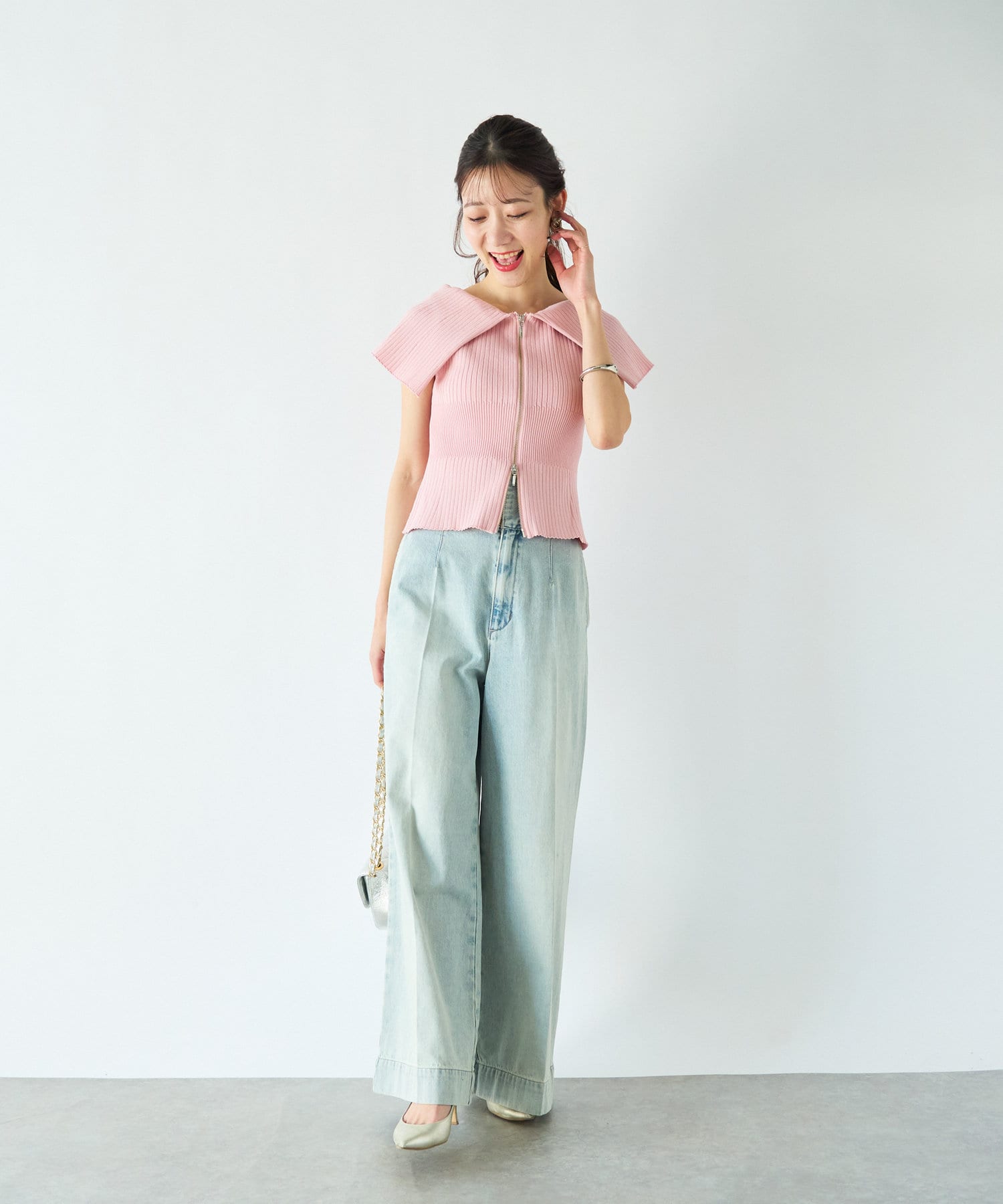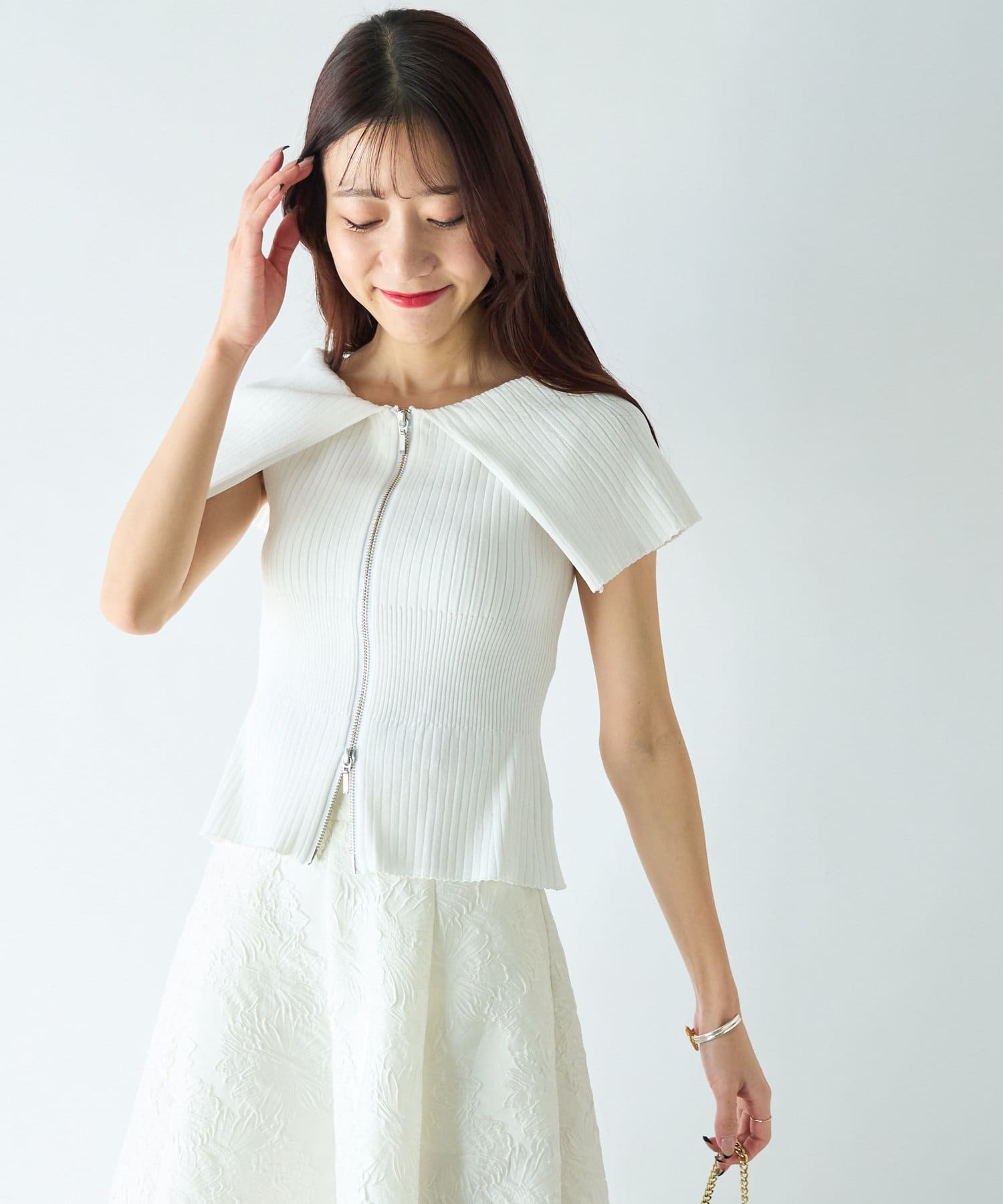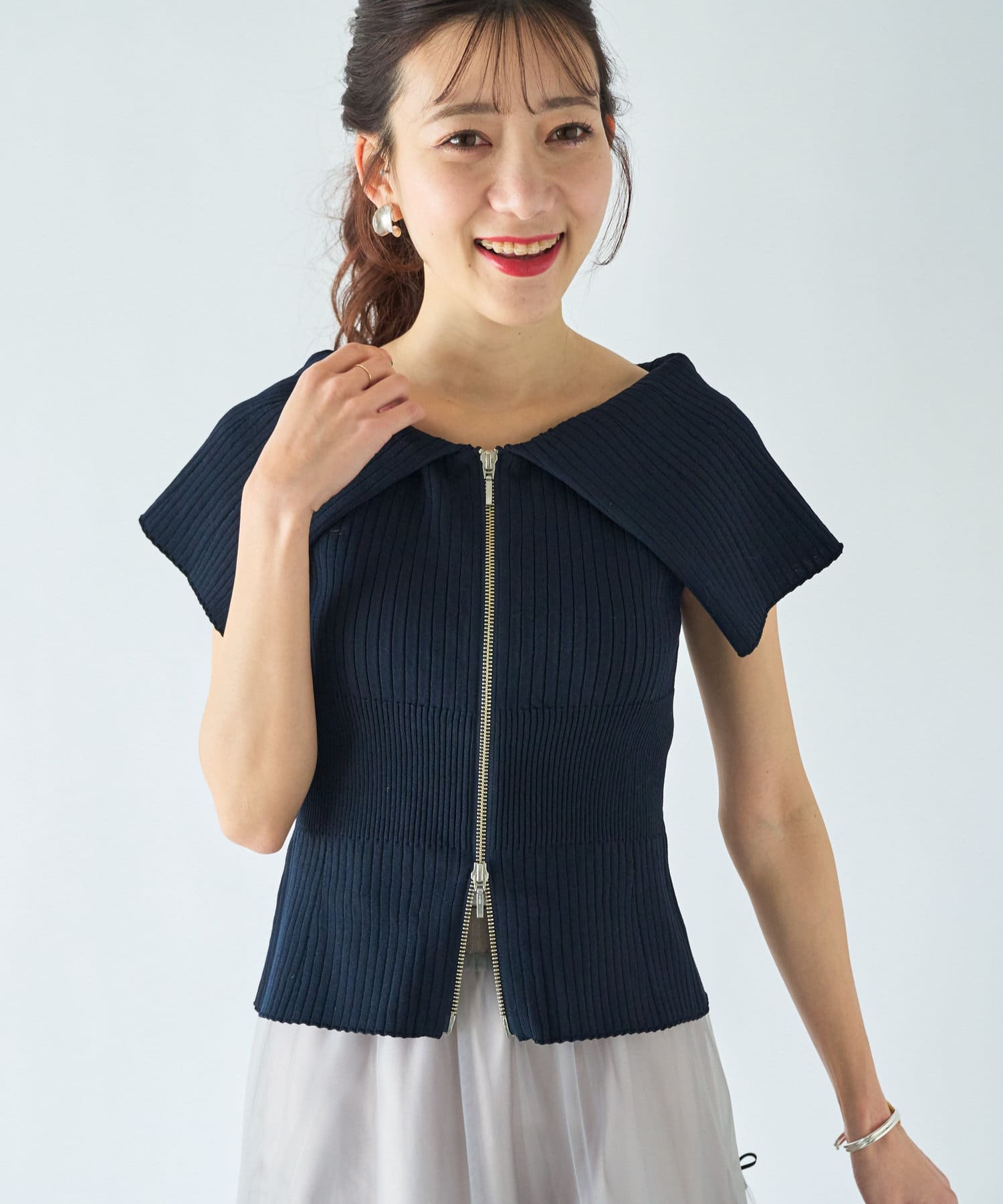 人気スタッフmikiが監修したフロントジップアップのニット。