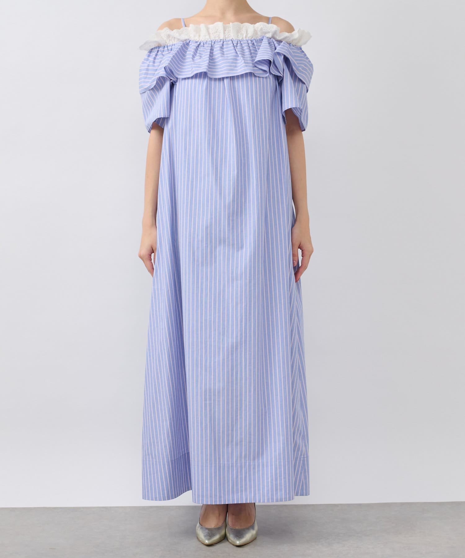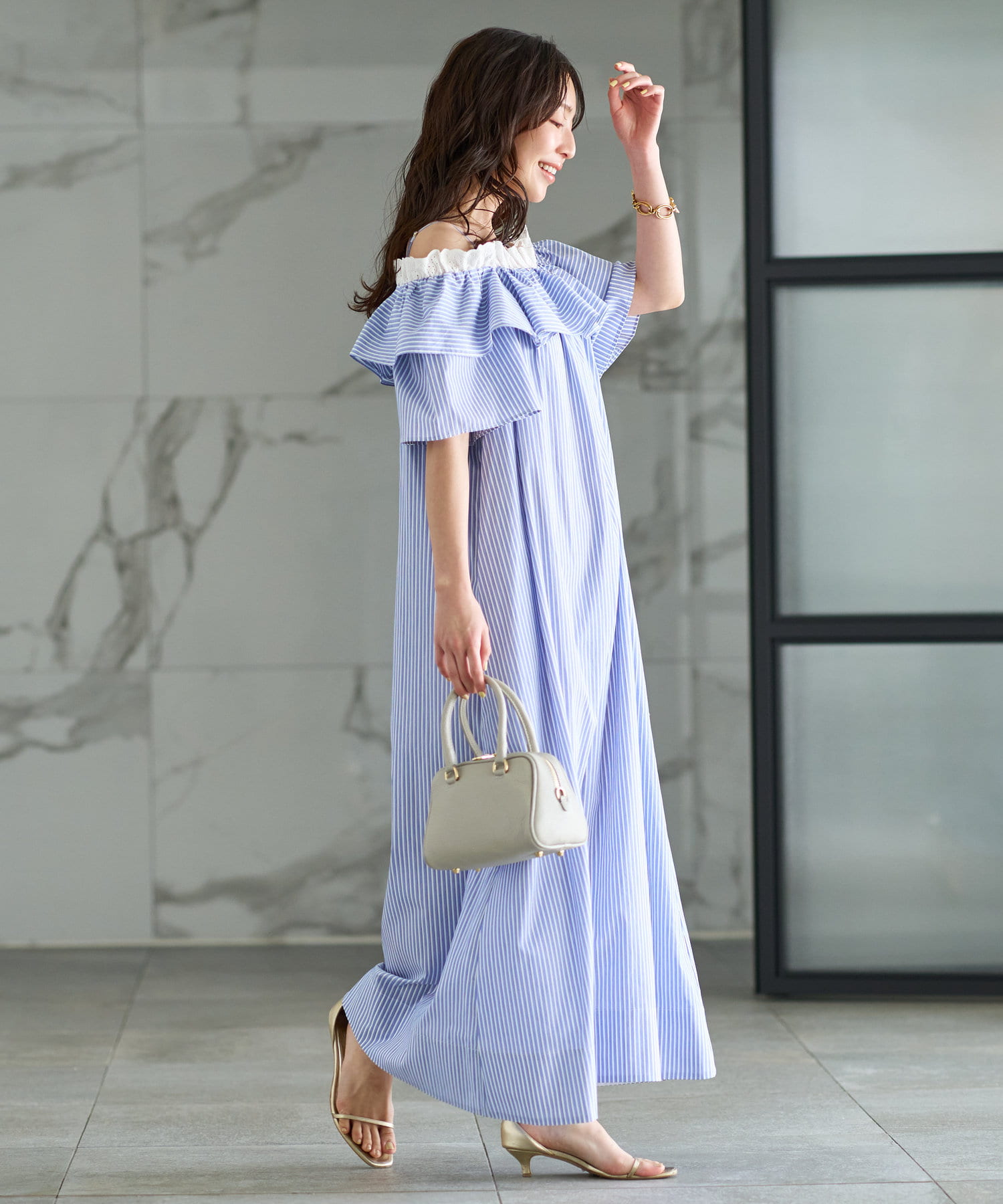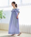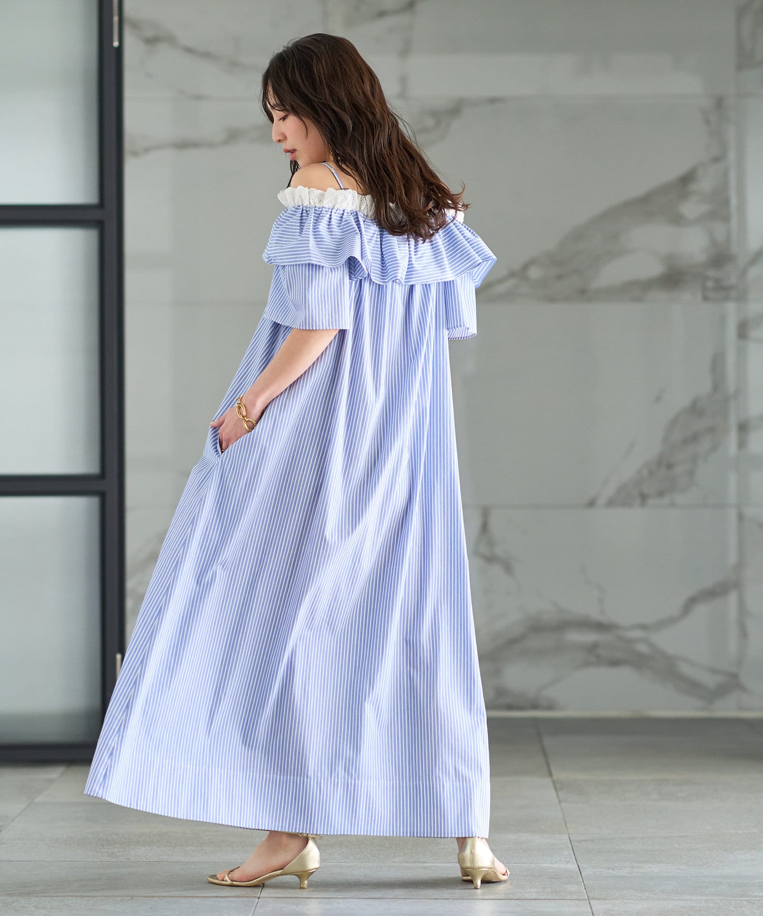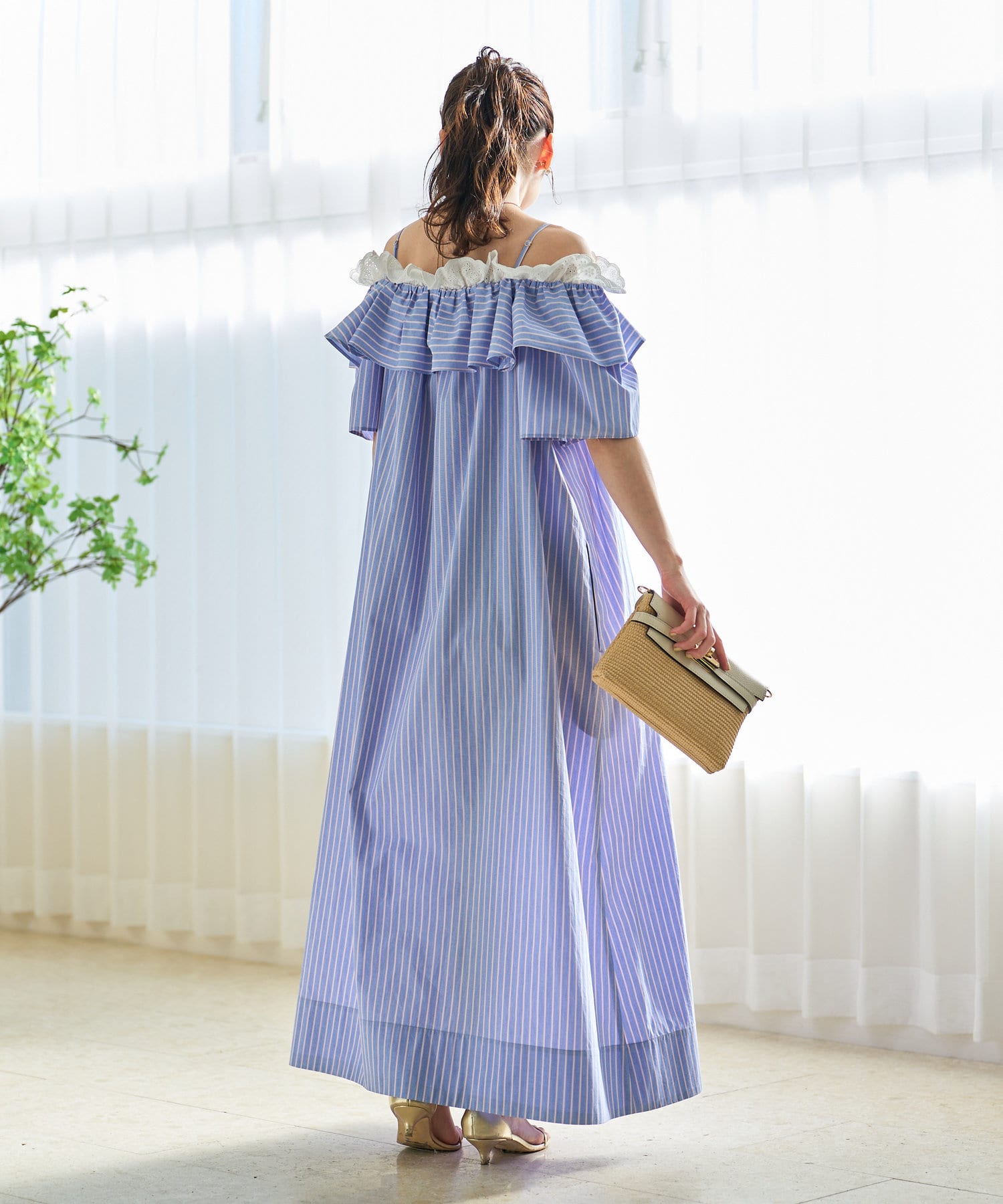 胸元のフリルと白レース使いで大人の可愛いを詰め込んだマキシワンピース