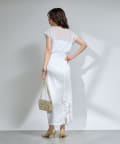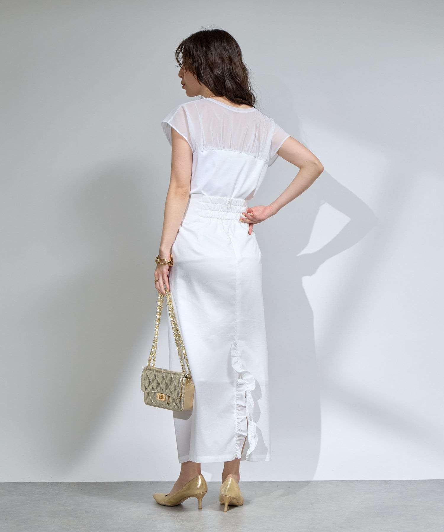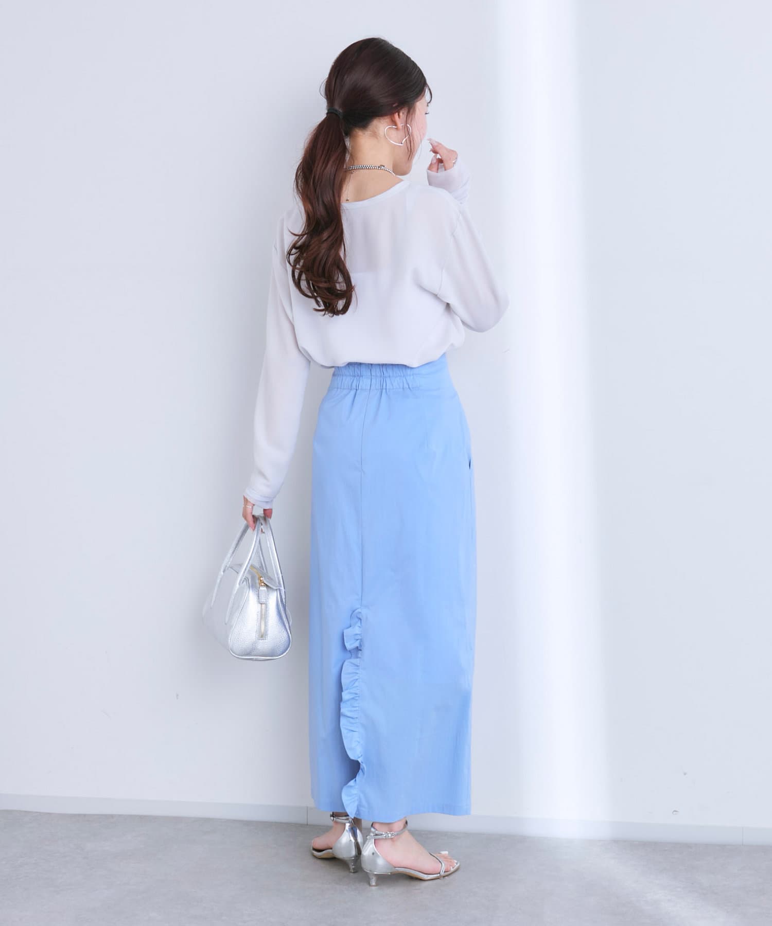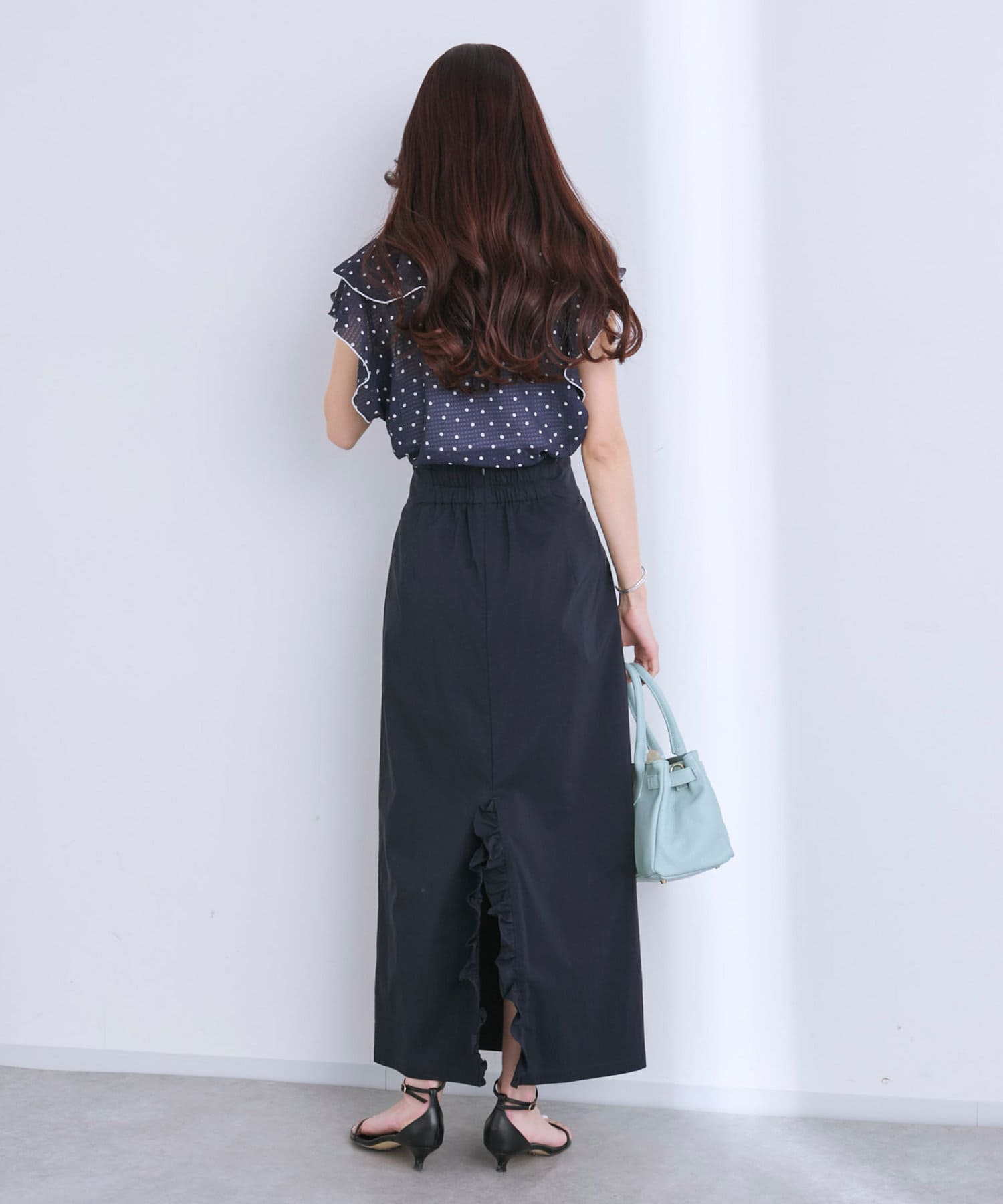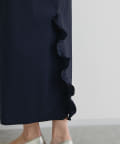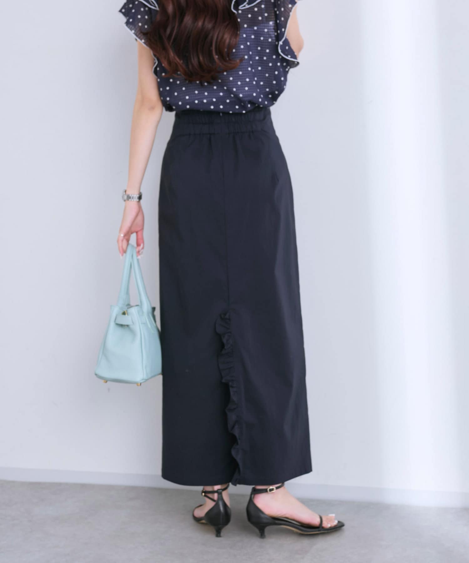 ロングタイトシルエットで、後ろはベンツにフリルをポイントにつけてバックスタイルも華やかに仕上げました。