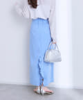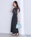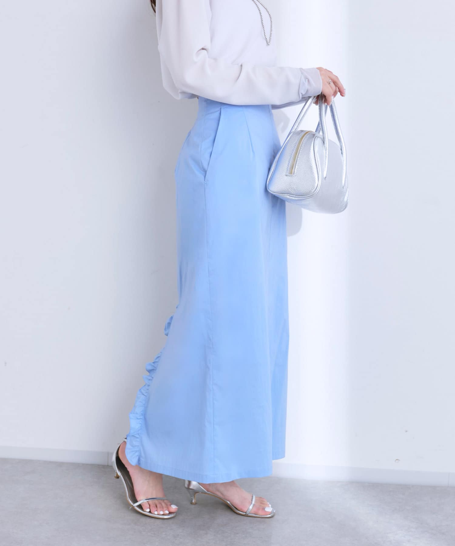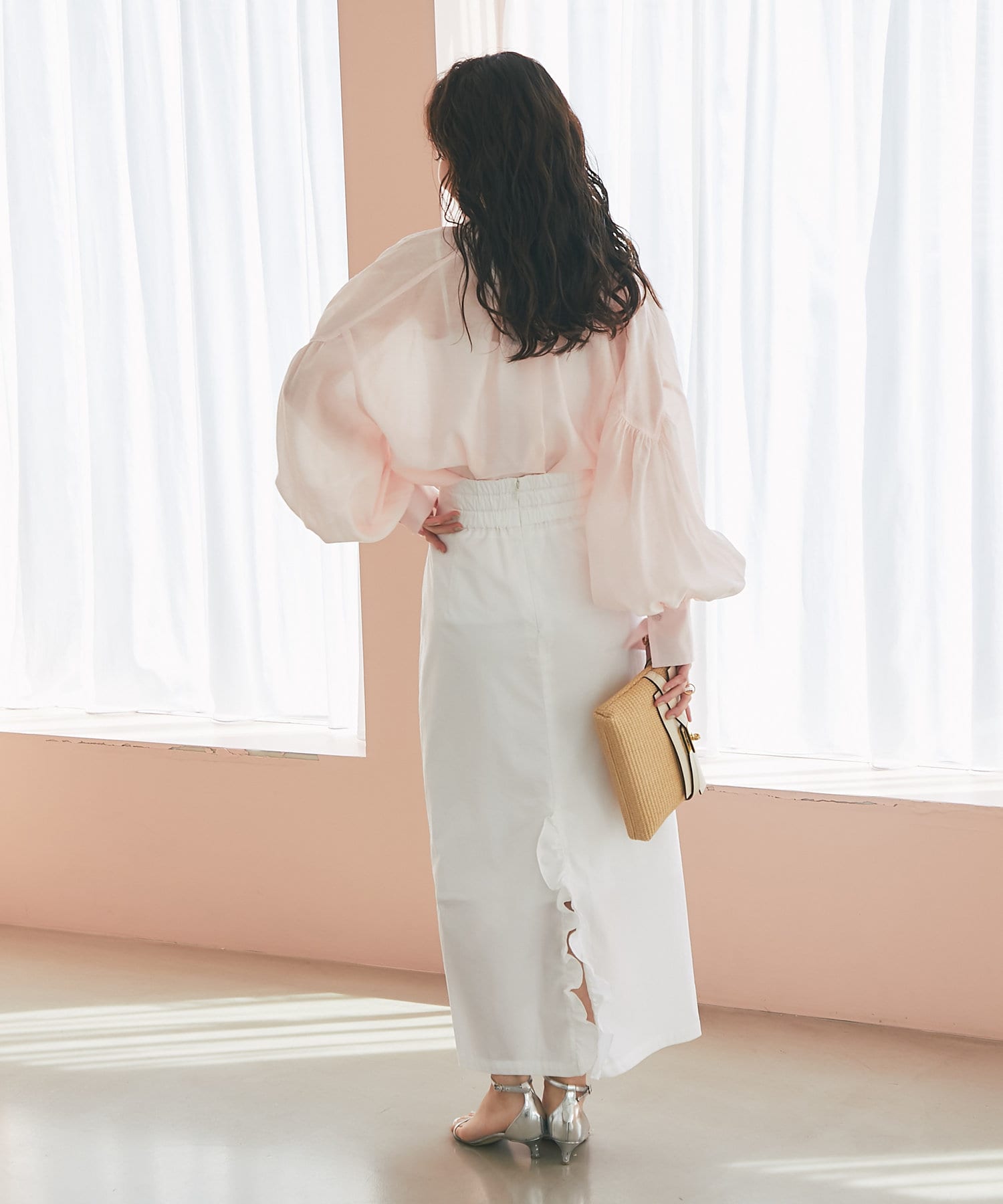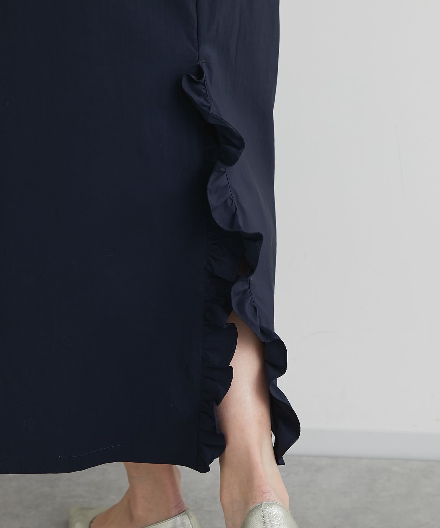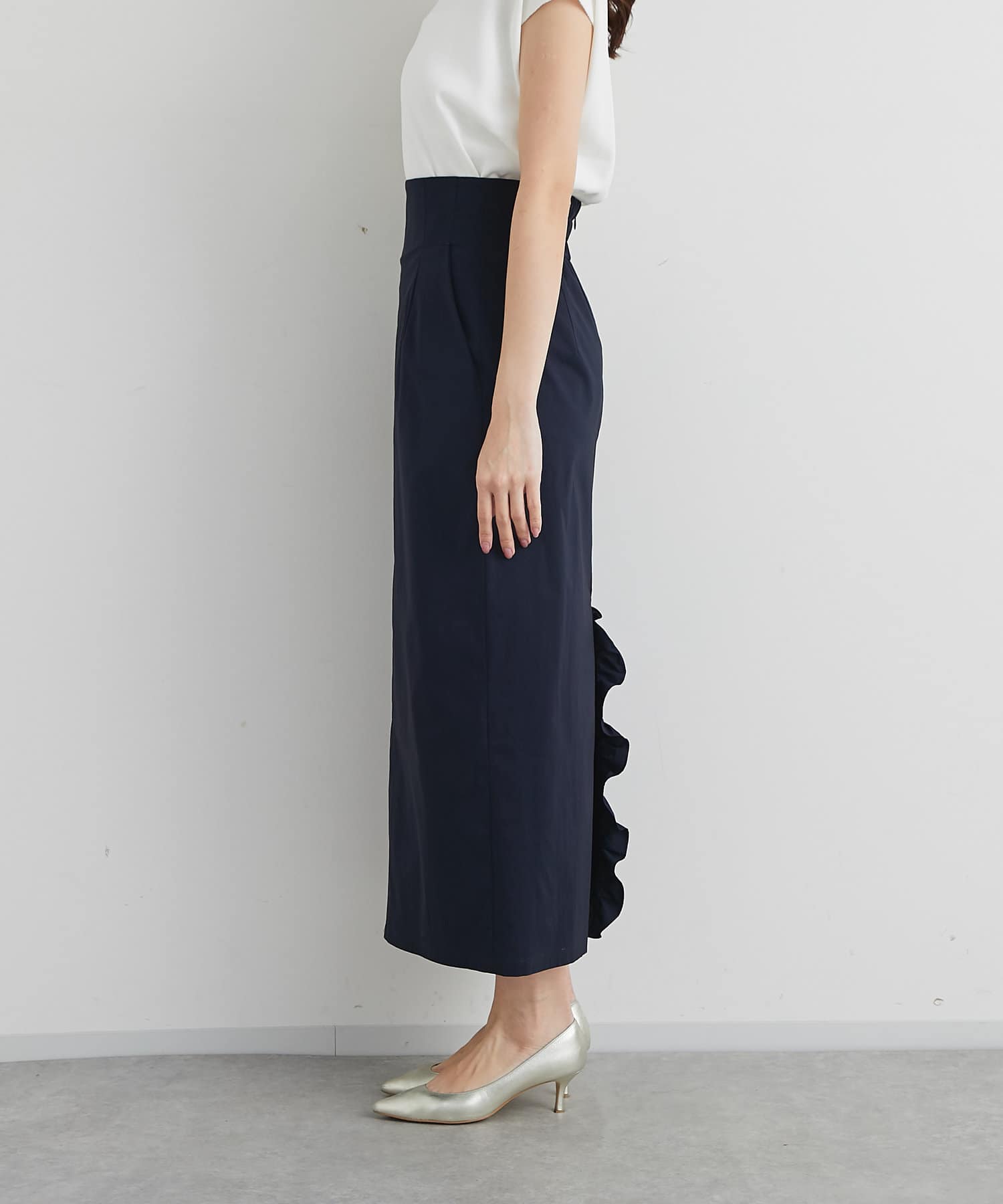 ロングタイトシルエットで、後ろはベンツにフリルをポイントにつけてバックスタイルも華やかに仕上げました。