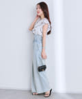 胸元から肩先まで華やかに彩るフリルが、全体のアクセントになり体型カバーにも貢献。