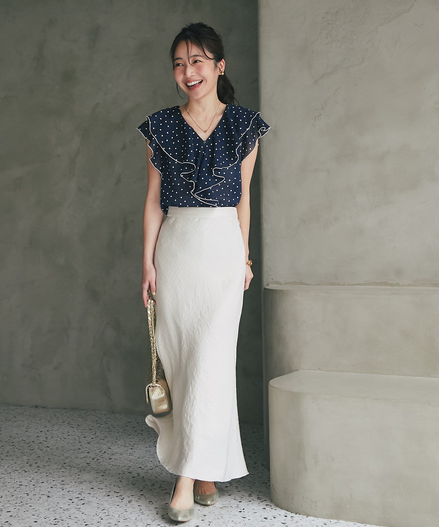上品なドット柄で大人の女性らしさ香るブラウス。