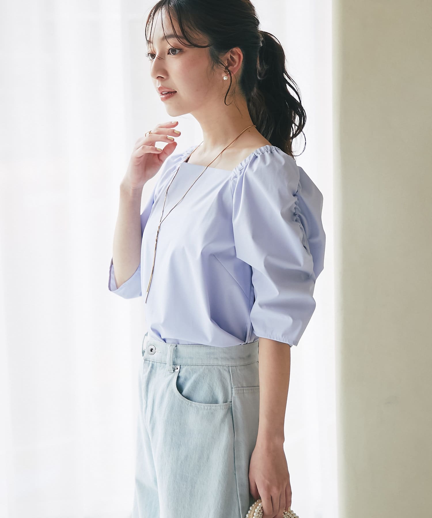 スクエアネックがデコルテを美しく見せ、女性らしい雰囲気を演出。