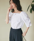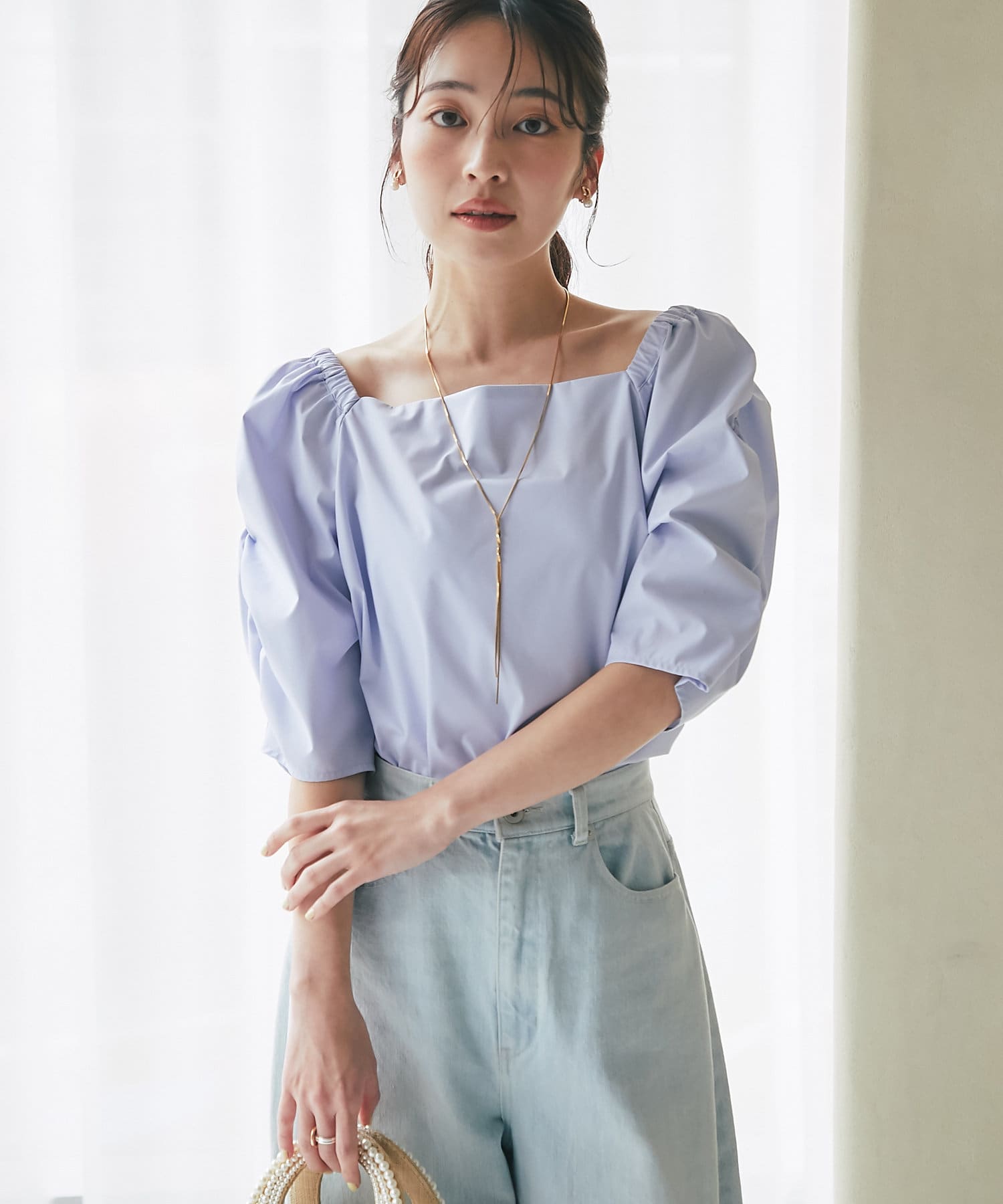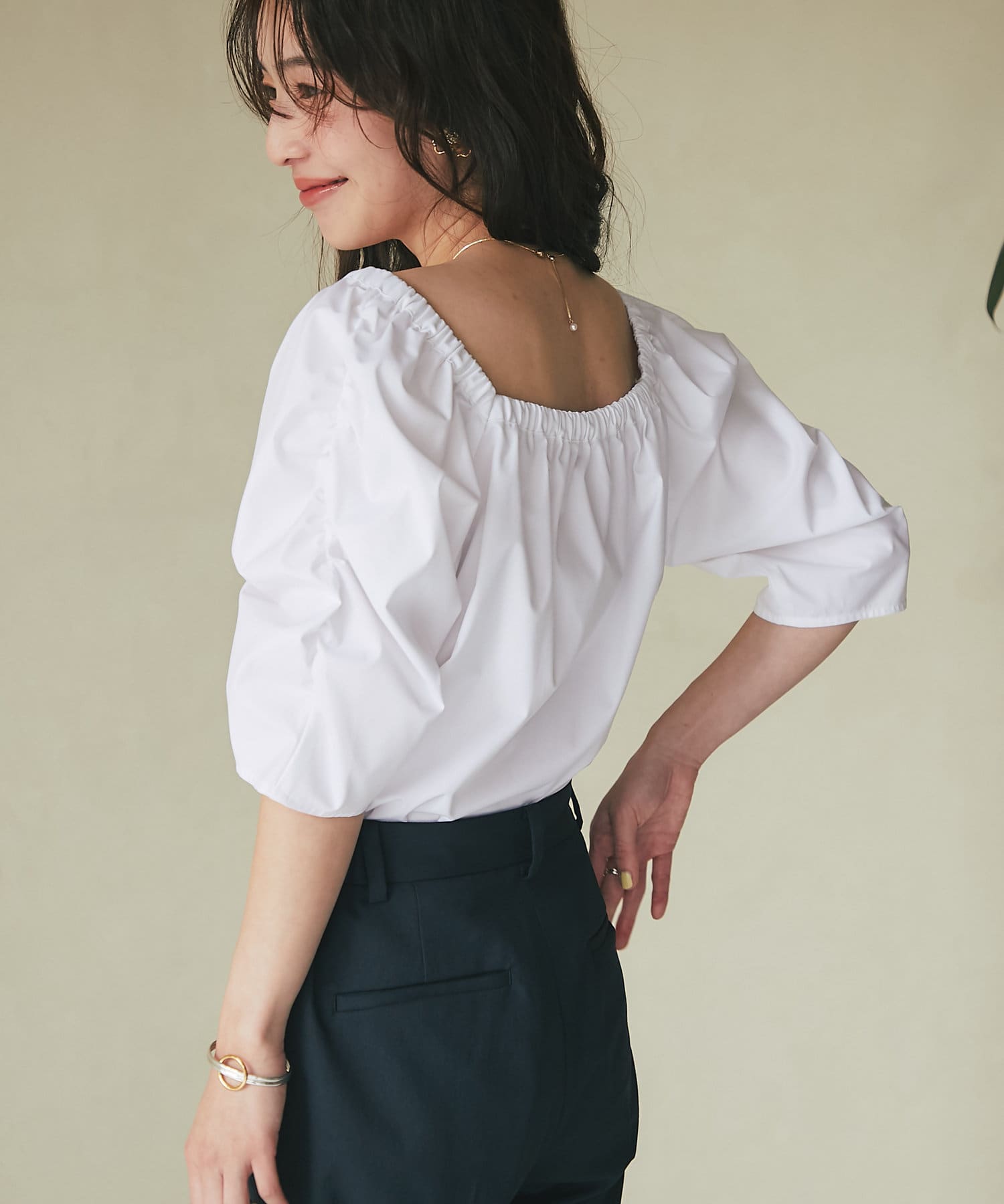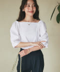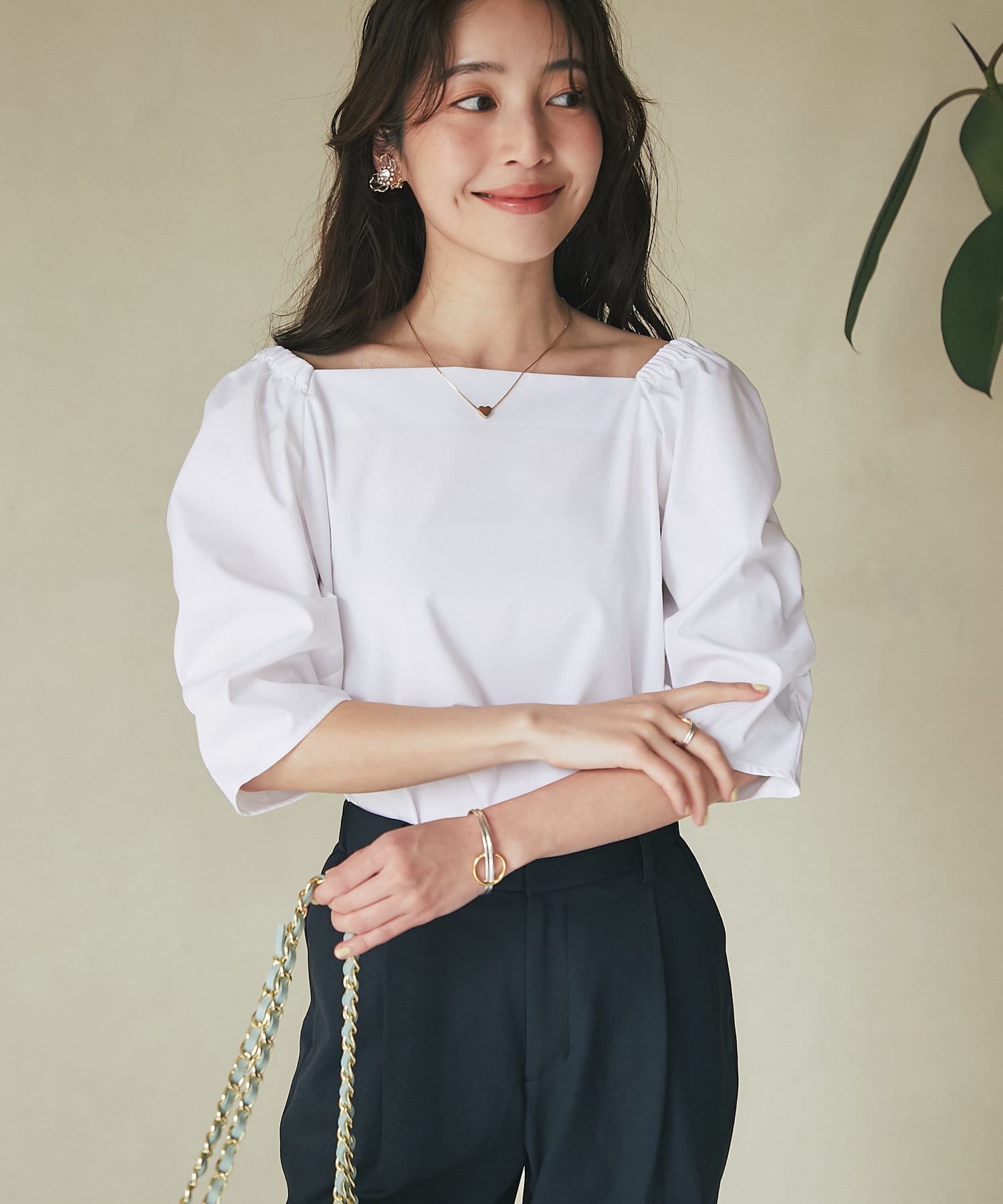 スクエアネックがデコルテを美しく見せ、女性らしい雰囲気を演出。
