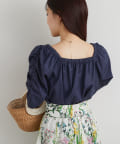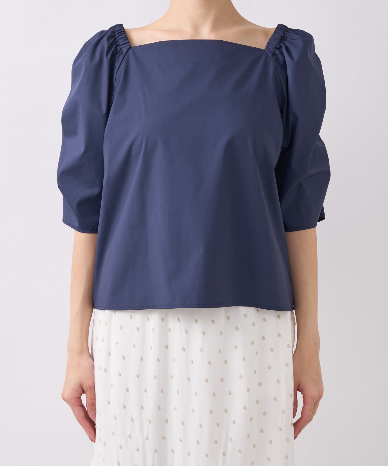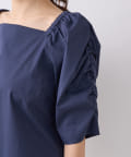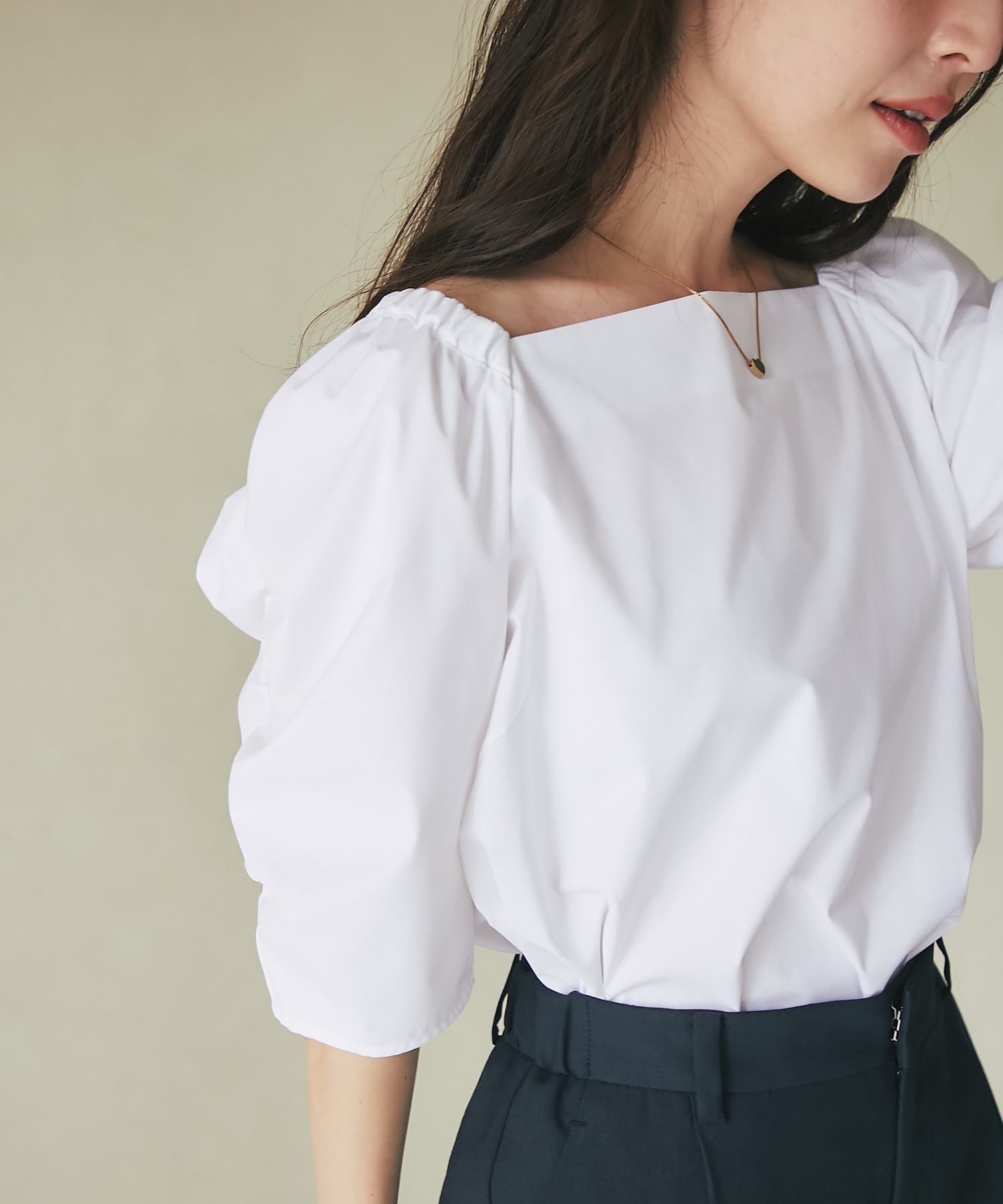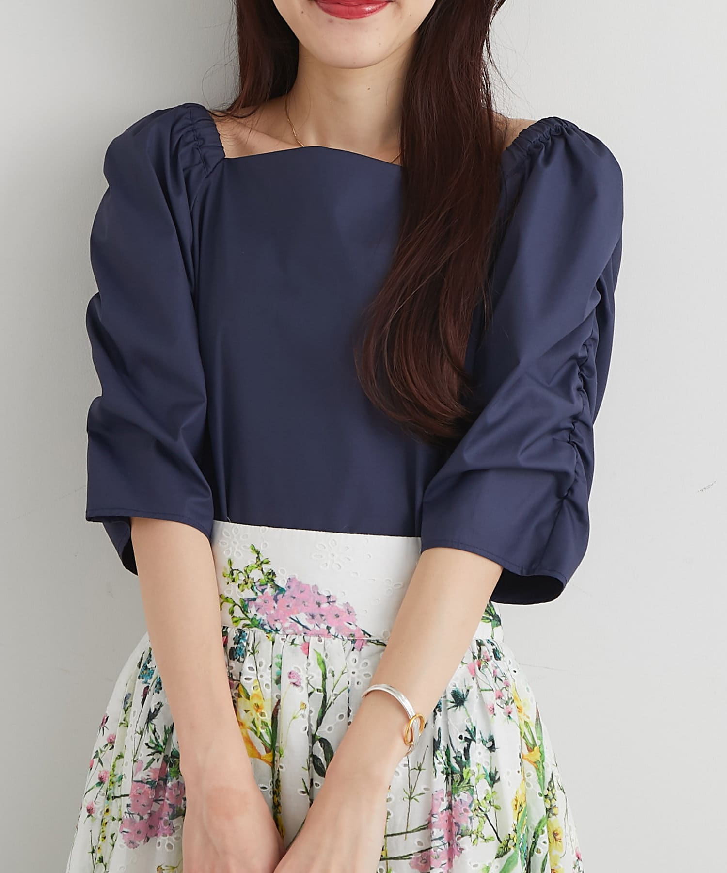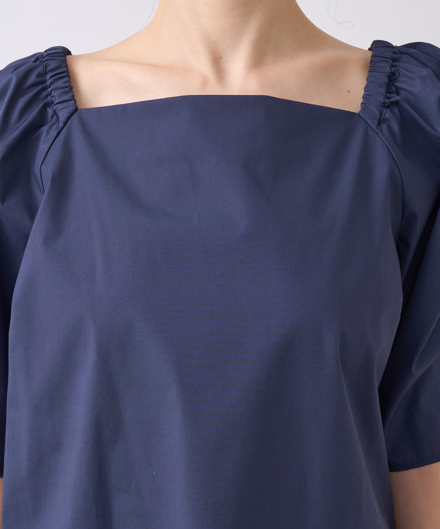スクエアネックがデコルテを美しく見せ、女性らしい雰囲気を演出。