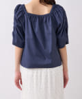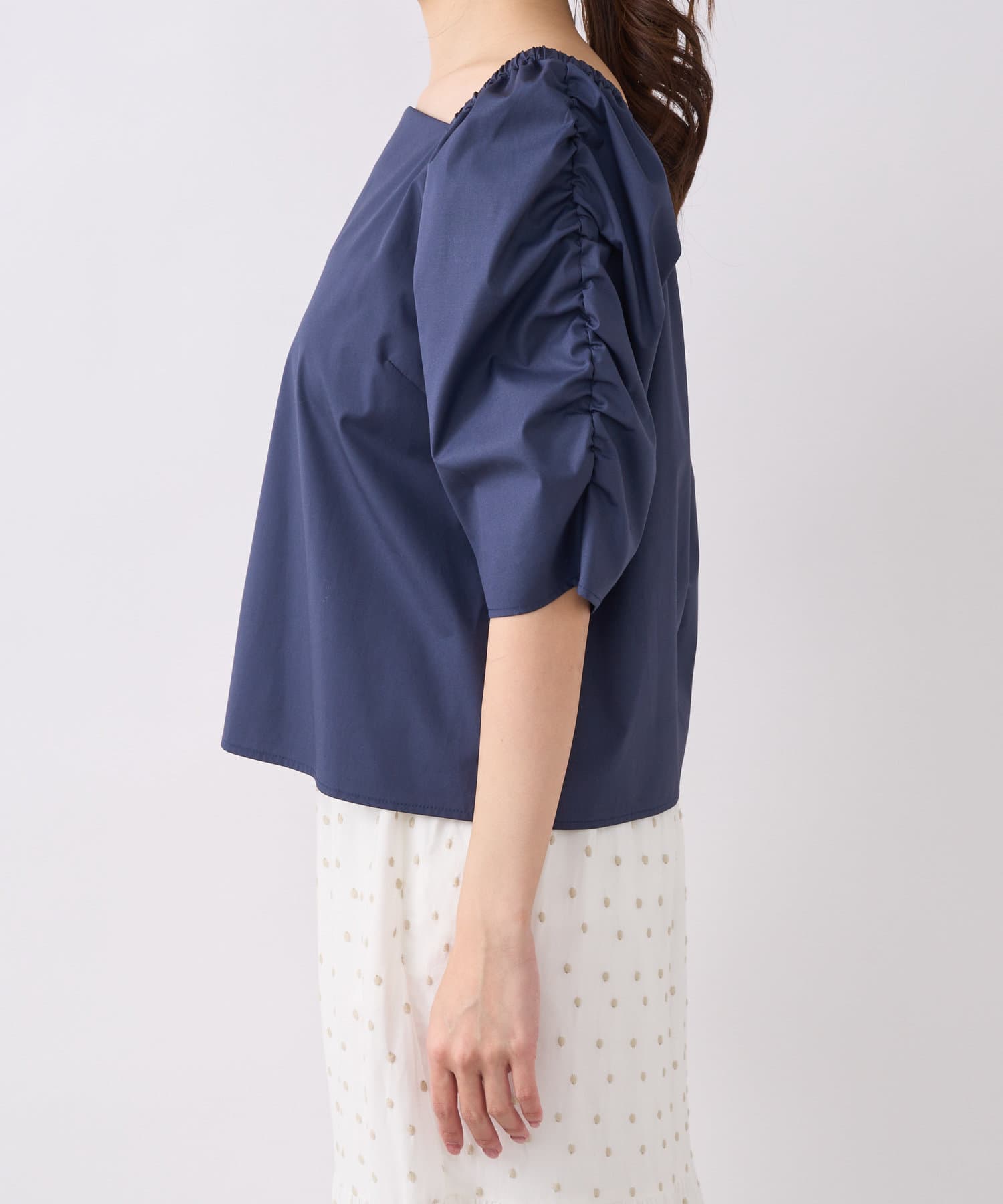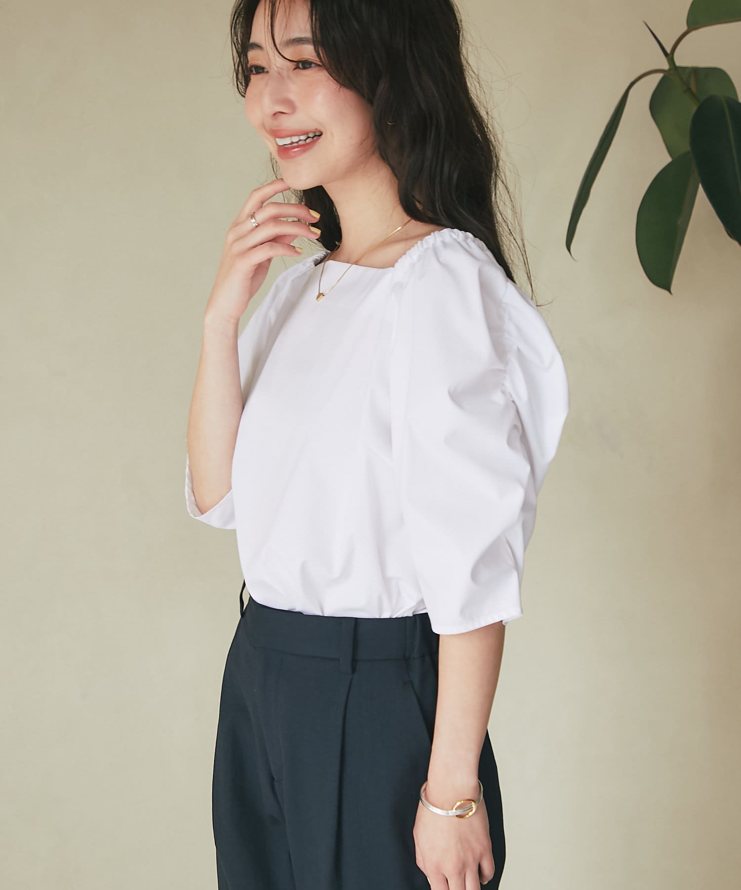 シンプルながらも上品なデザインが目を惹く5分袖ブラウス。