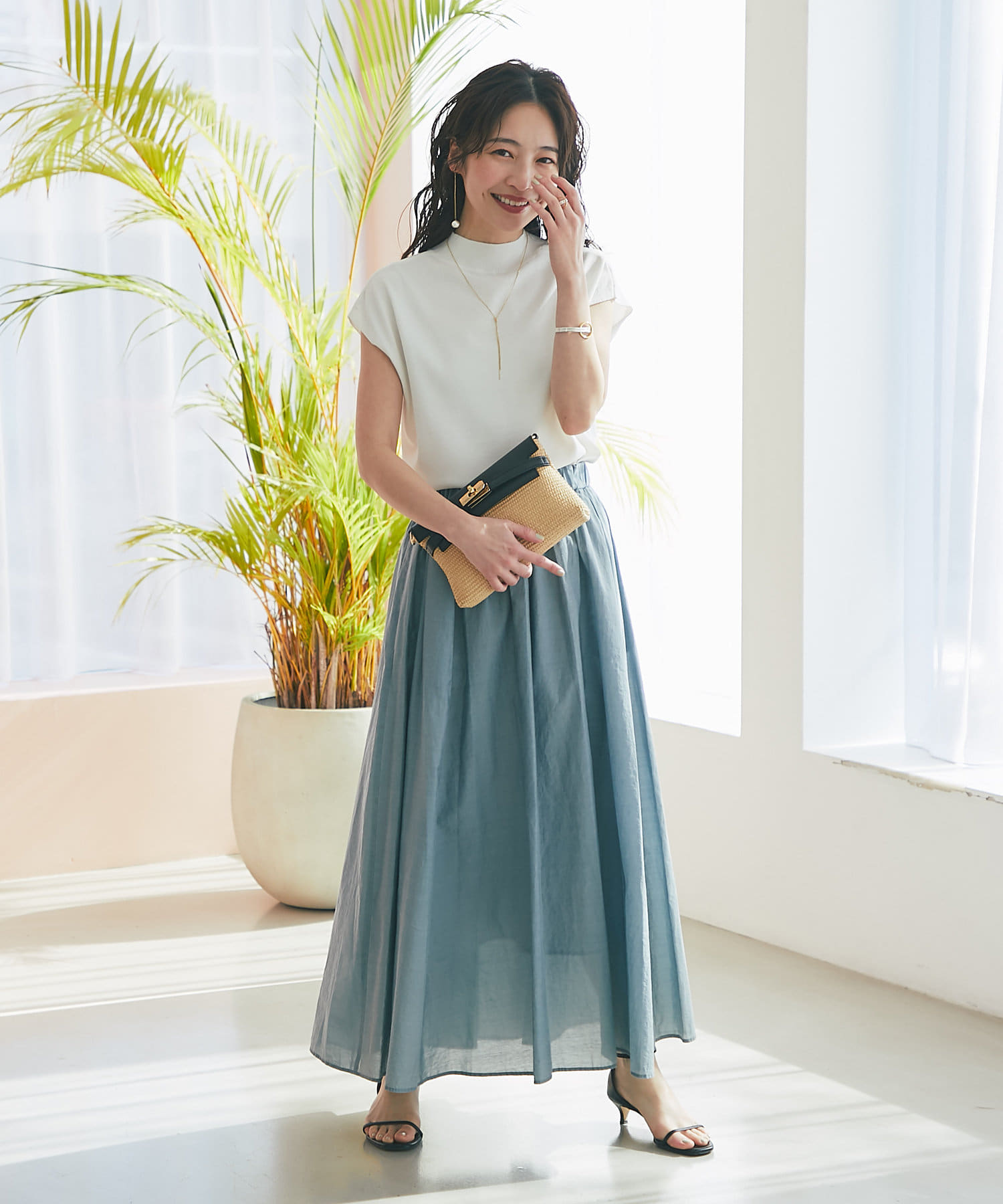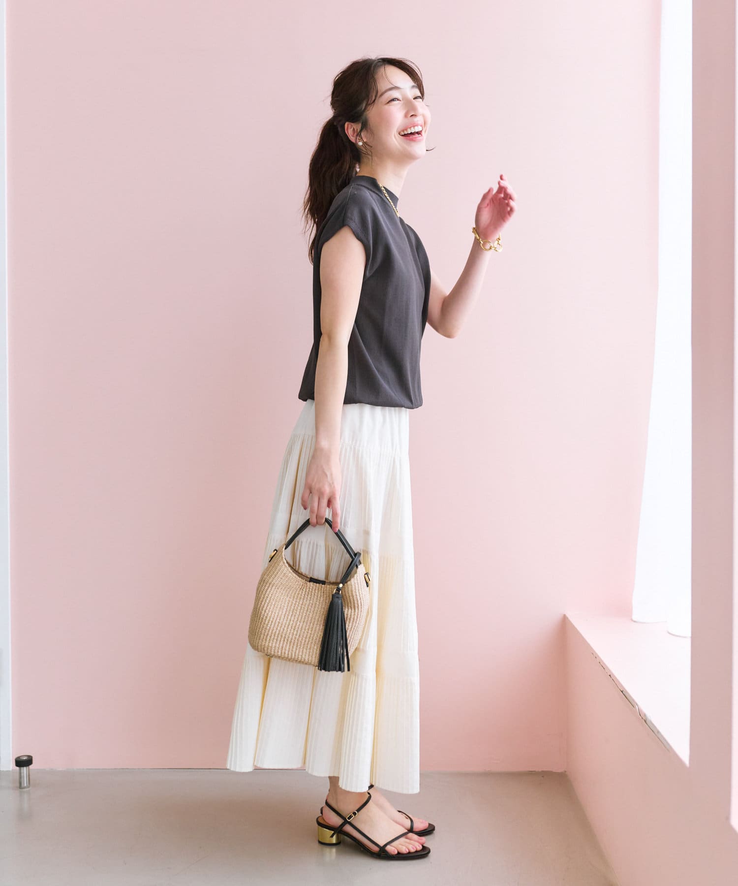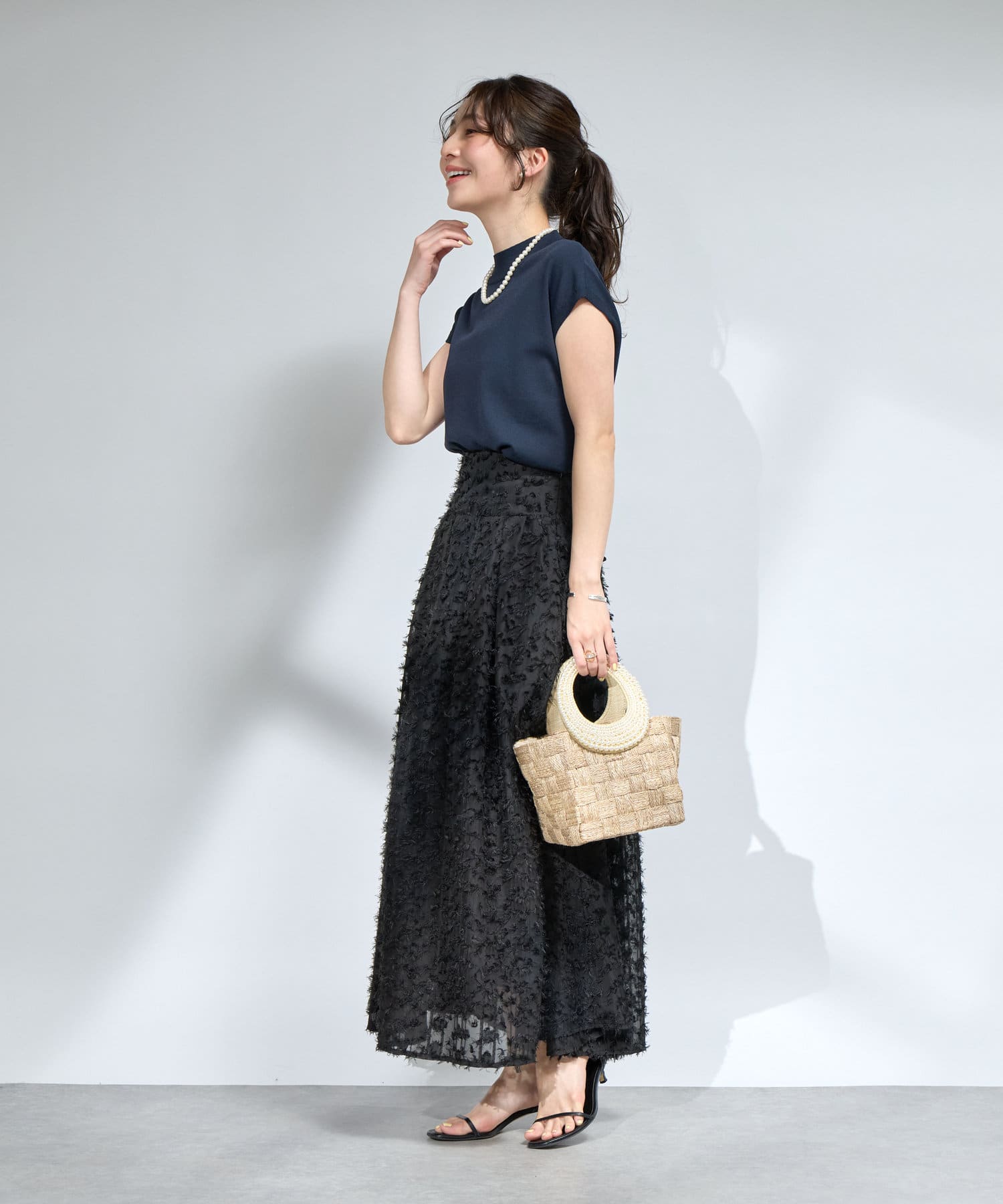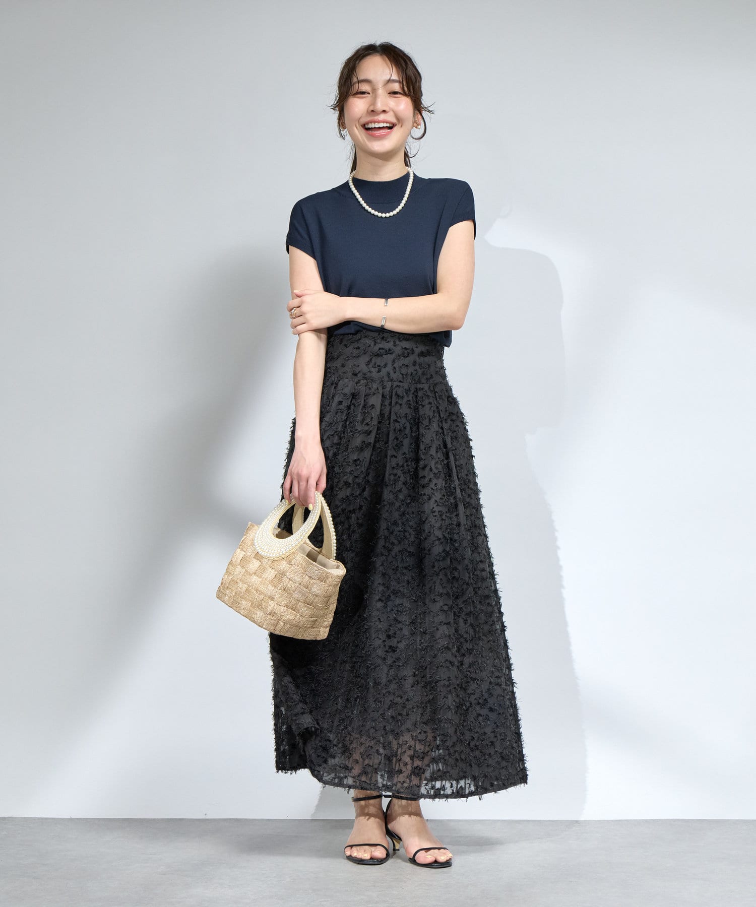 ボリュームのあるスカートに合わせて大人のお出かけスタイルに。