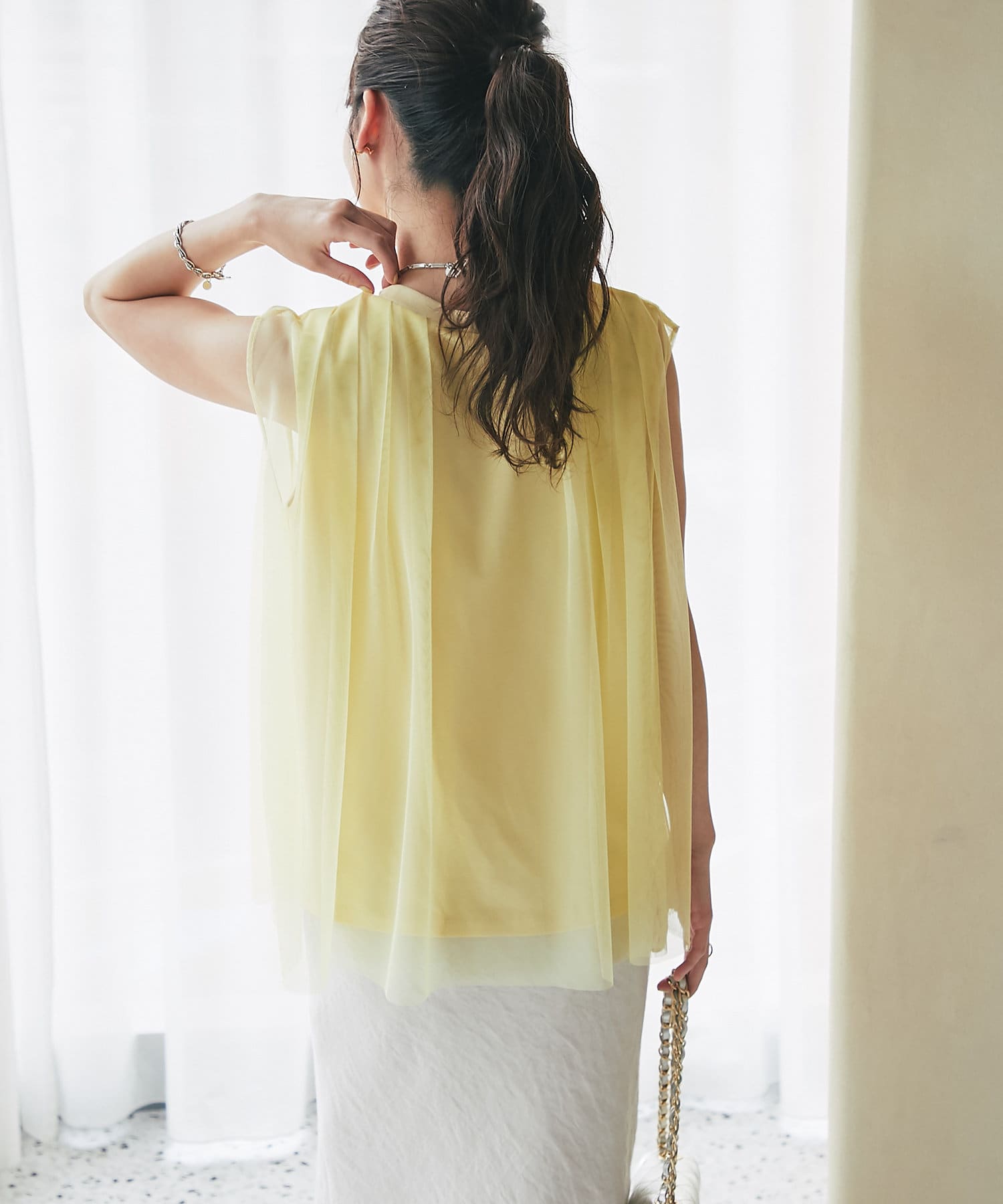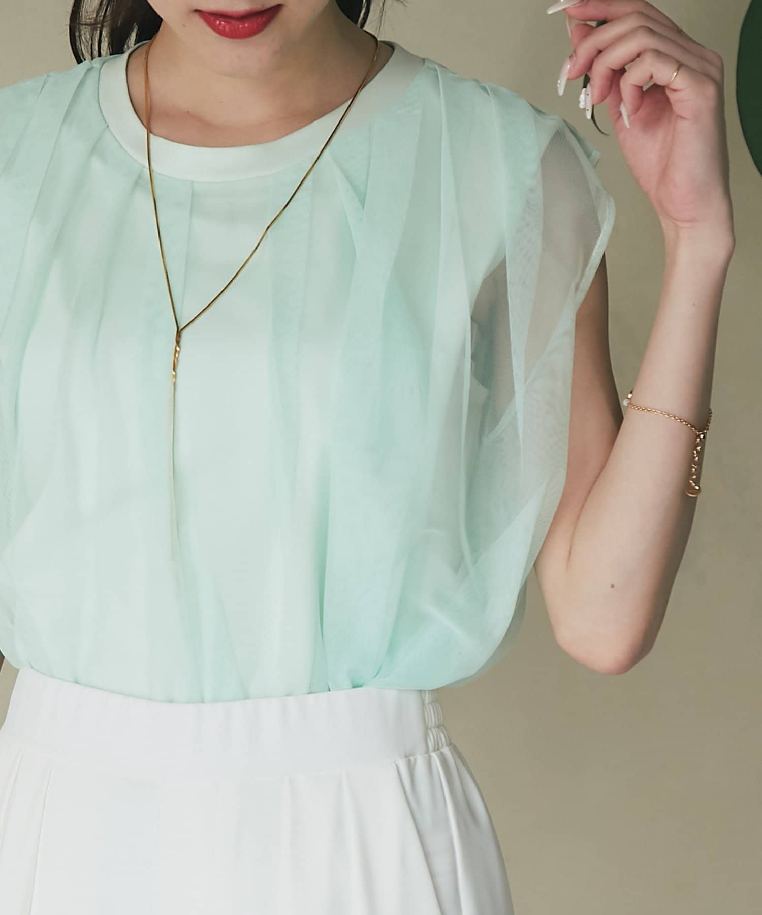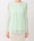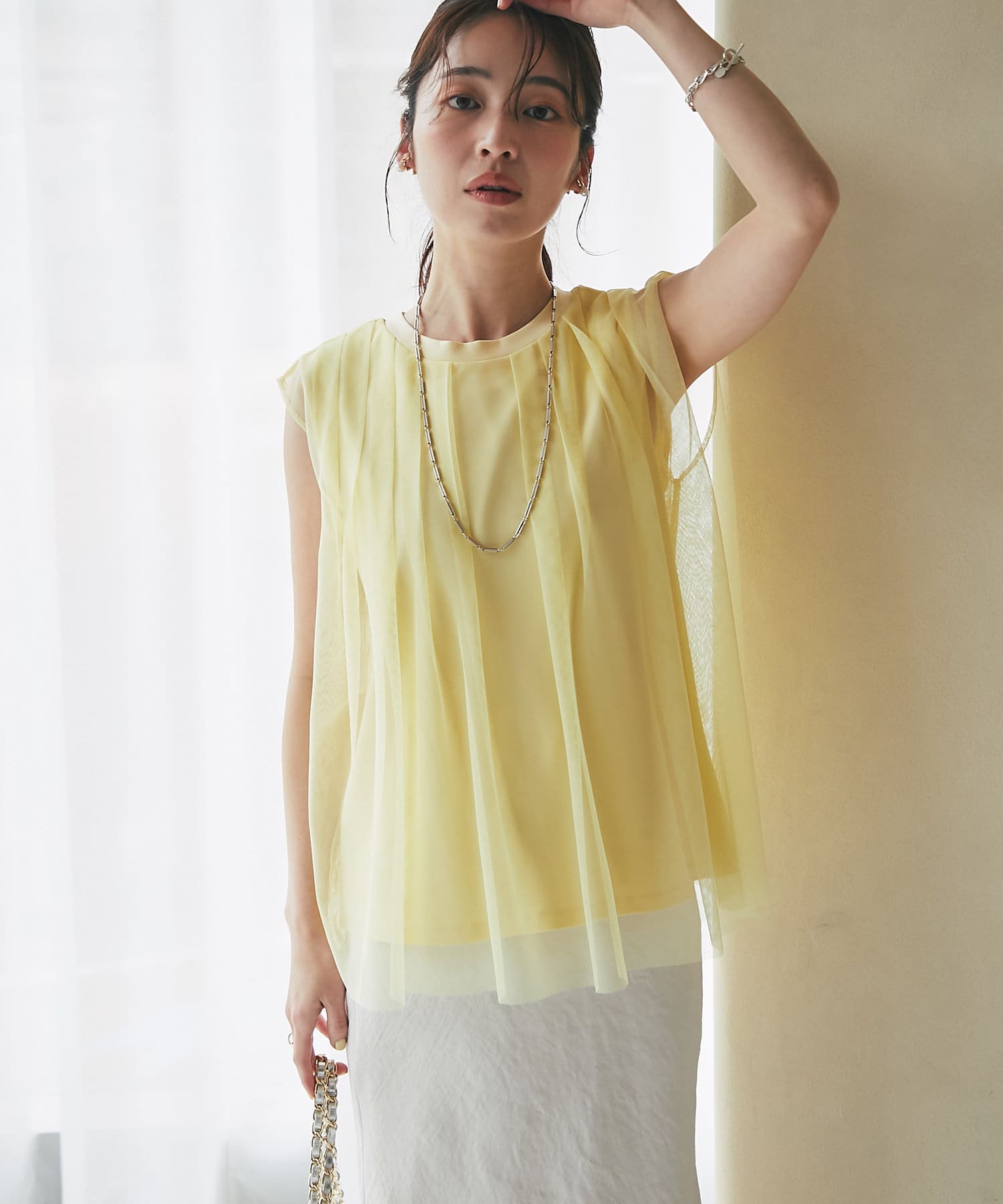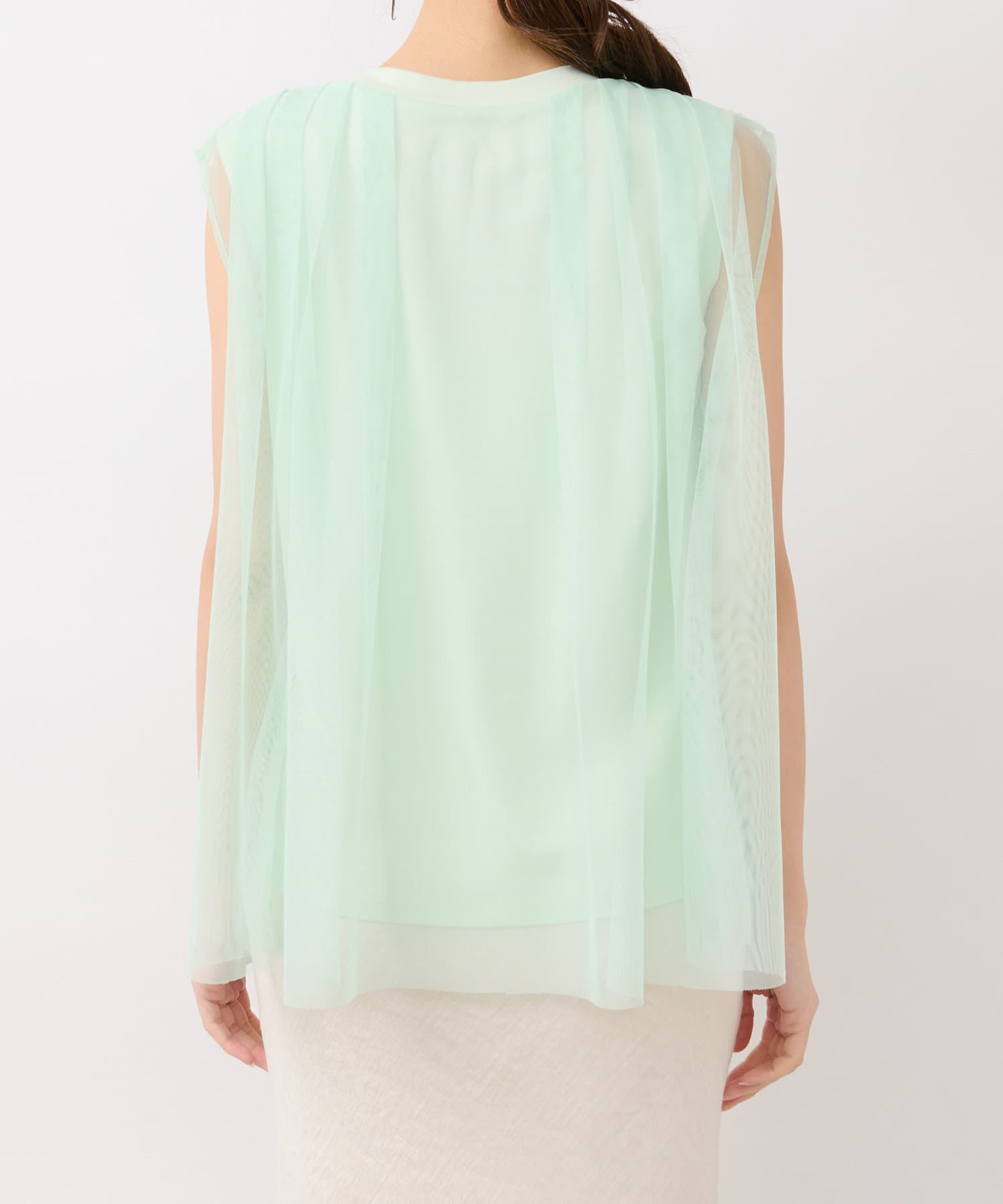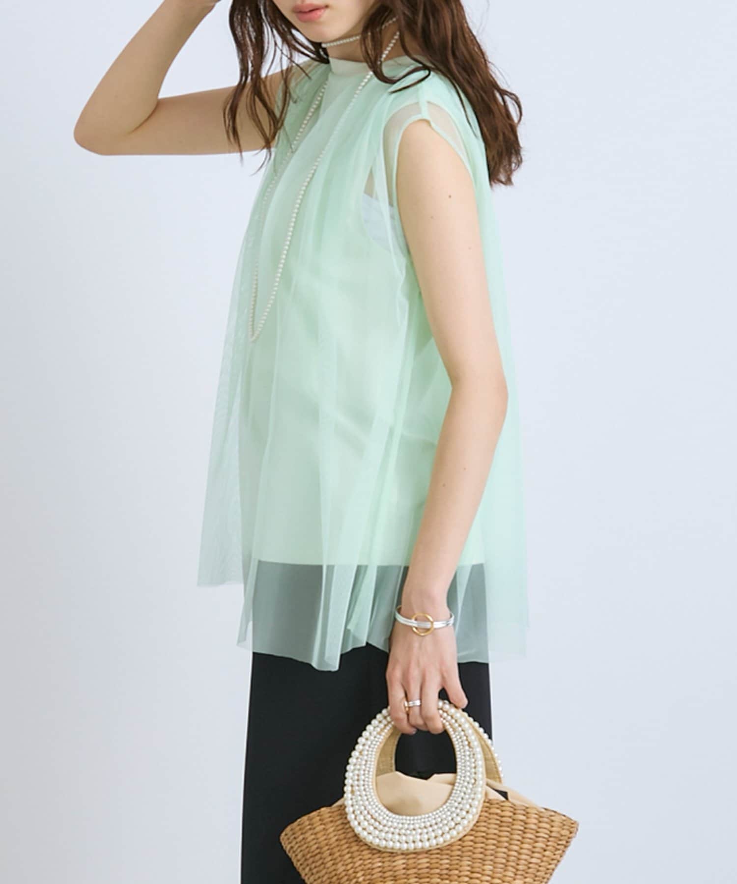 ノースリブのTシャツにチュールのブラウスを重ね着したような今っぽさが魅力で、