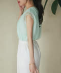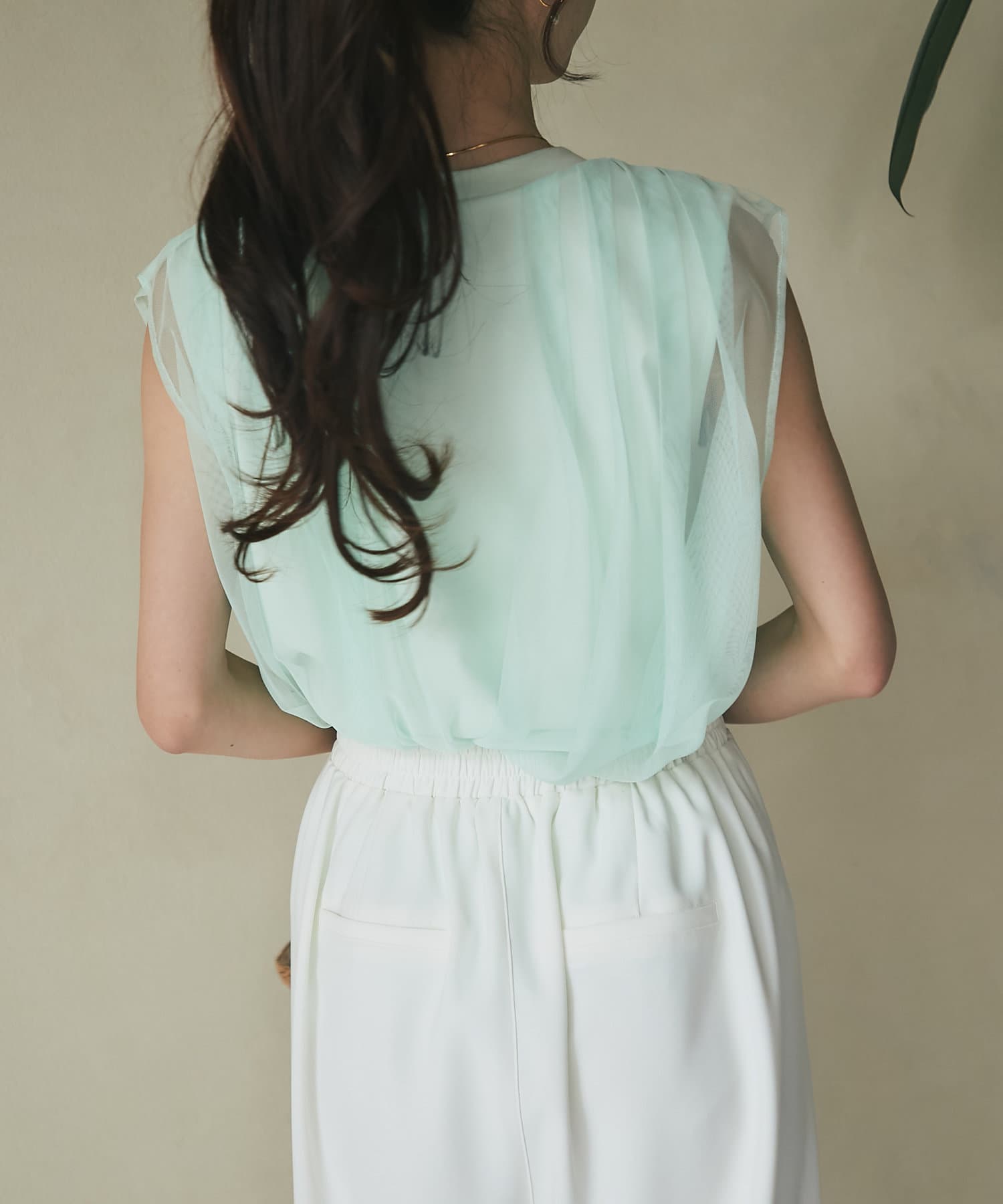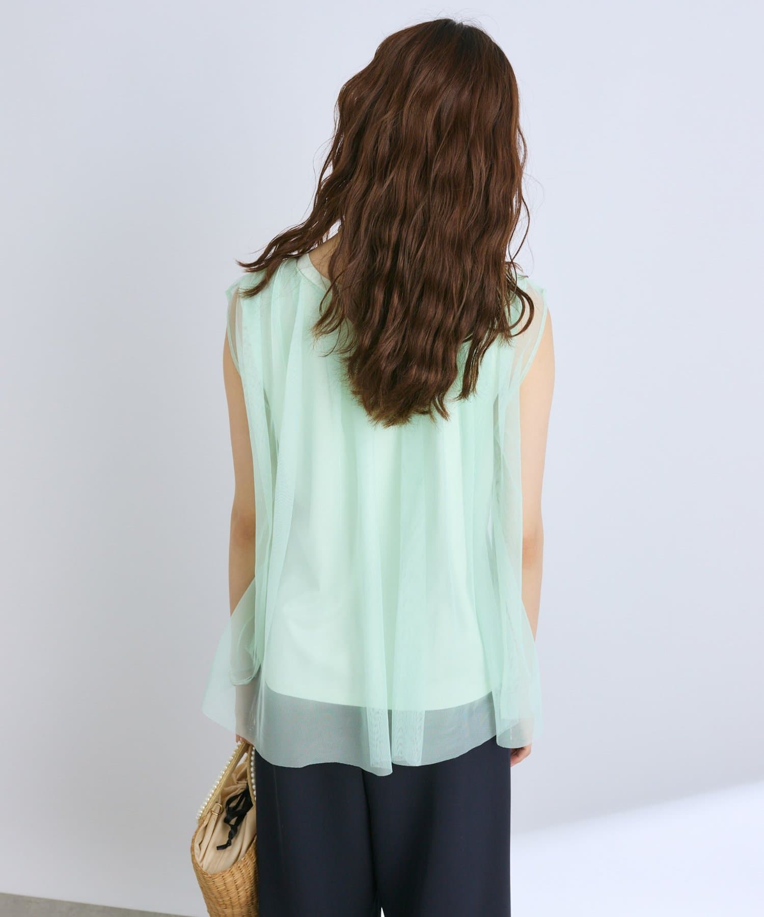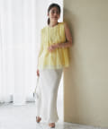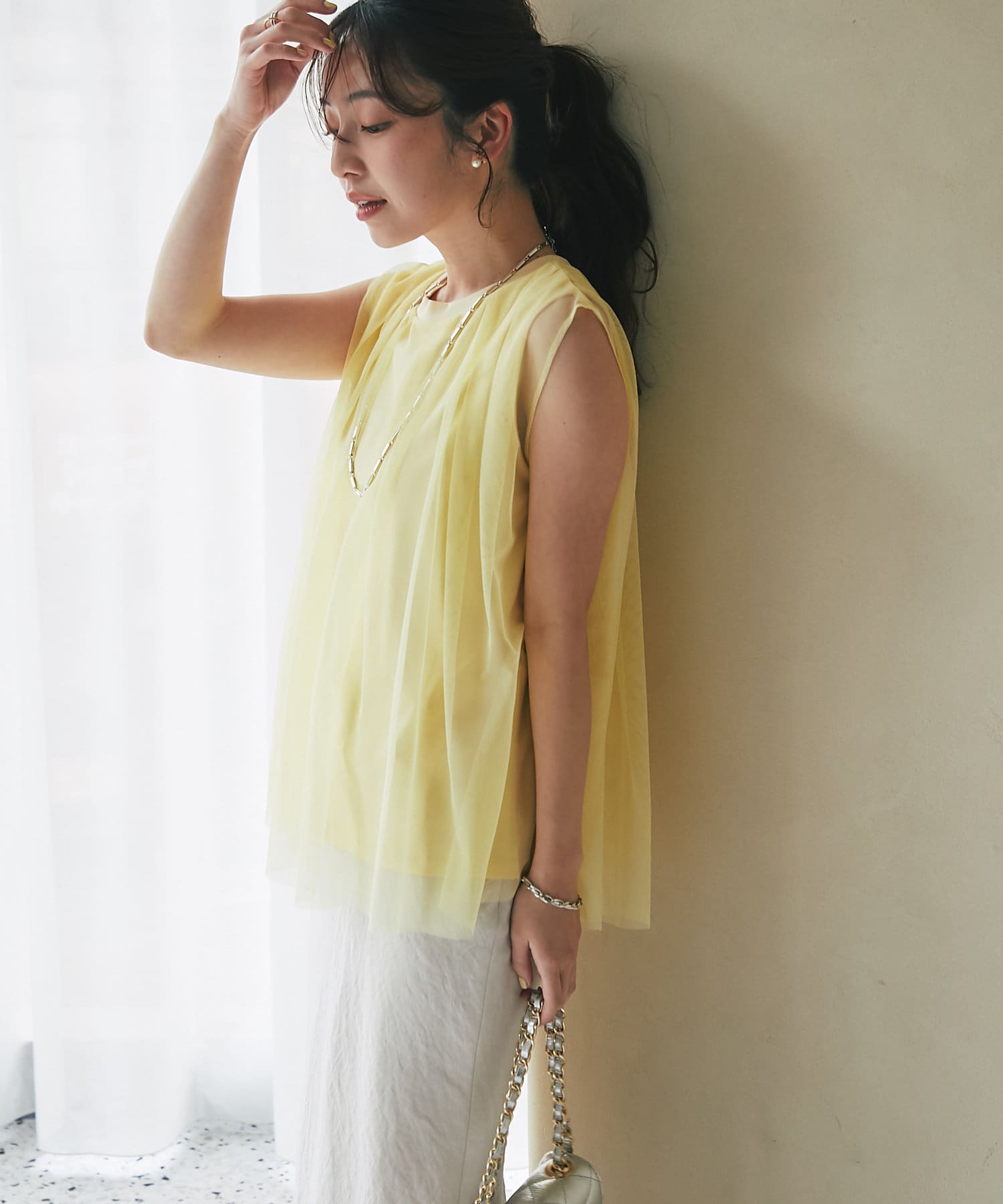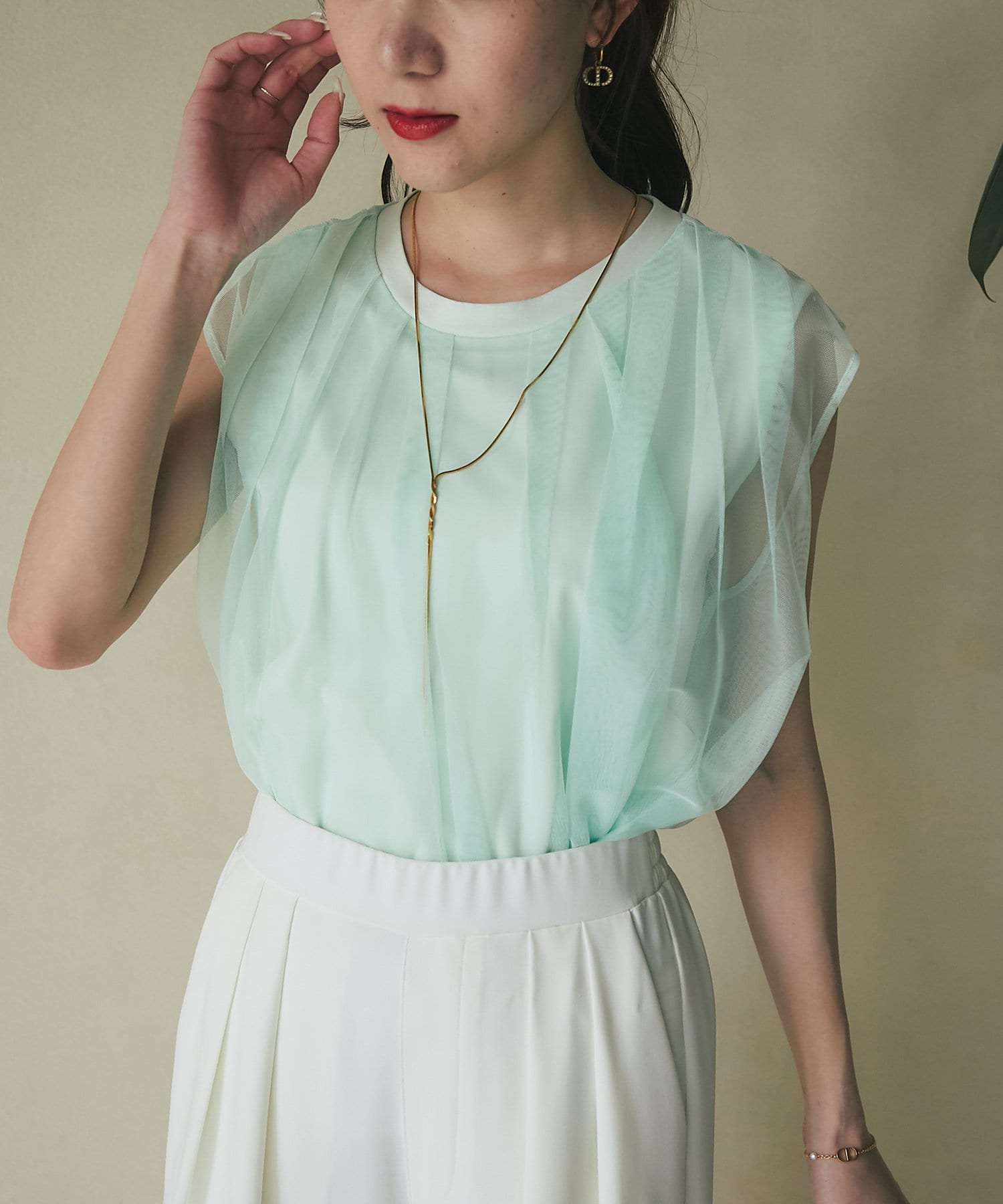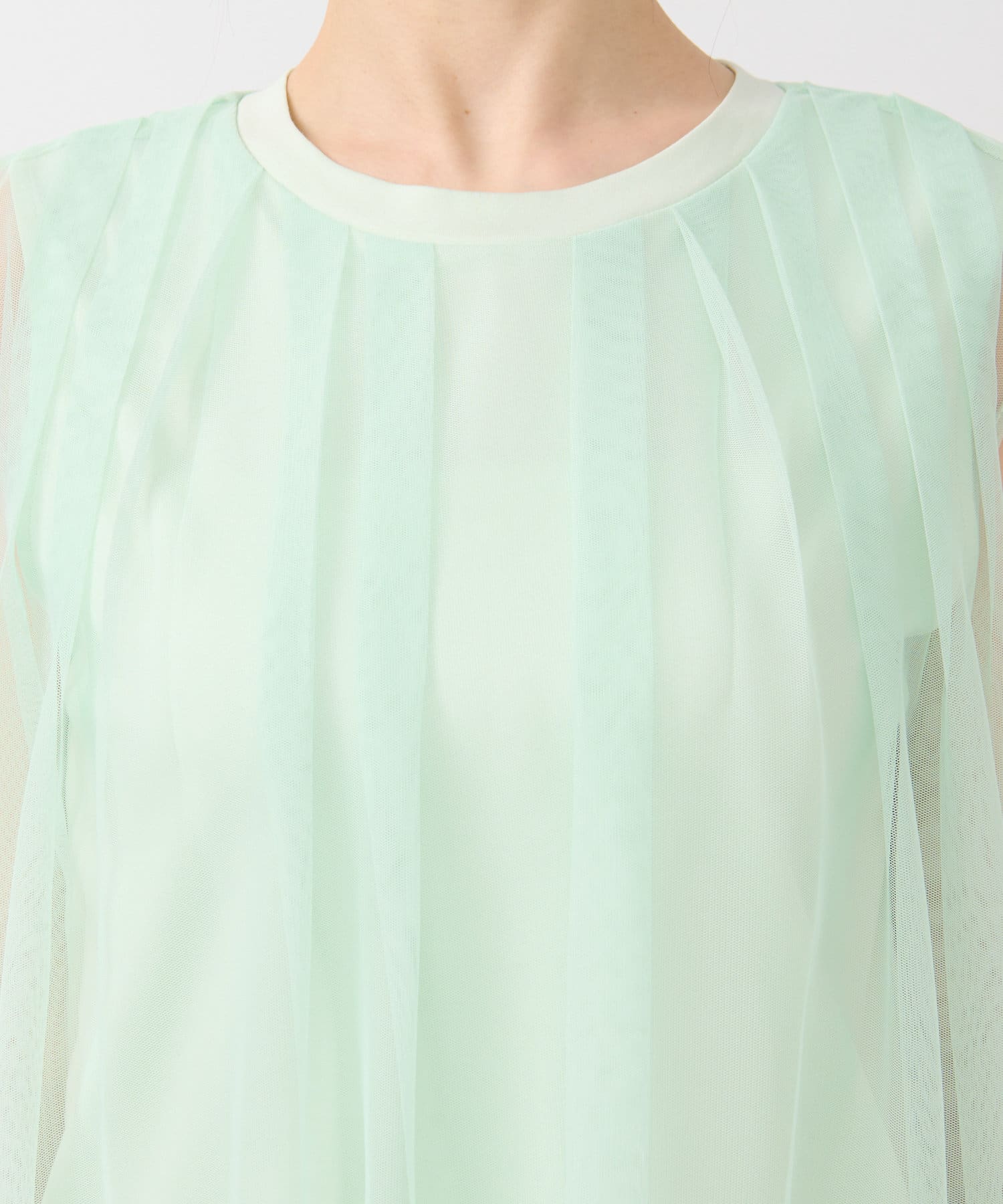 ノースリブのTシャツにチュールのブラウスを重ね着したような今っぽさが魅力で、