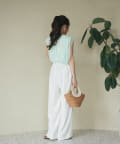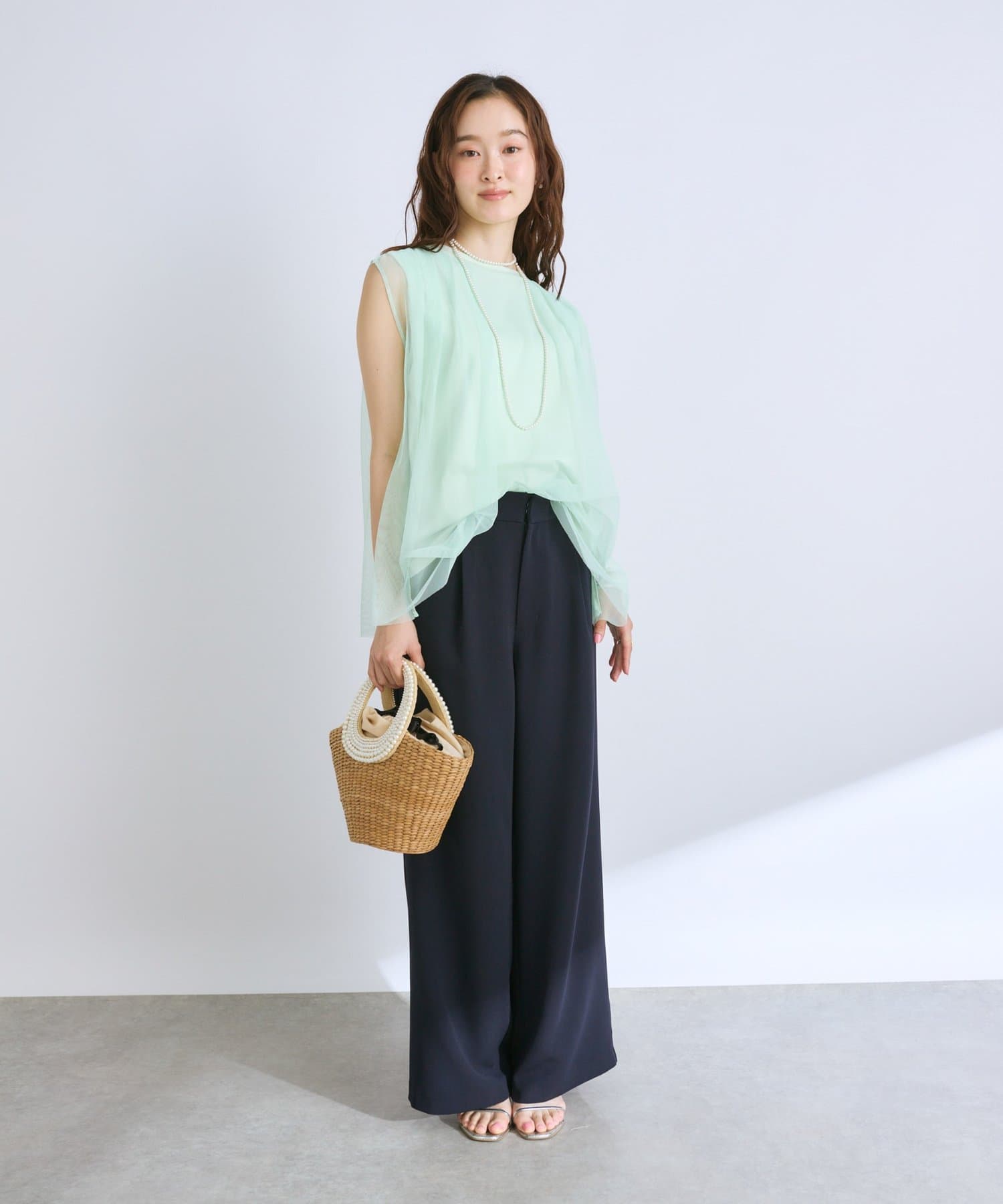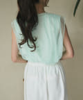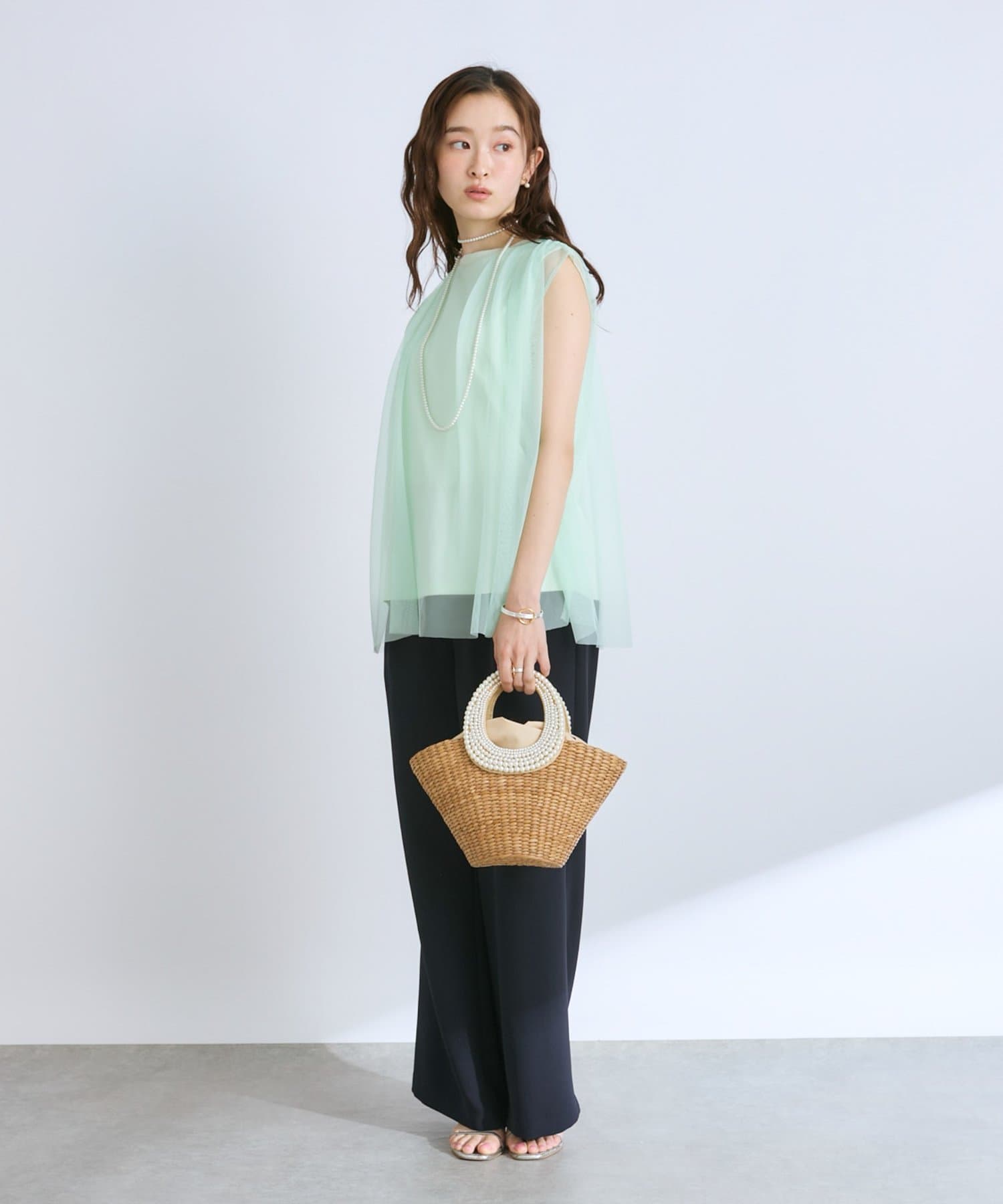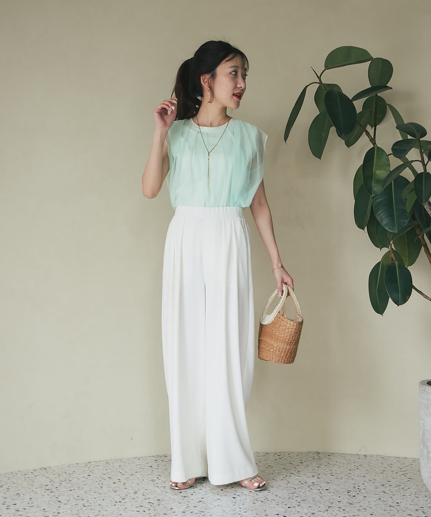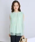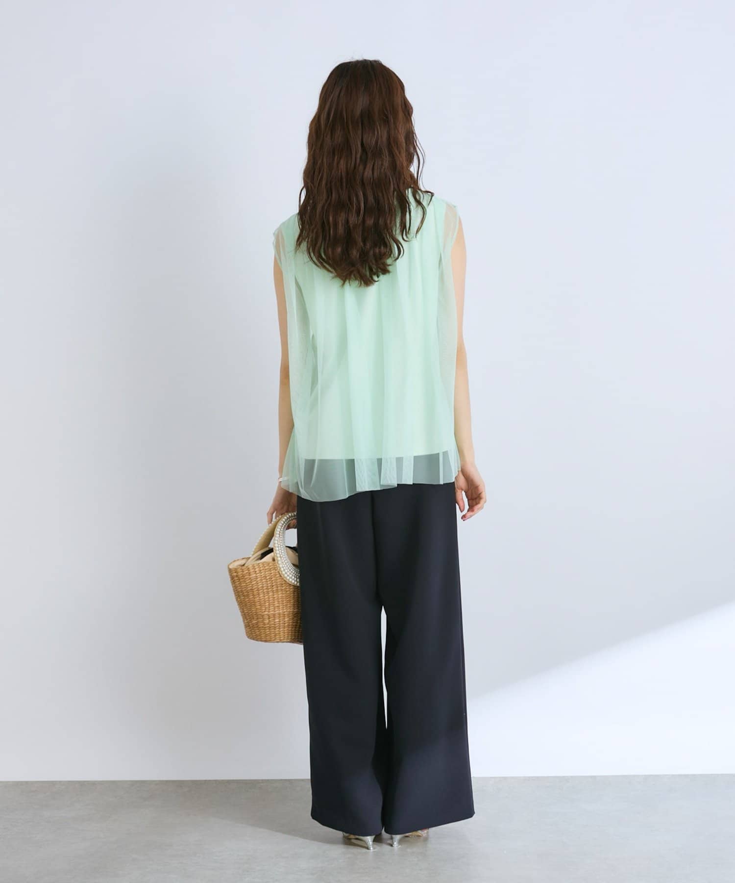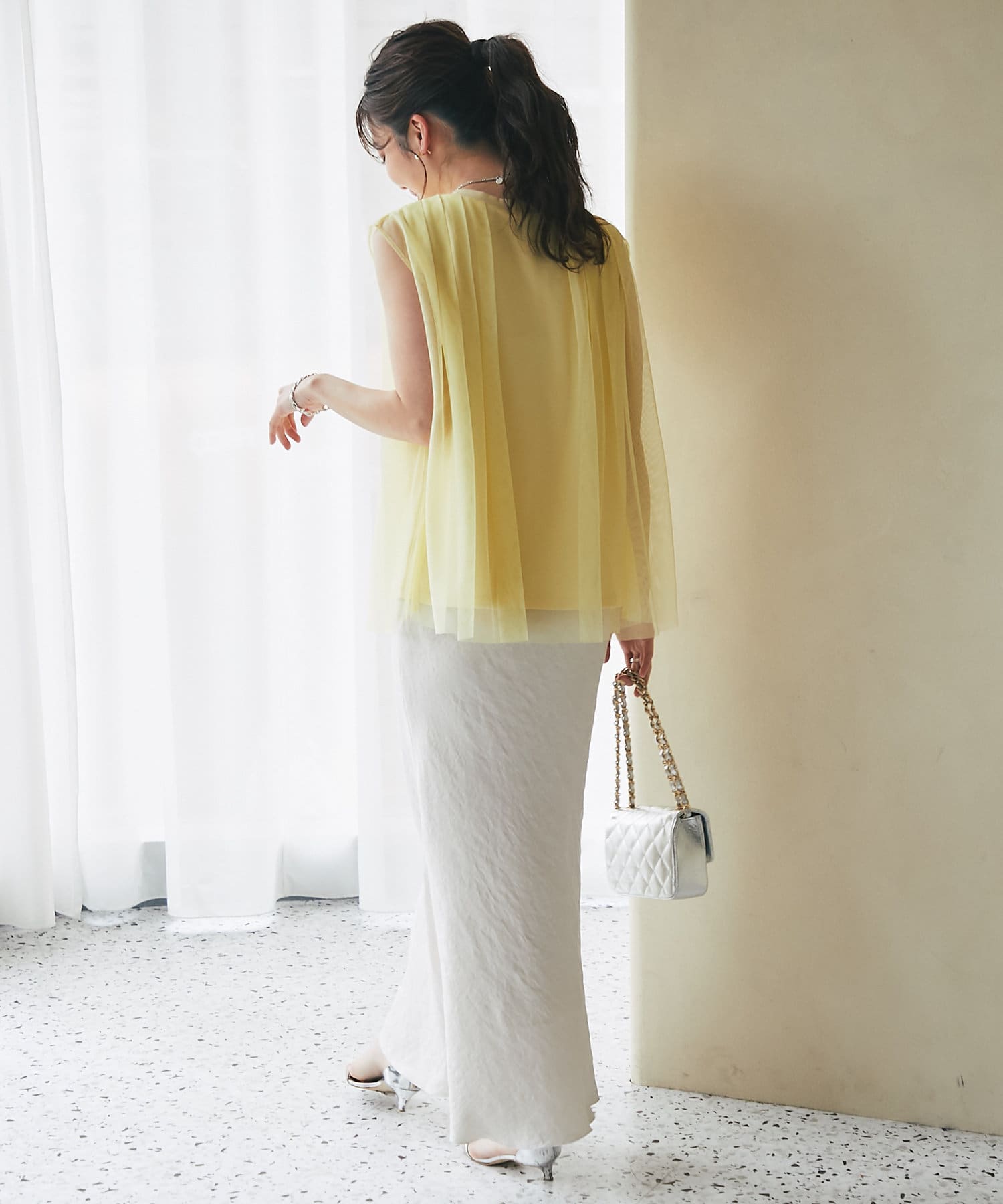 ノースリブのTシャツにチュールのブラウスを重ね着したような今っぽさが魅力で、