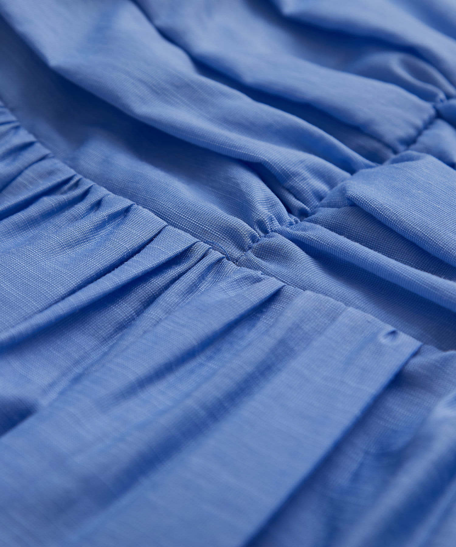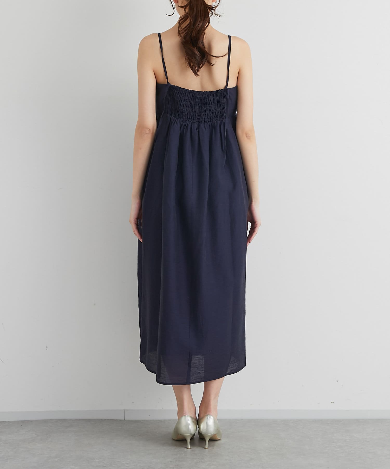 バスト部分はギャザーを寄せているので、女性らしい柔らかな印象を与えつつ、気になる部分をさりげなくカバー。