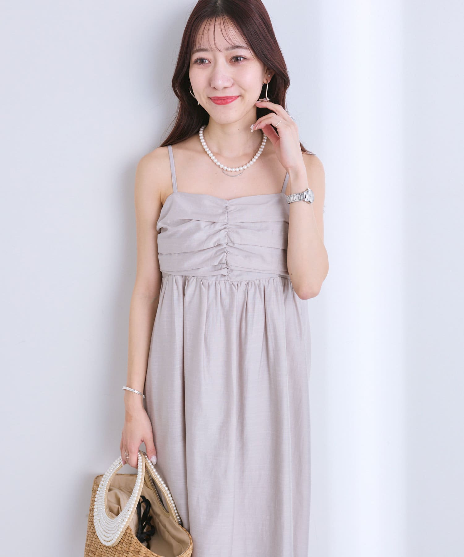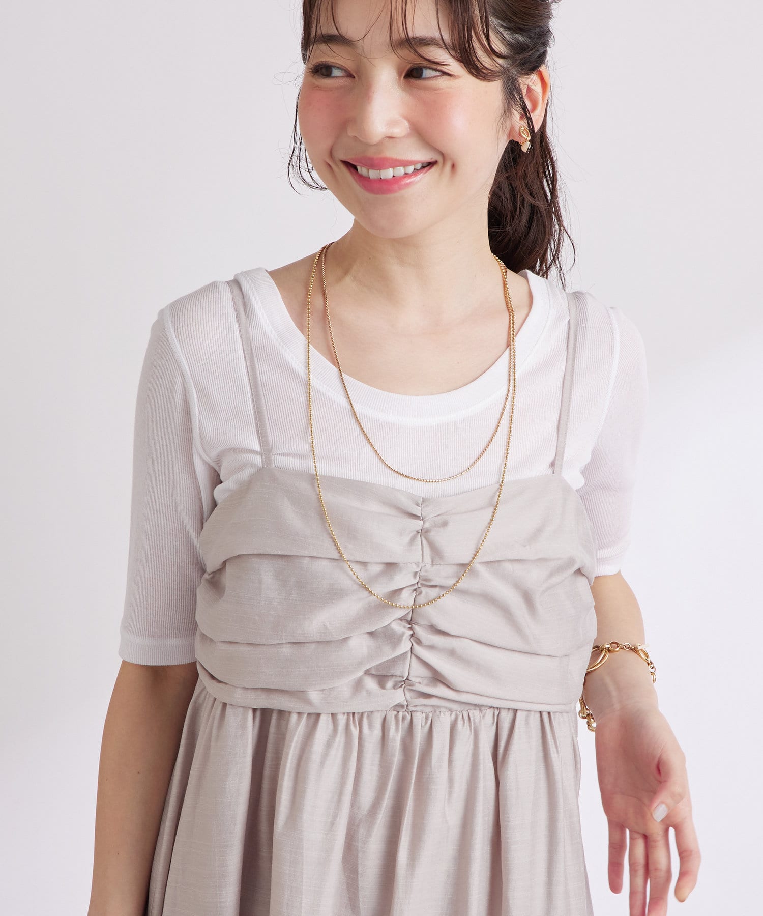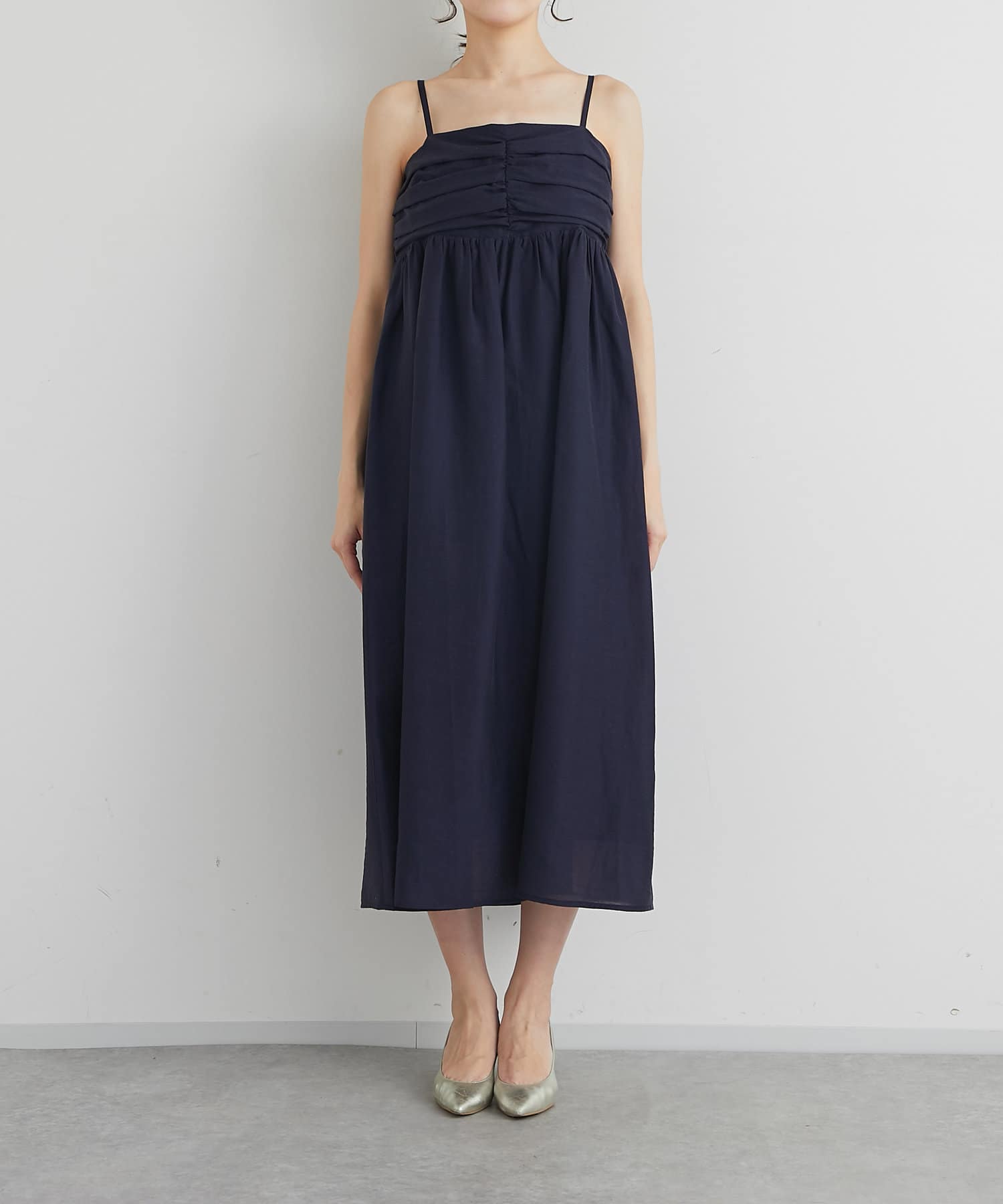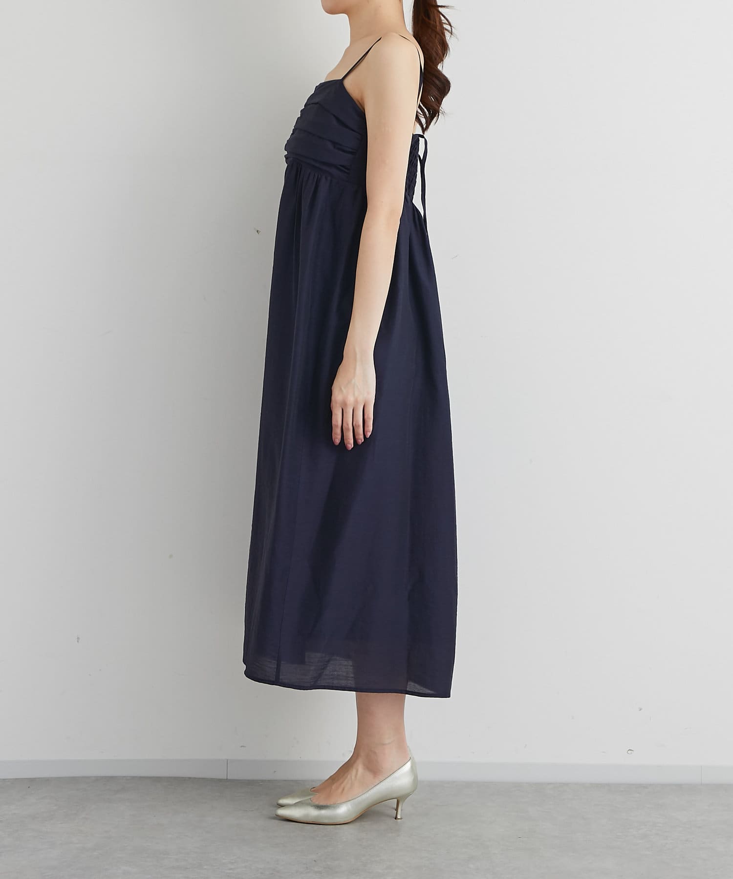 バスト部分はギャザーを寄せているので、女性らしい柔らかな印象を与えつつ、気になる部分をさりげなくカバー。