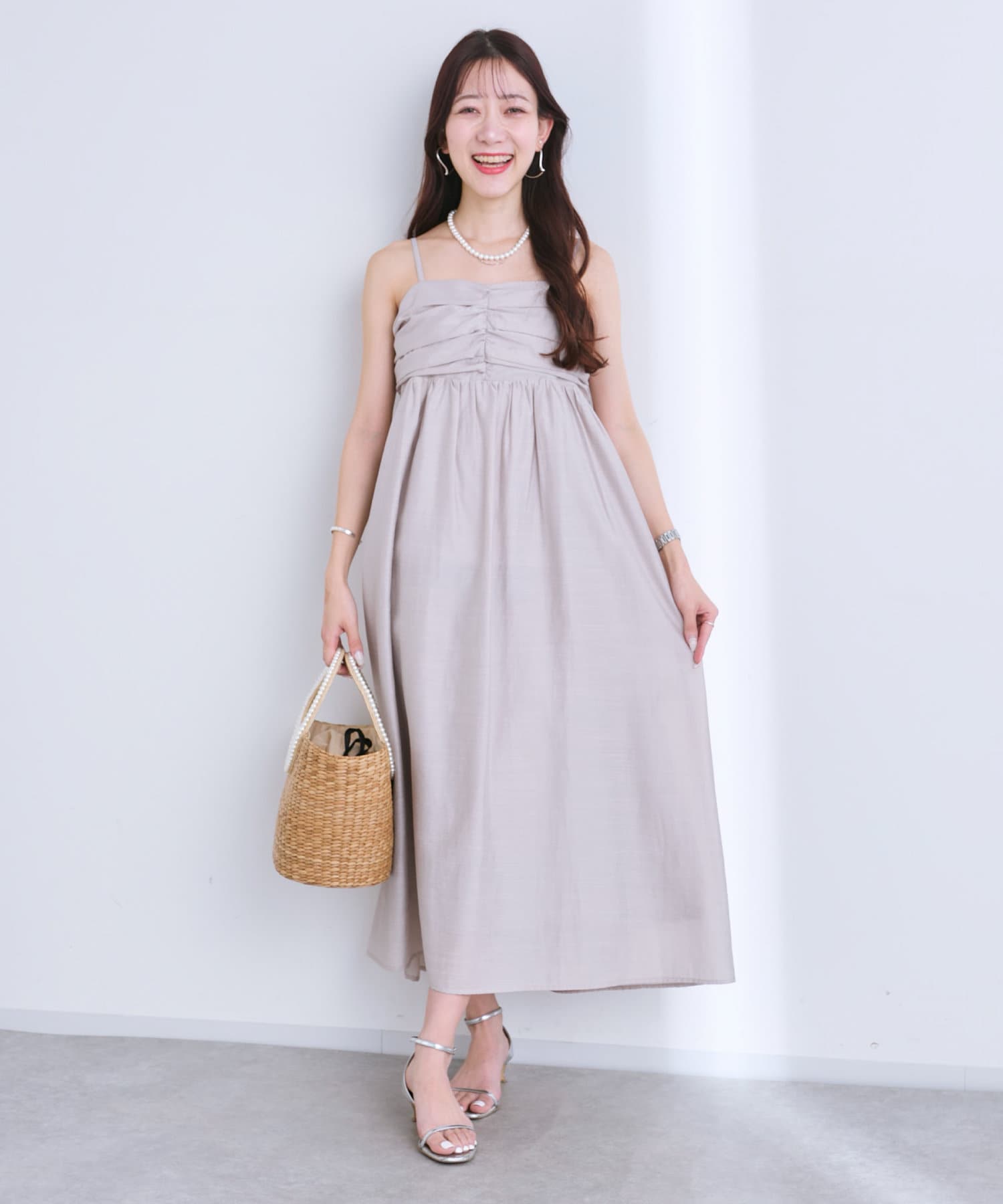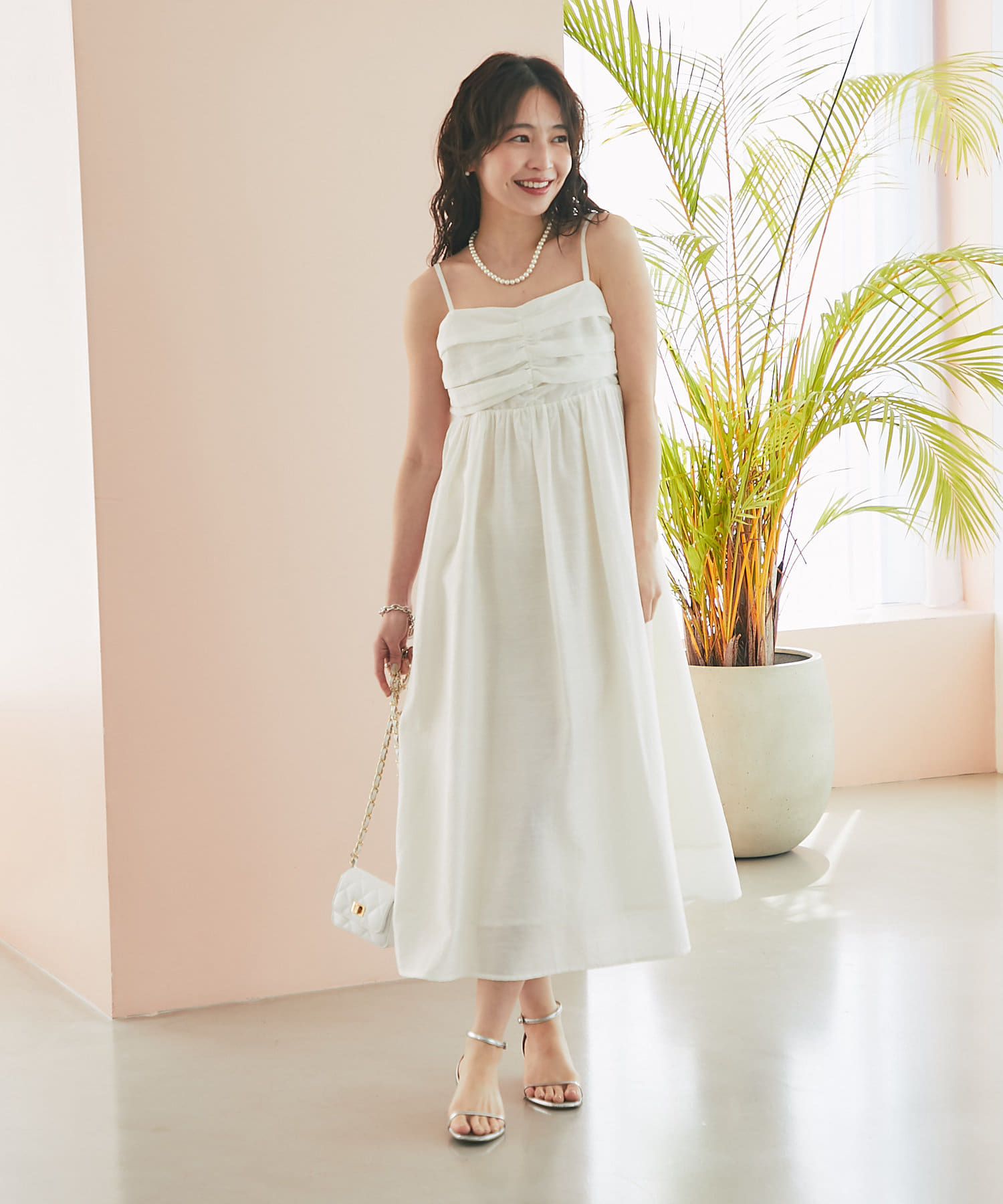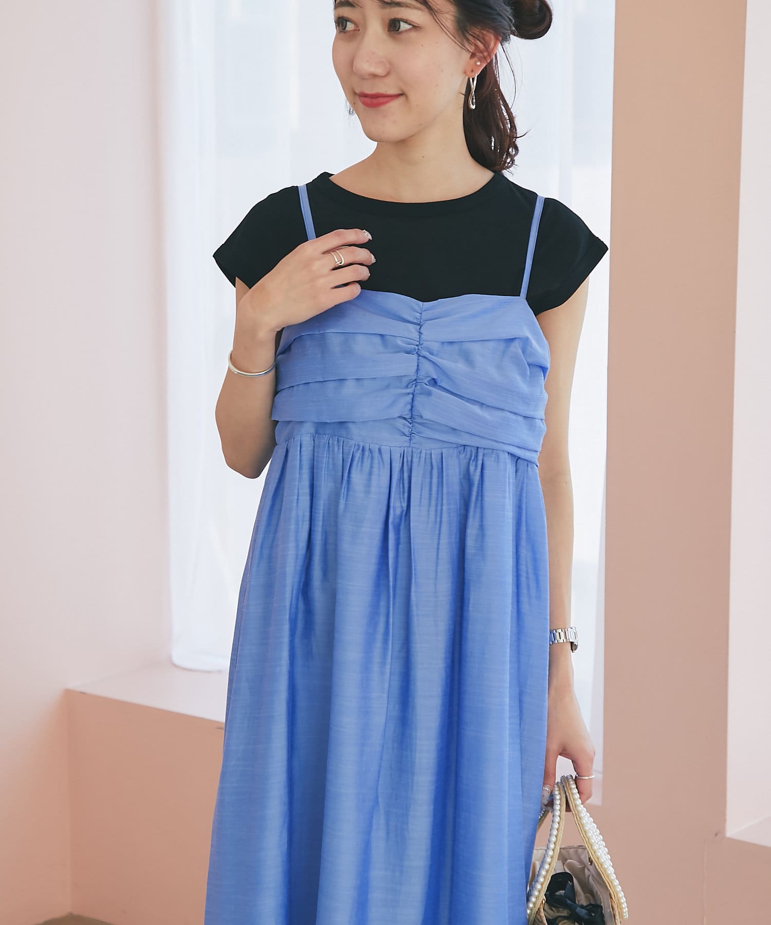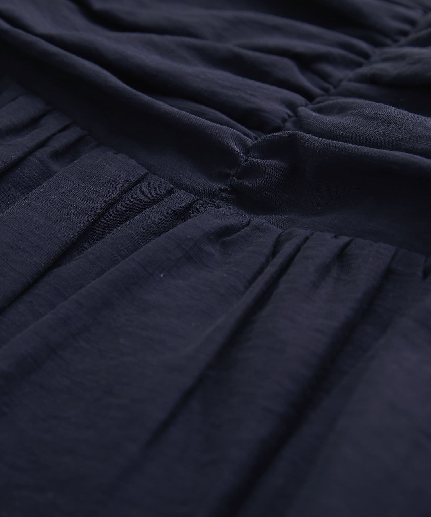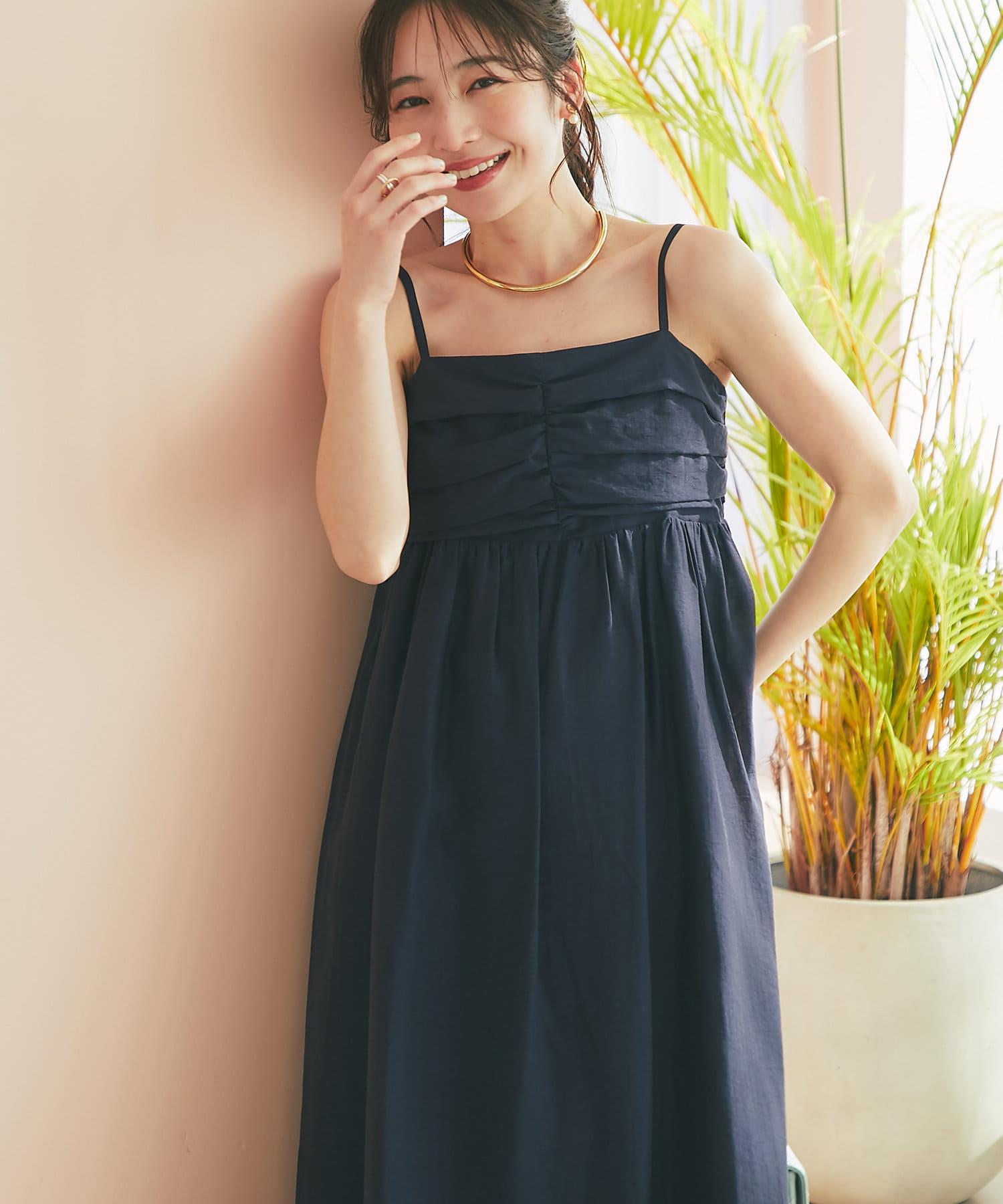 バスト部分はギャザーを寄せているので、女性らしい柔らかな印象を与えつつ、気になる部分をさりげなくカバー。