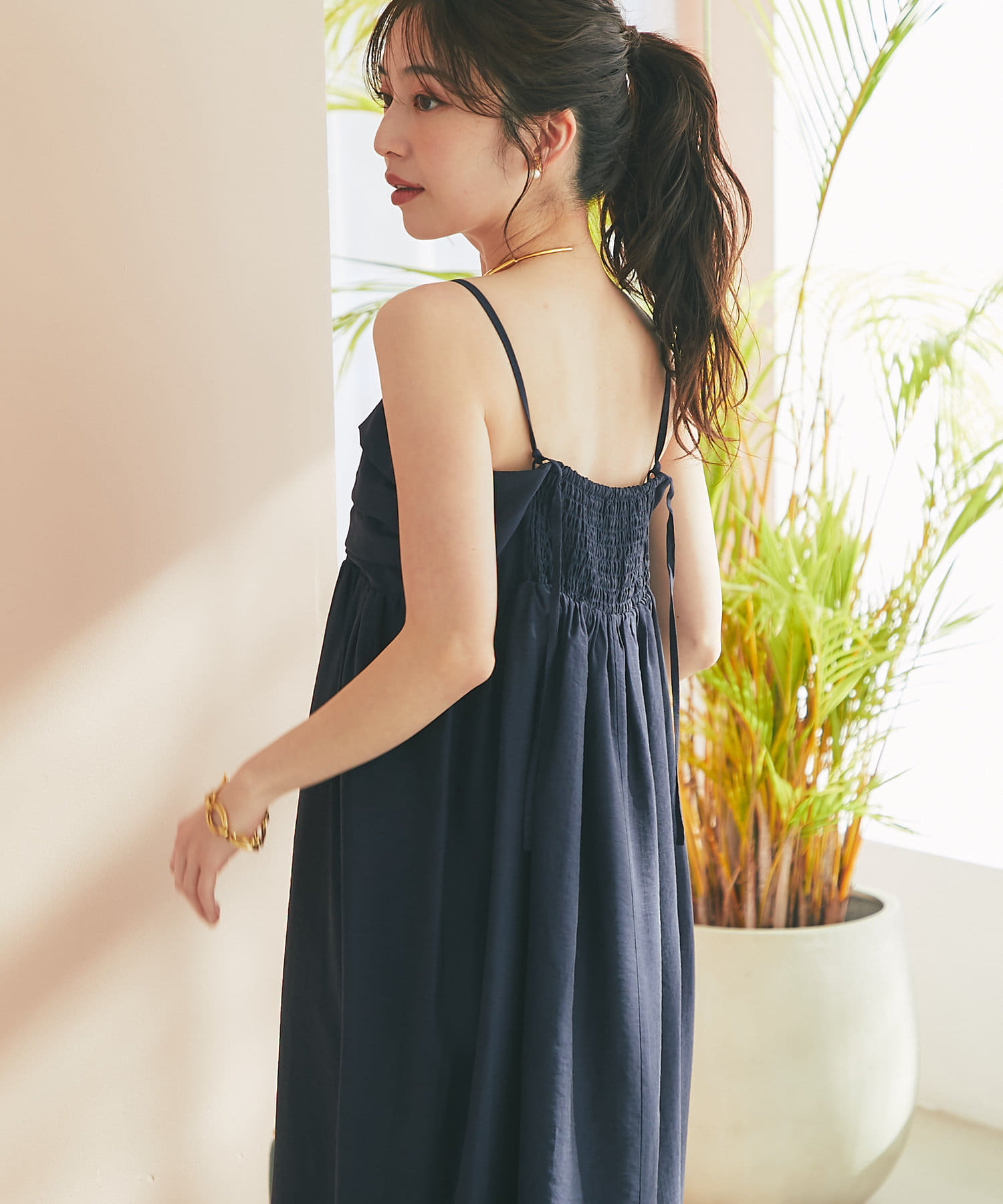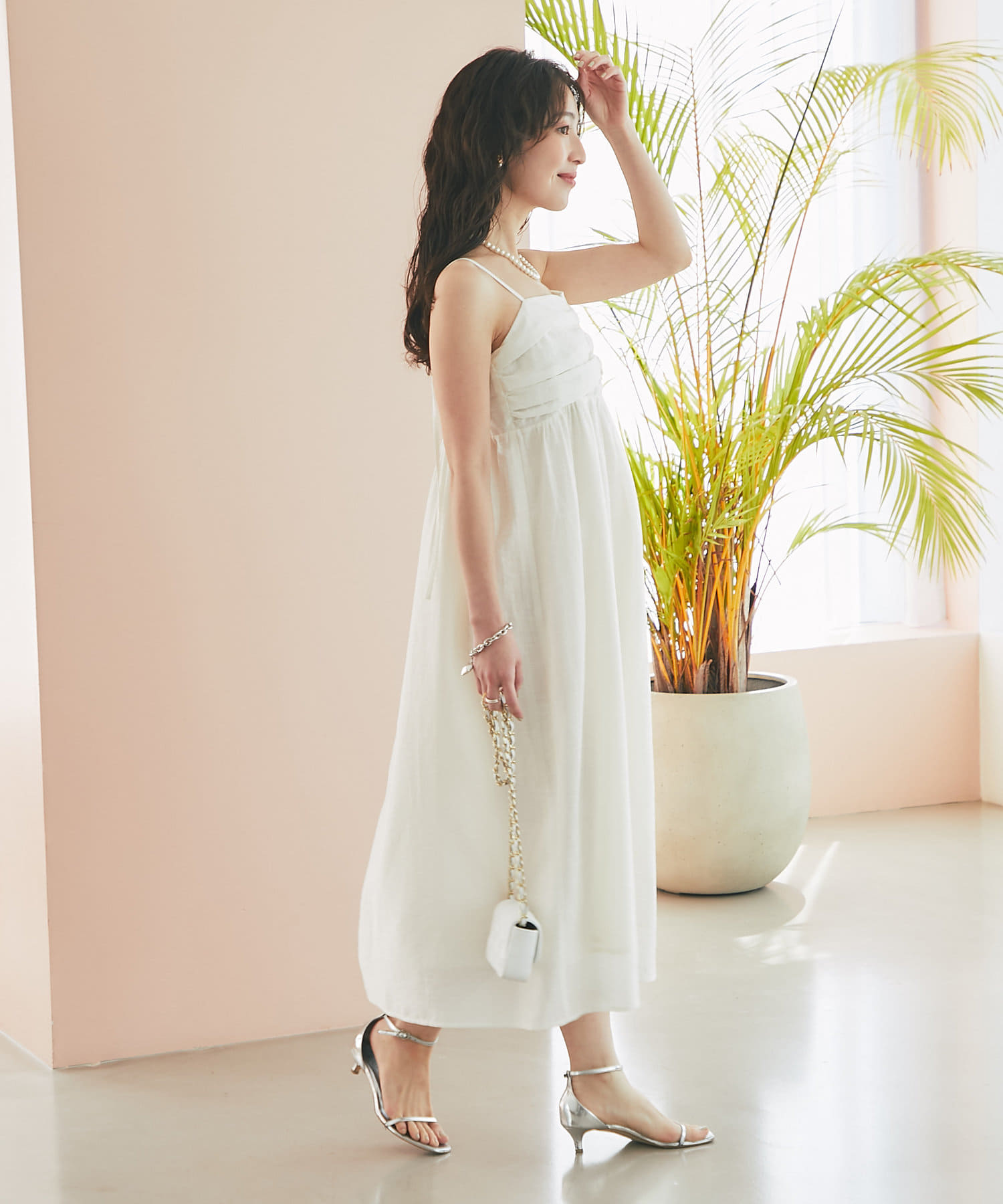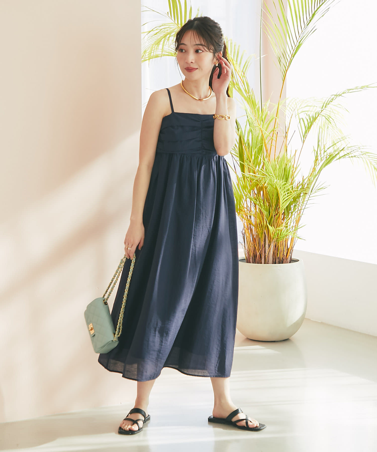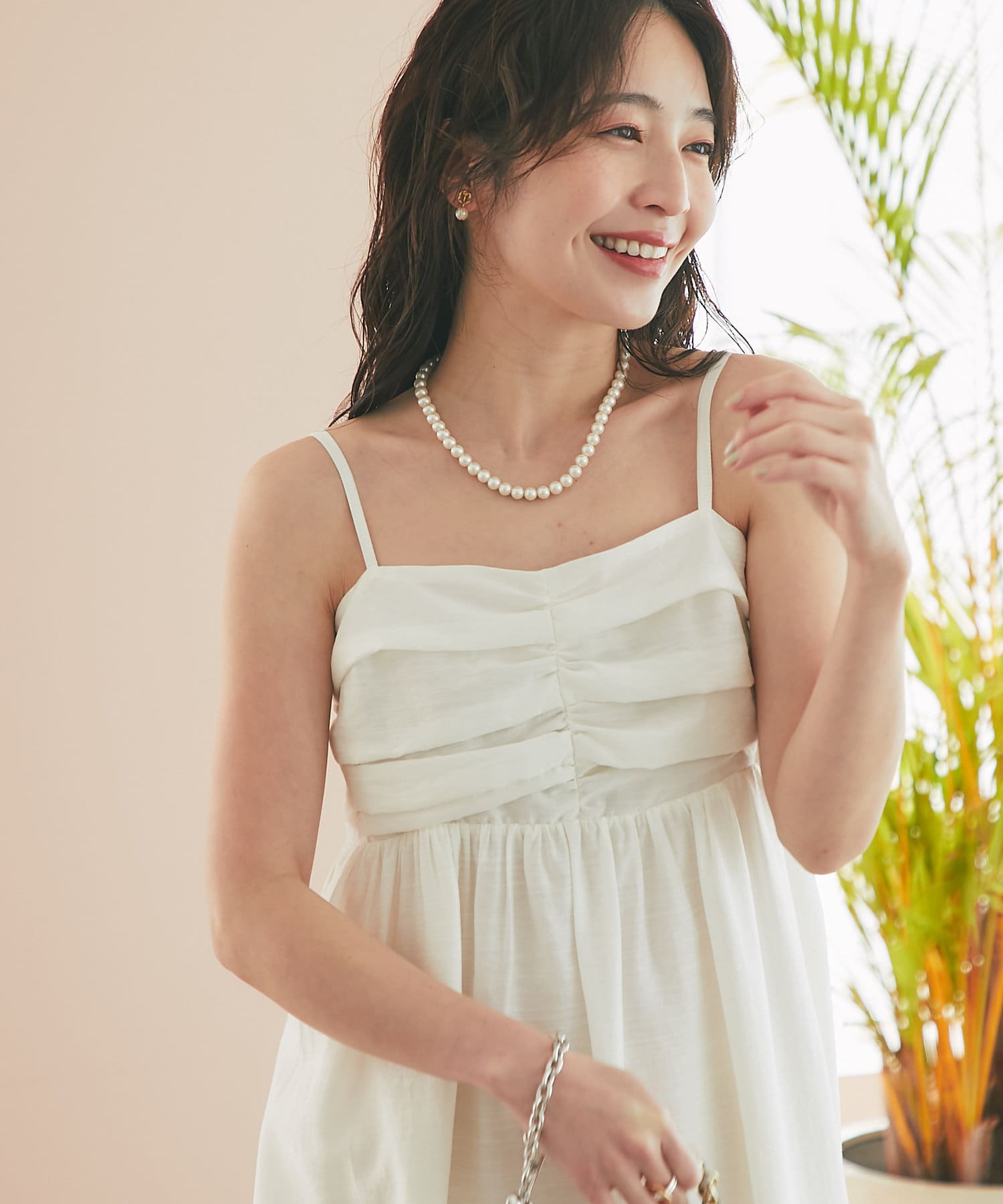 バスト部分はギャザーを寄せているので、女性らしい柔らかな印象を与えつつ、気になる部分をさりげなくカバー。