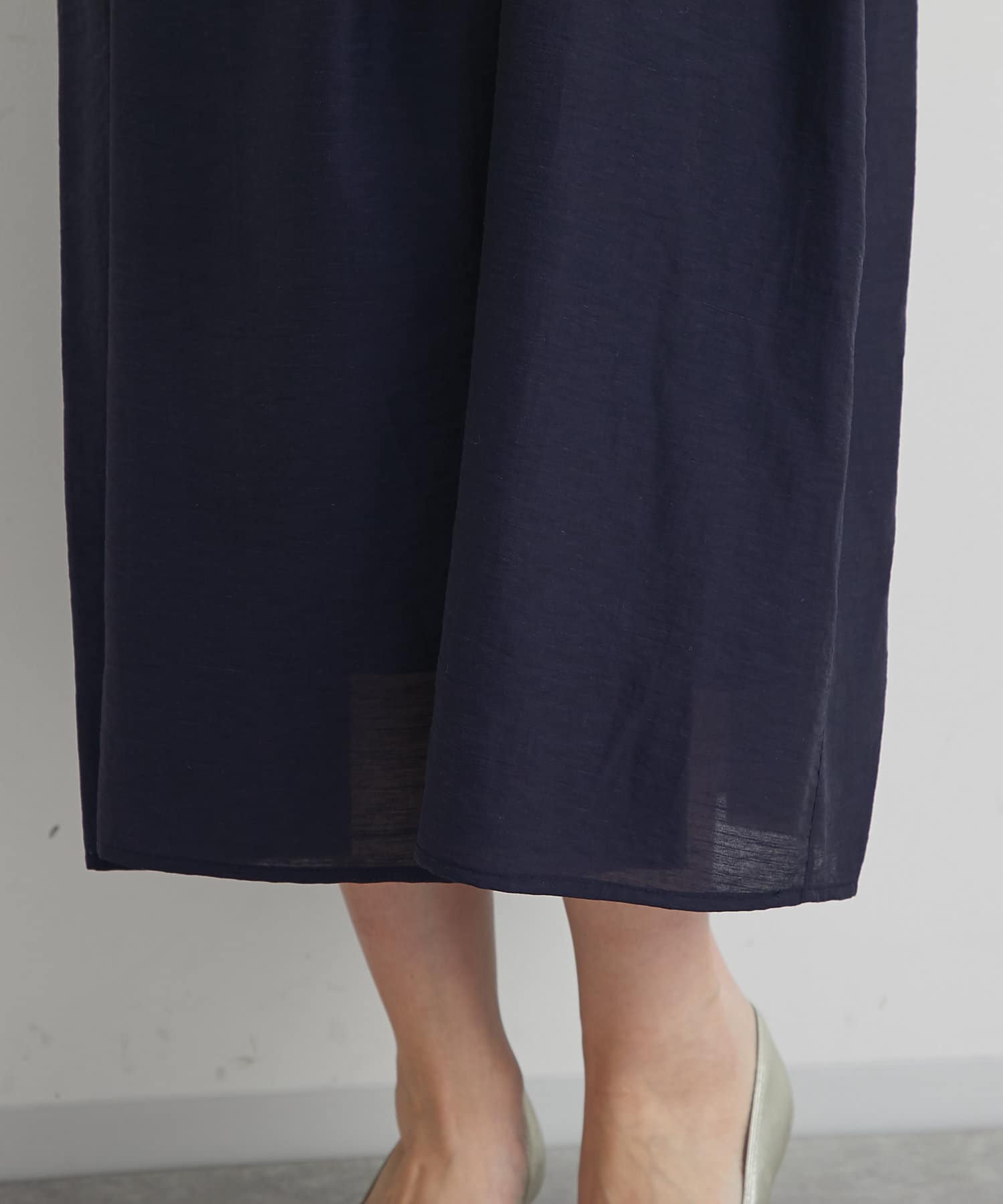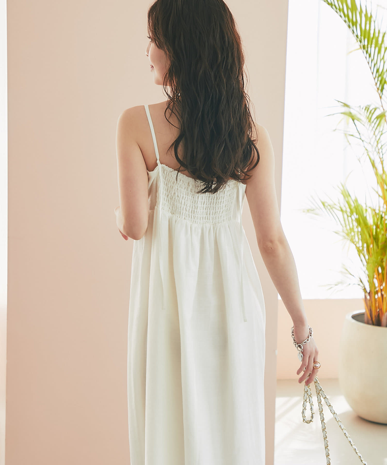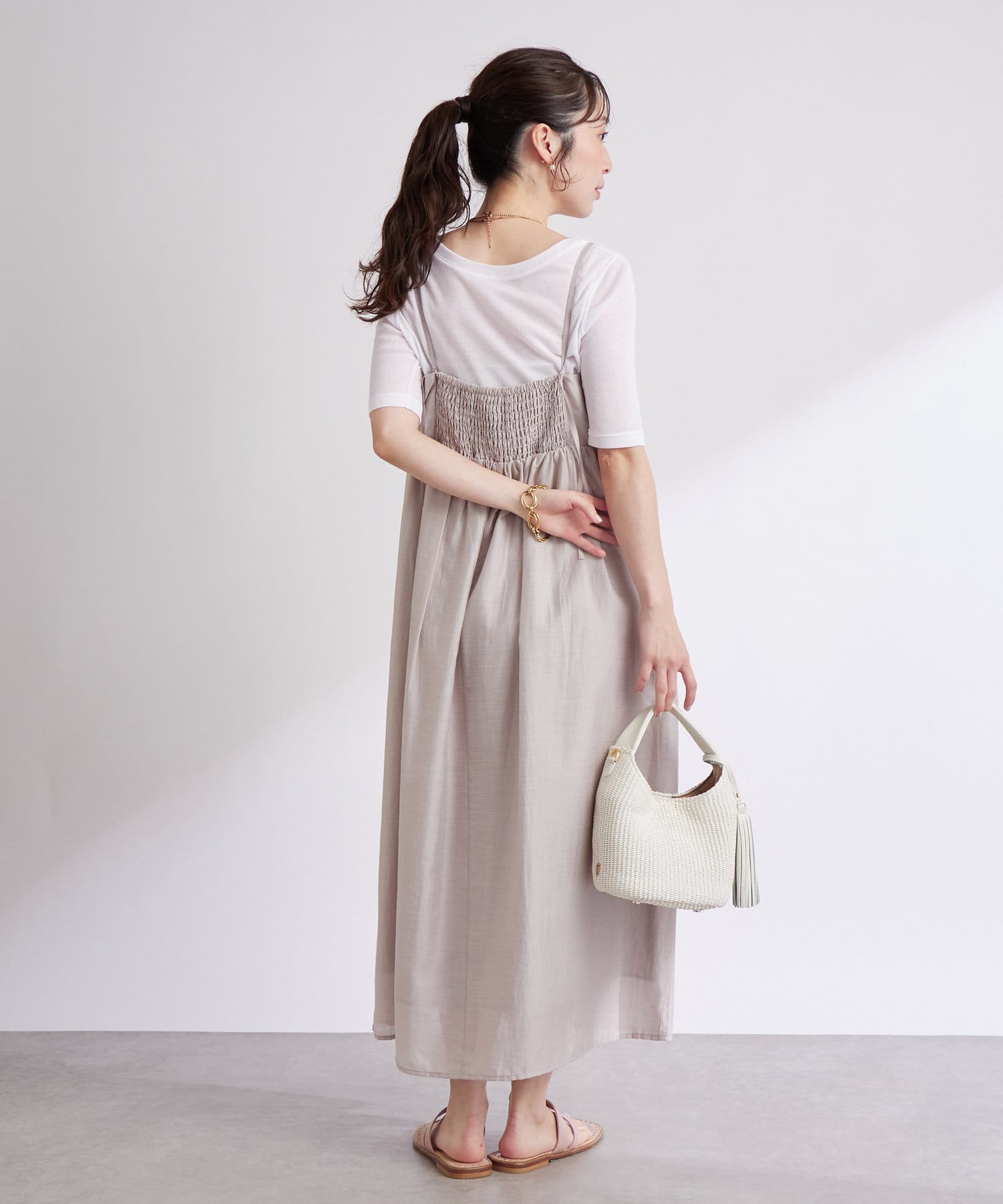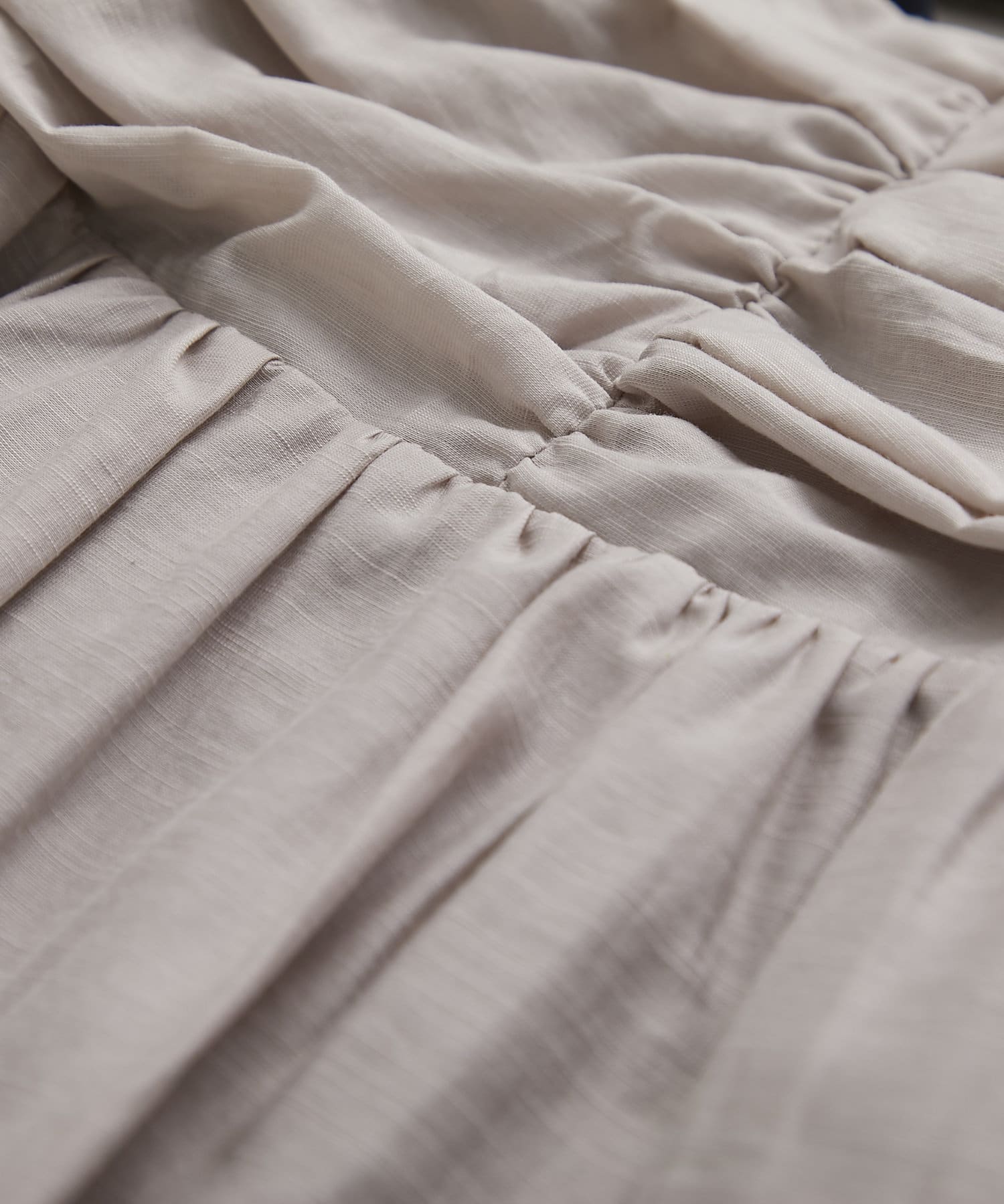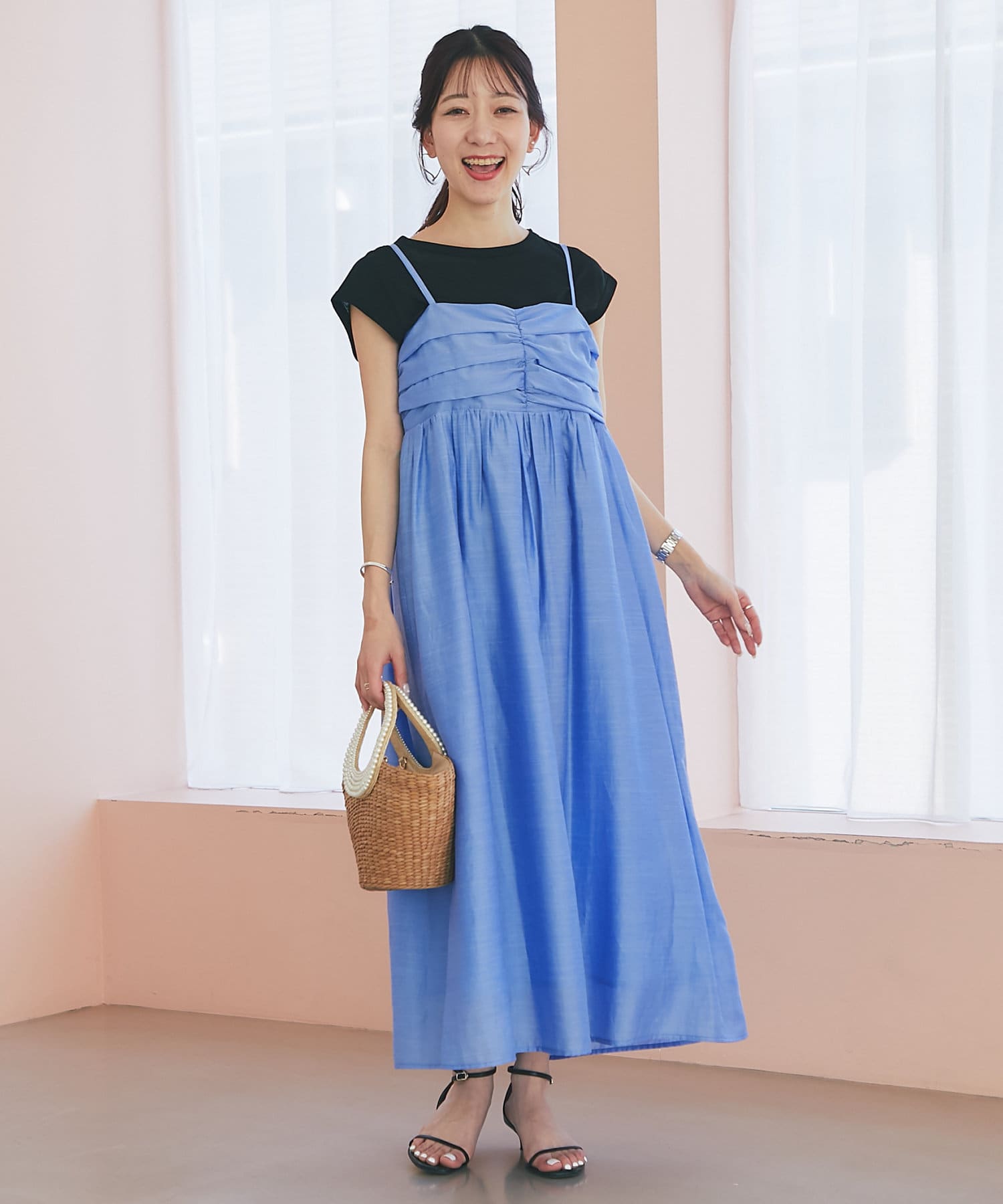 バスト部分はギャザーを寄せているので、女性らしい柔らかな印象を与えつつ、気になる部分をさりげなくカバー。