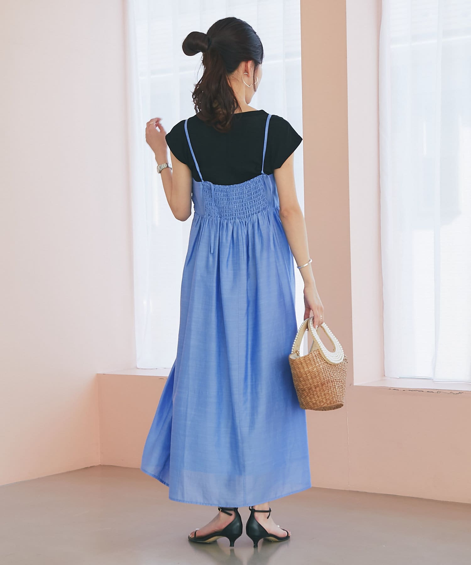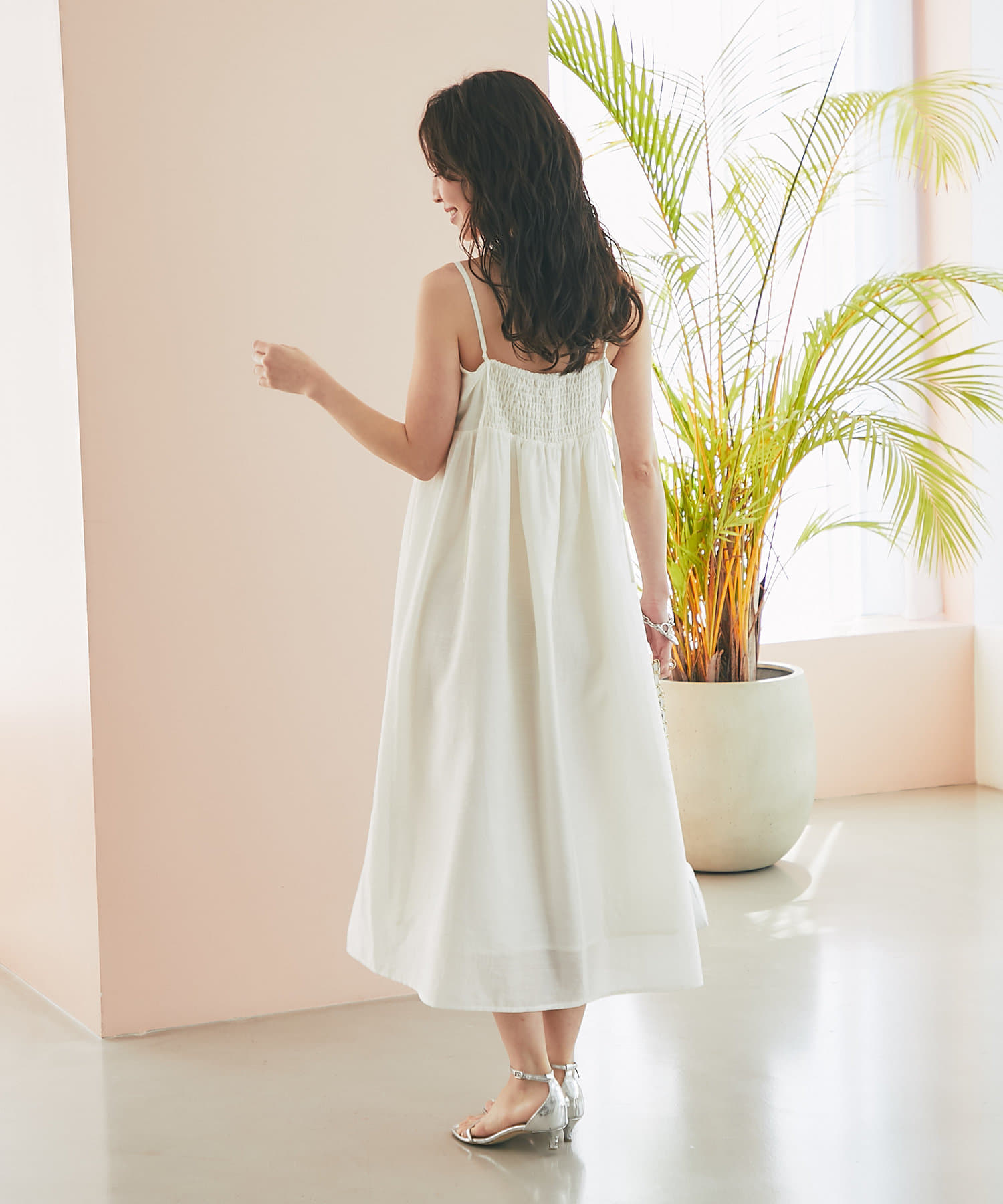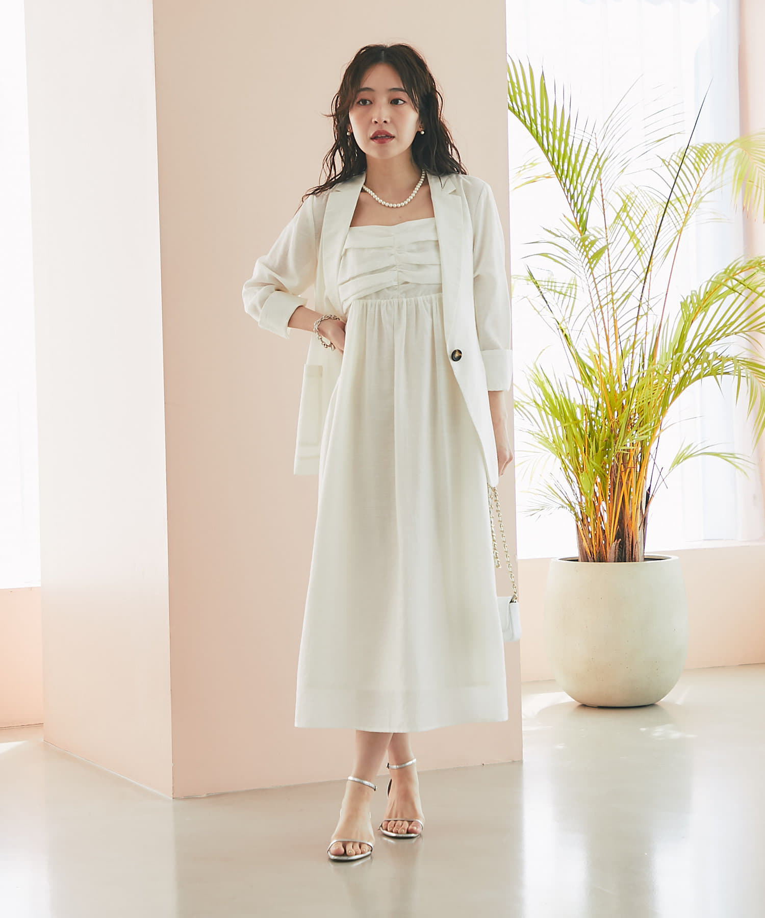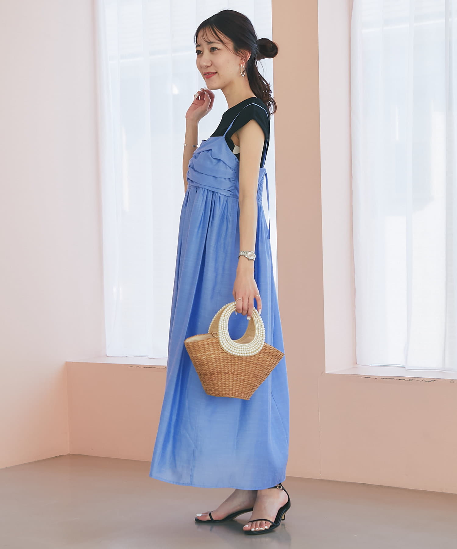 バスト部分はギャザーを寄せているので、女性らしい柔らかな印象を与えつつ、気になる部分をさりげなくカバー。