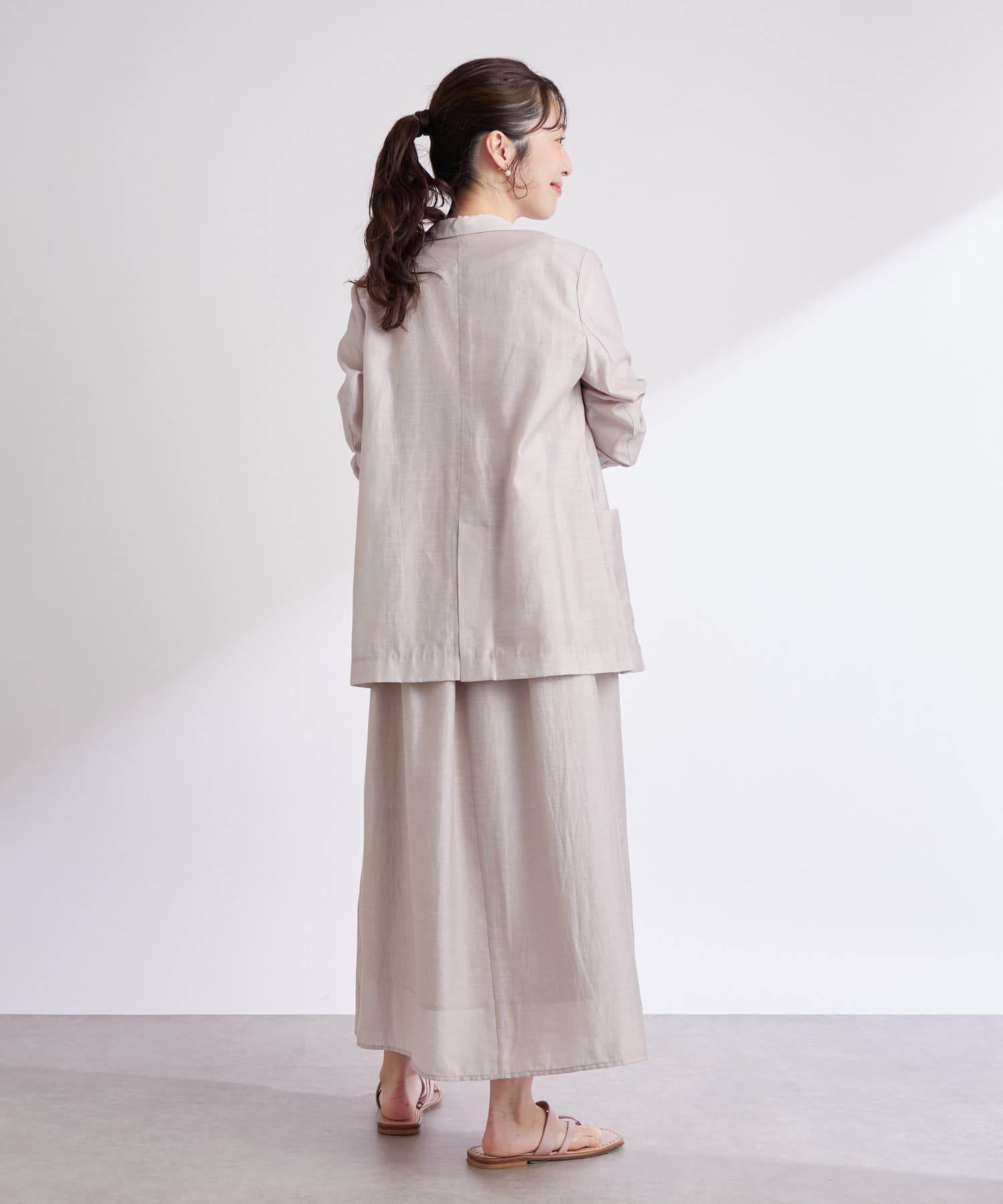 同素材のジャケットと合わせると統一感のある洗練されたコーデが楽しめます。