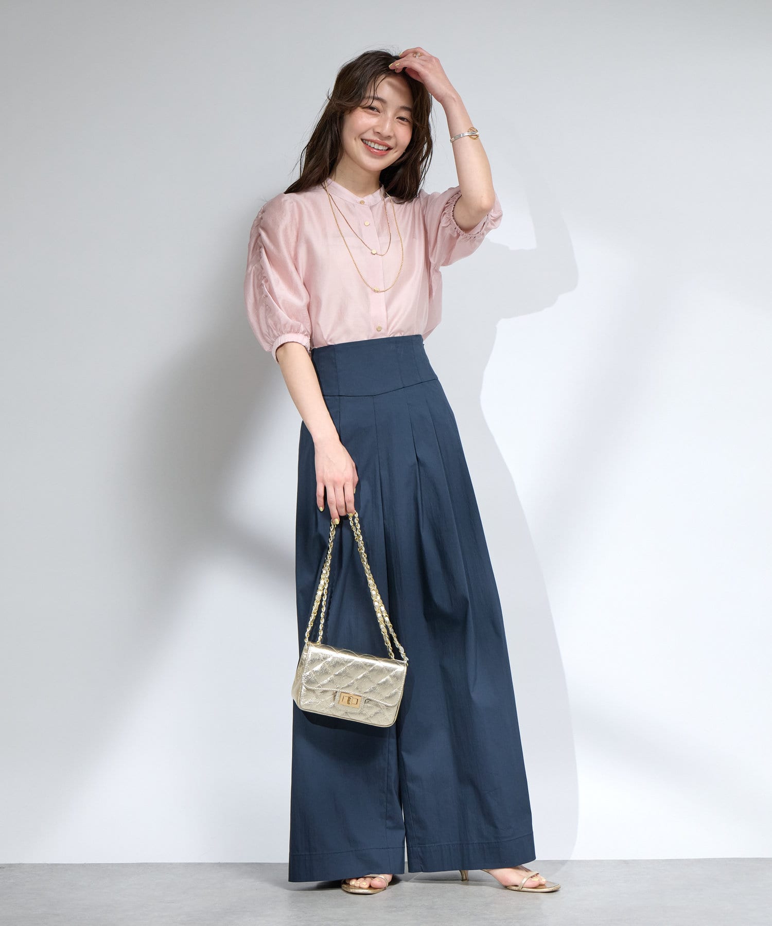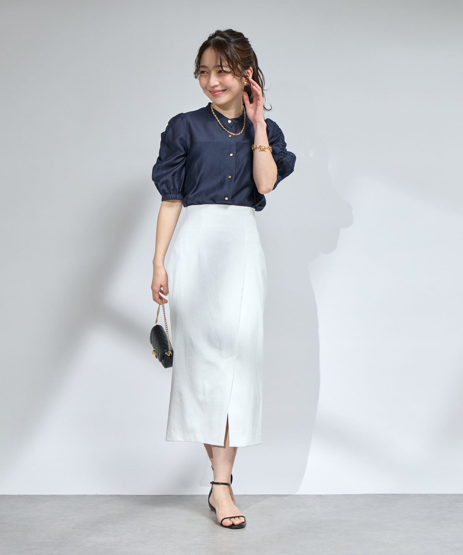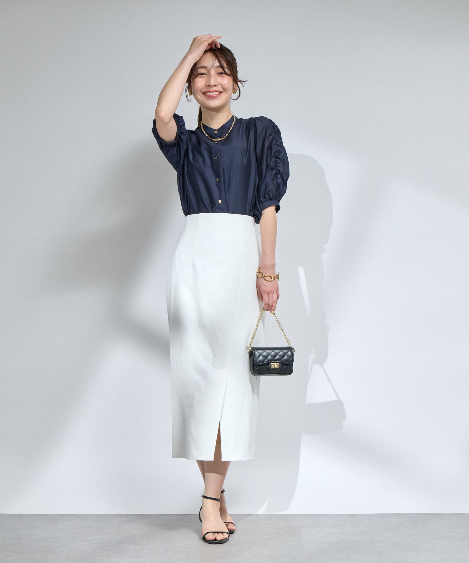 きちんと感のあるテーパードパンツやスカートと合わせてオフィスコーデに。