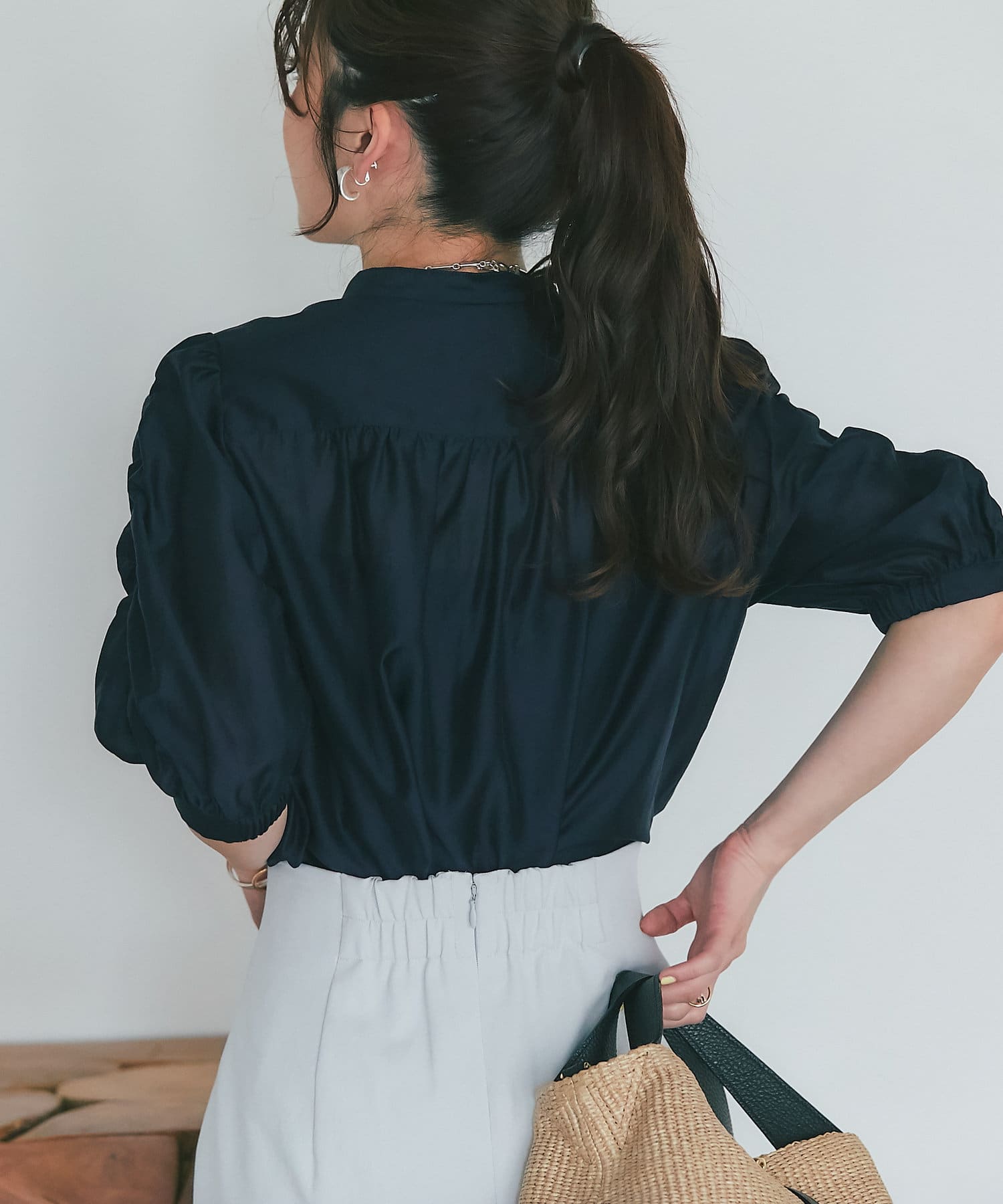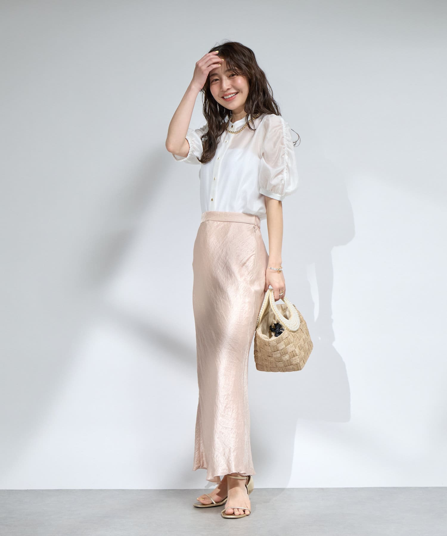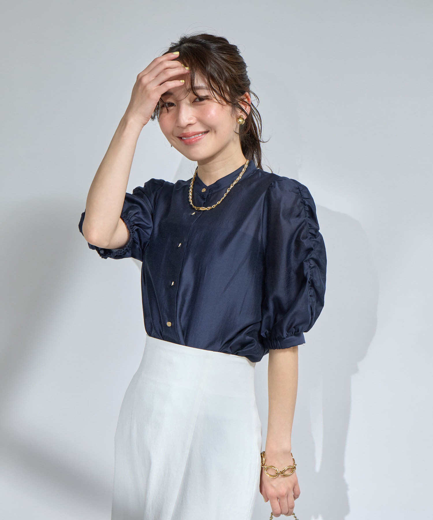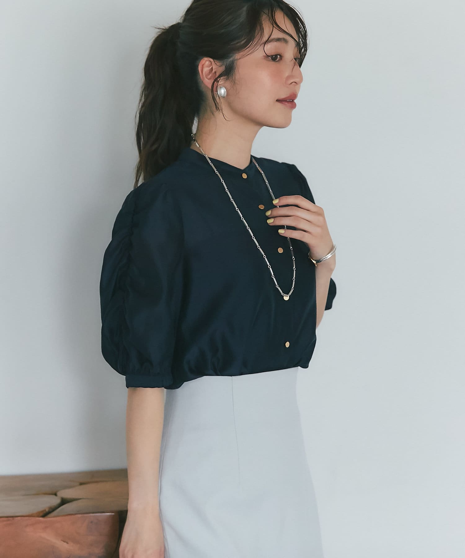 光沢感と、上品なドレープが女性らしさを最大限に引き立ててくれるブラウス
