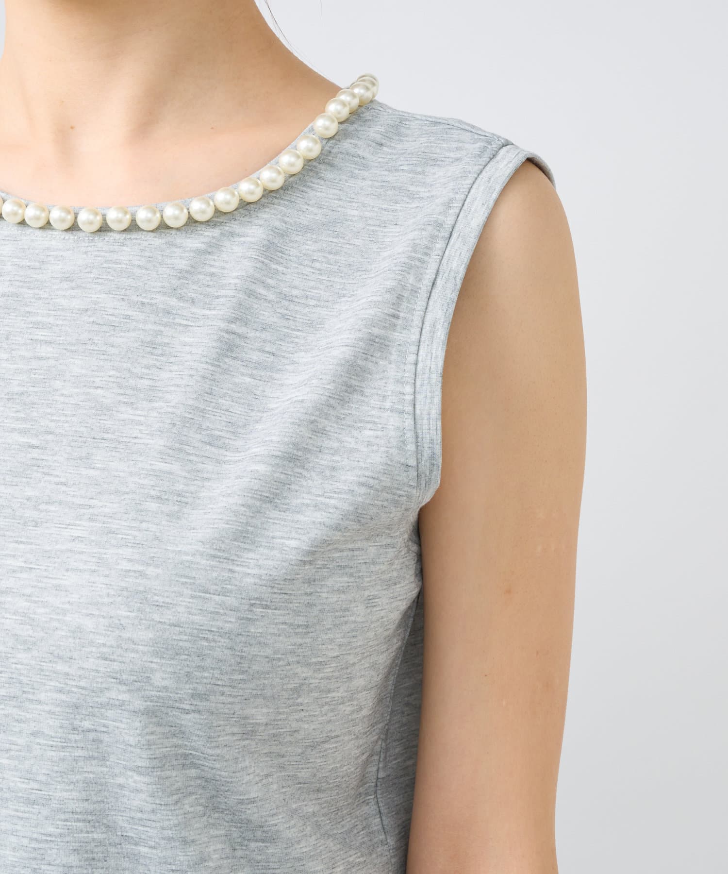 ネックラインに施されたパールが、顔周りを明るくしてくれます。