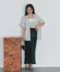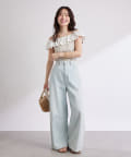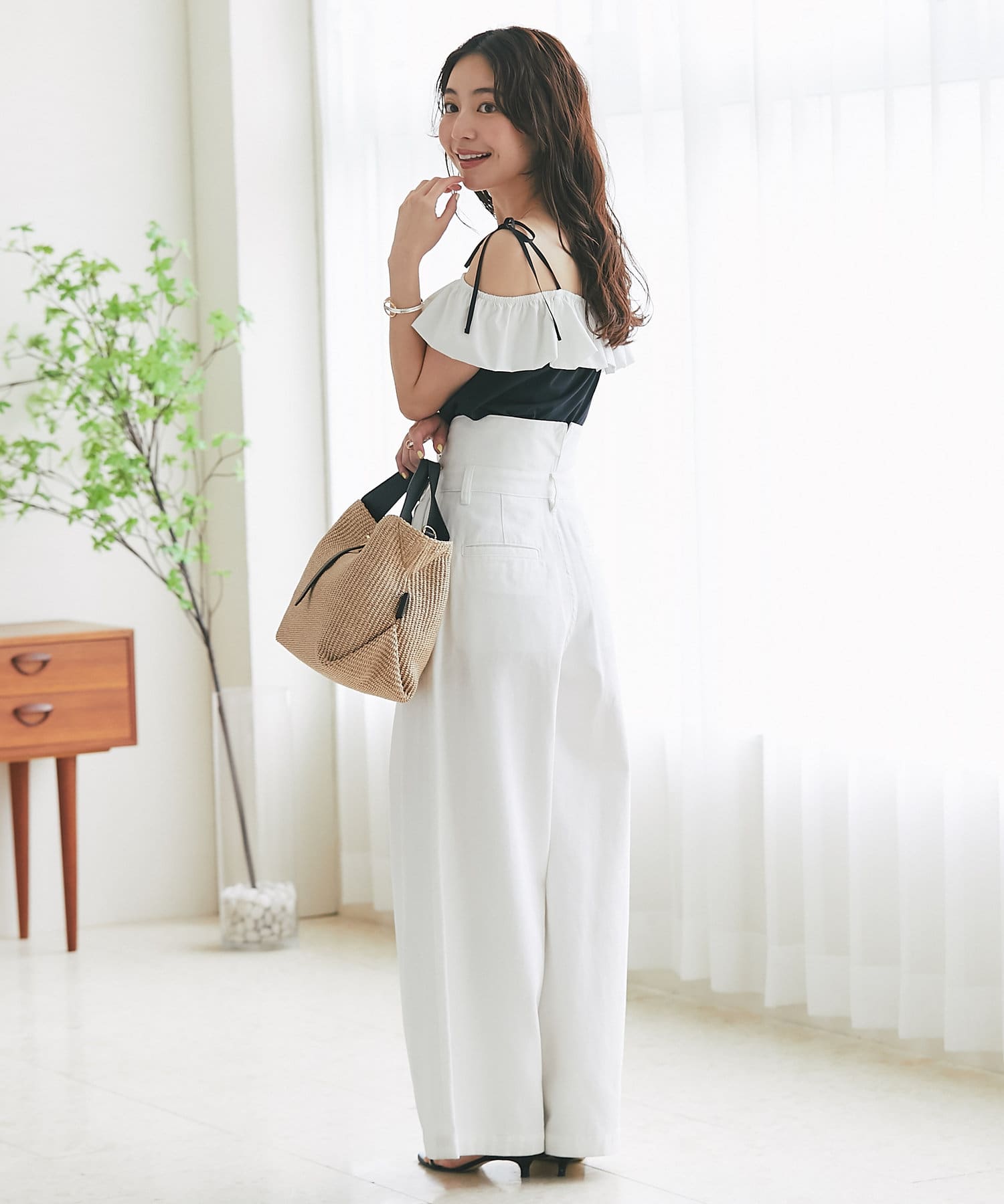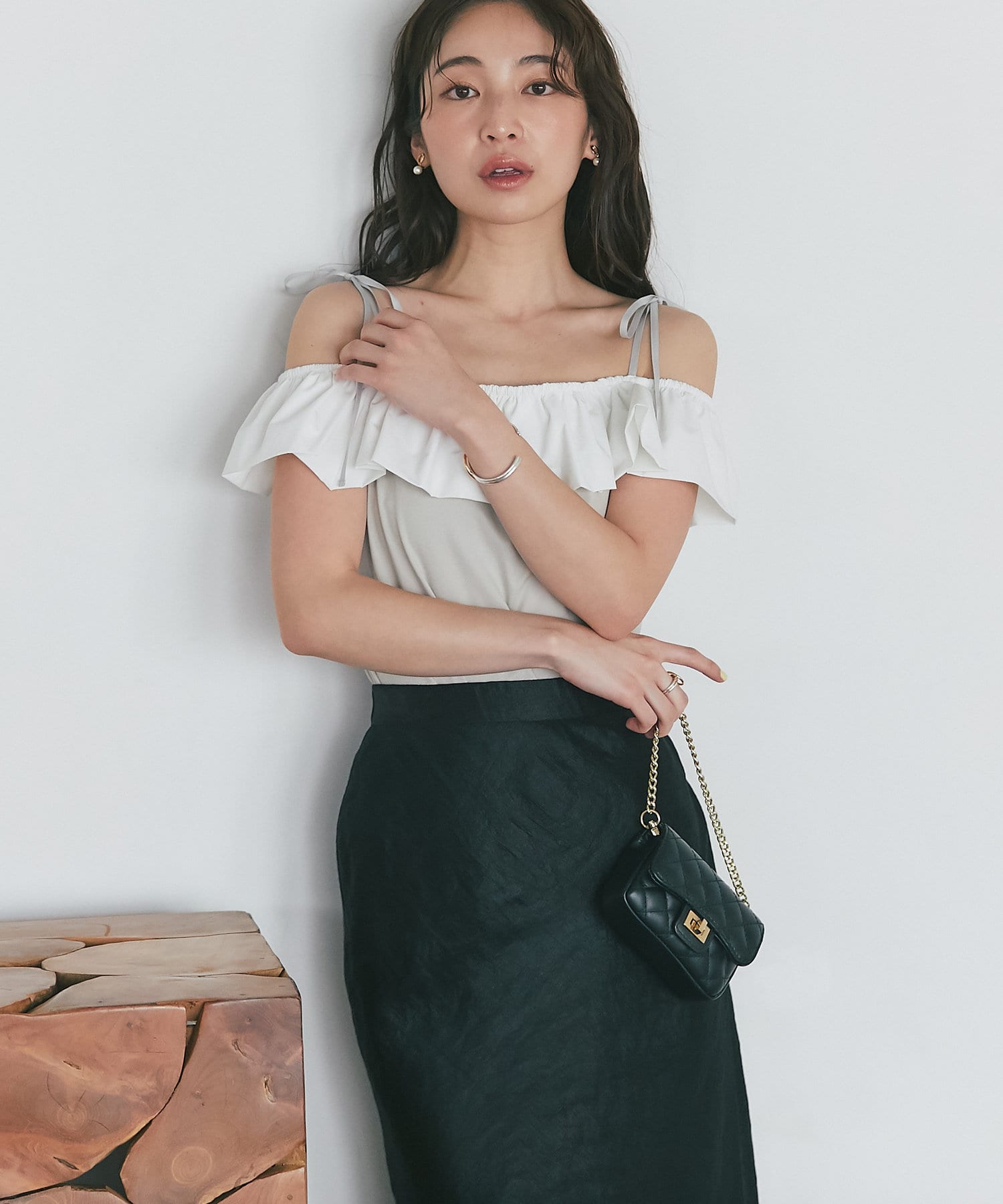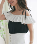 配色、異素材のフリルは目を引くデザインポイントで肩ひもの細いリボンが華奢見え効果も。