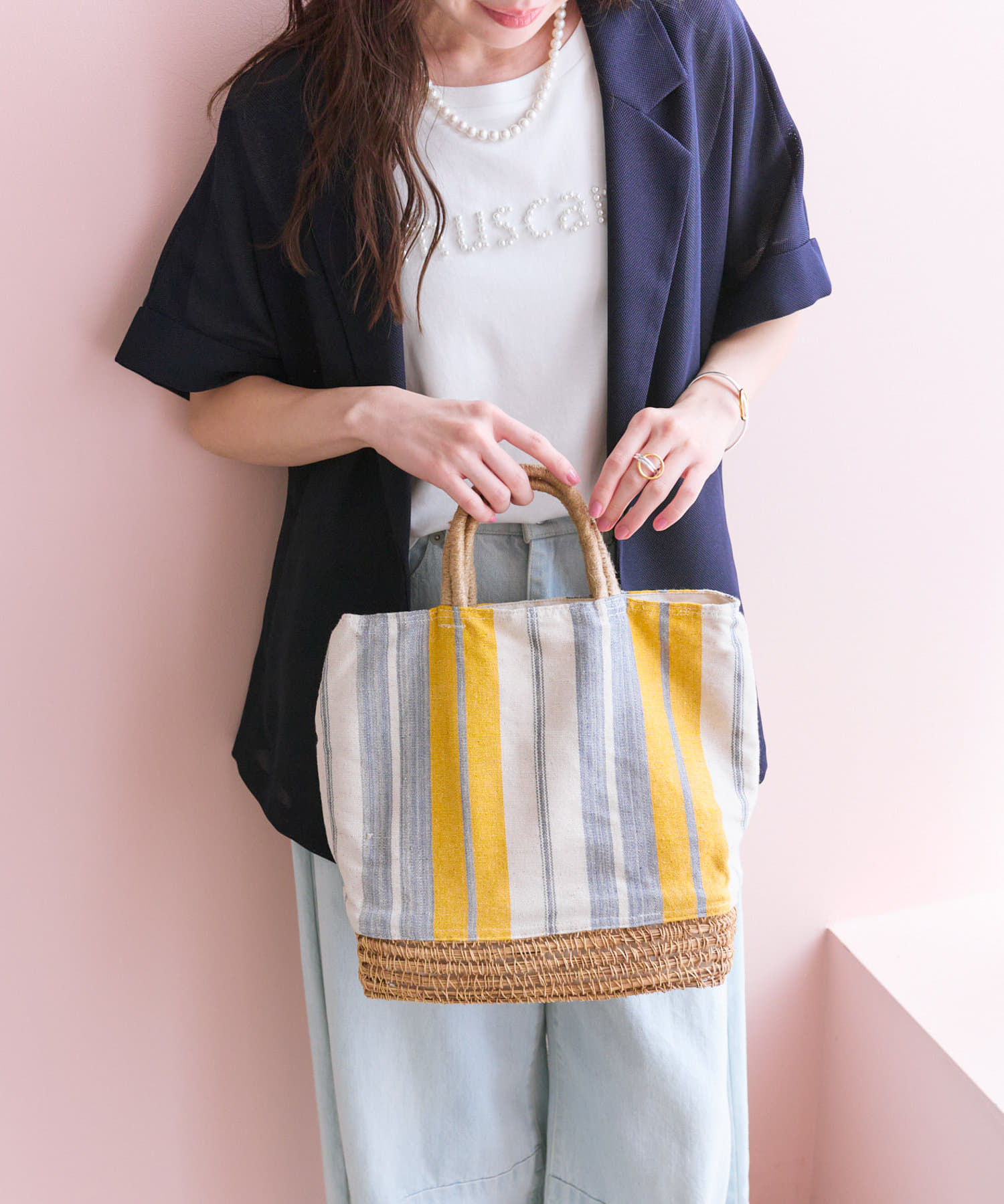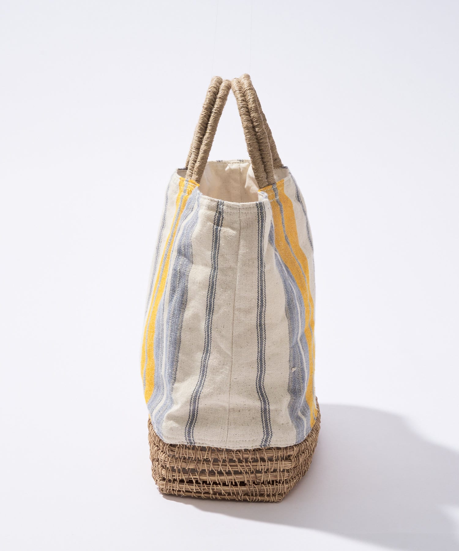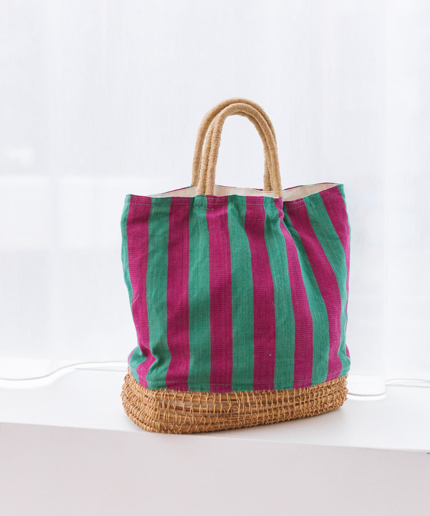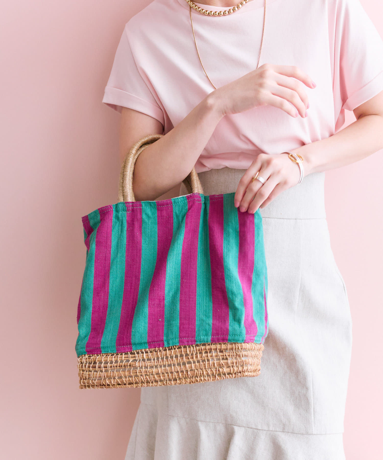 本体はコットン、バッグ底はパームファイバー、持ち手にジュート素材を使用した