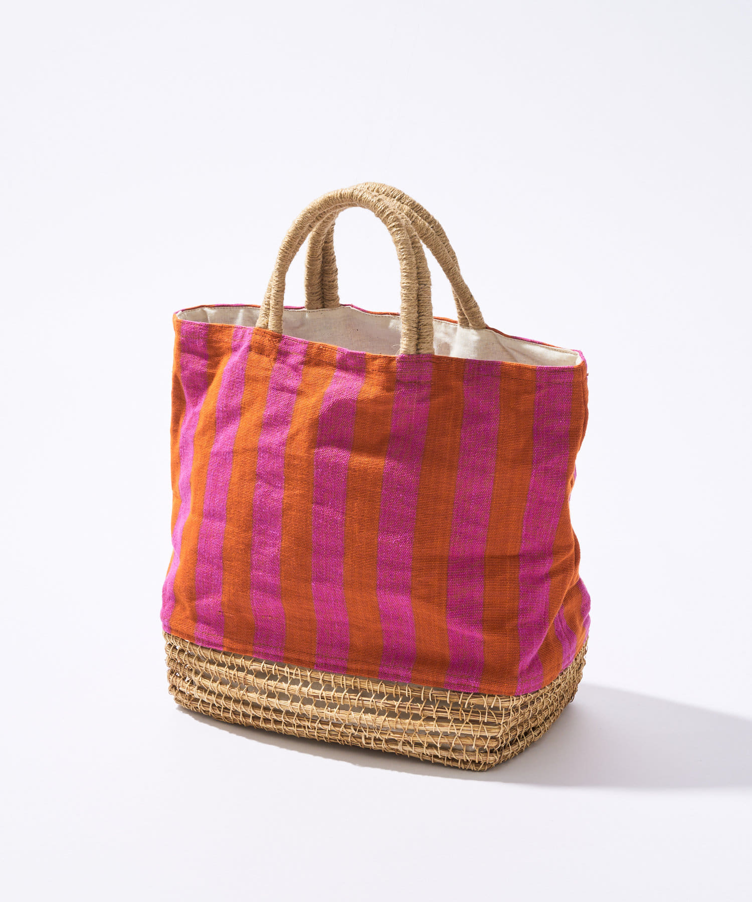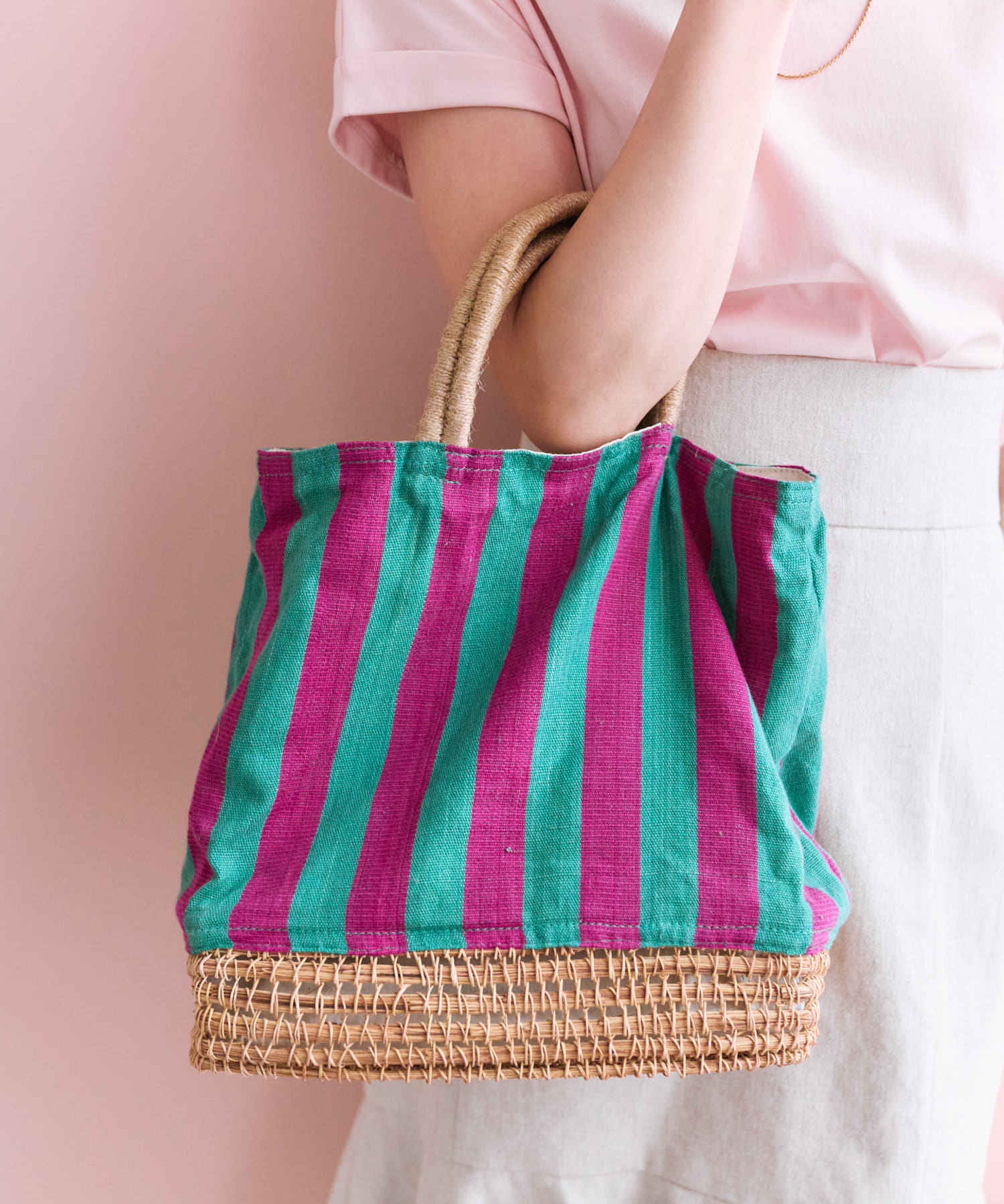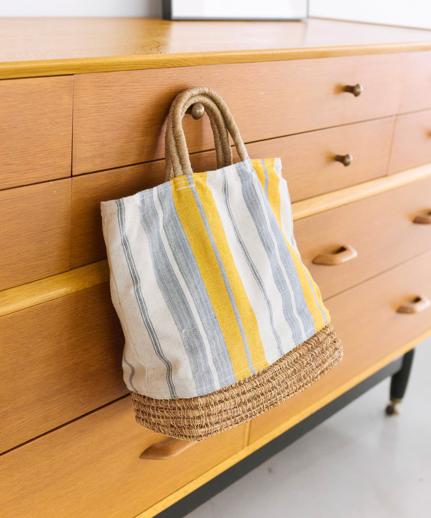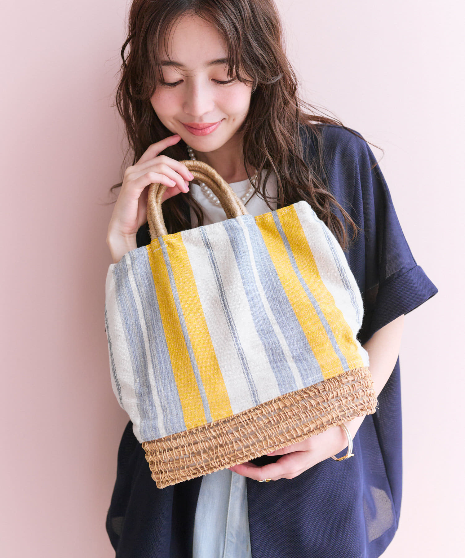 本体はコットン、バッグ底はパームファイバー、持ち手にジュート素材を使用した