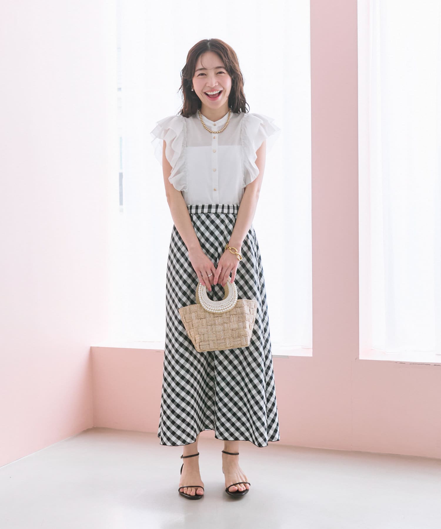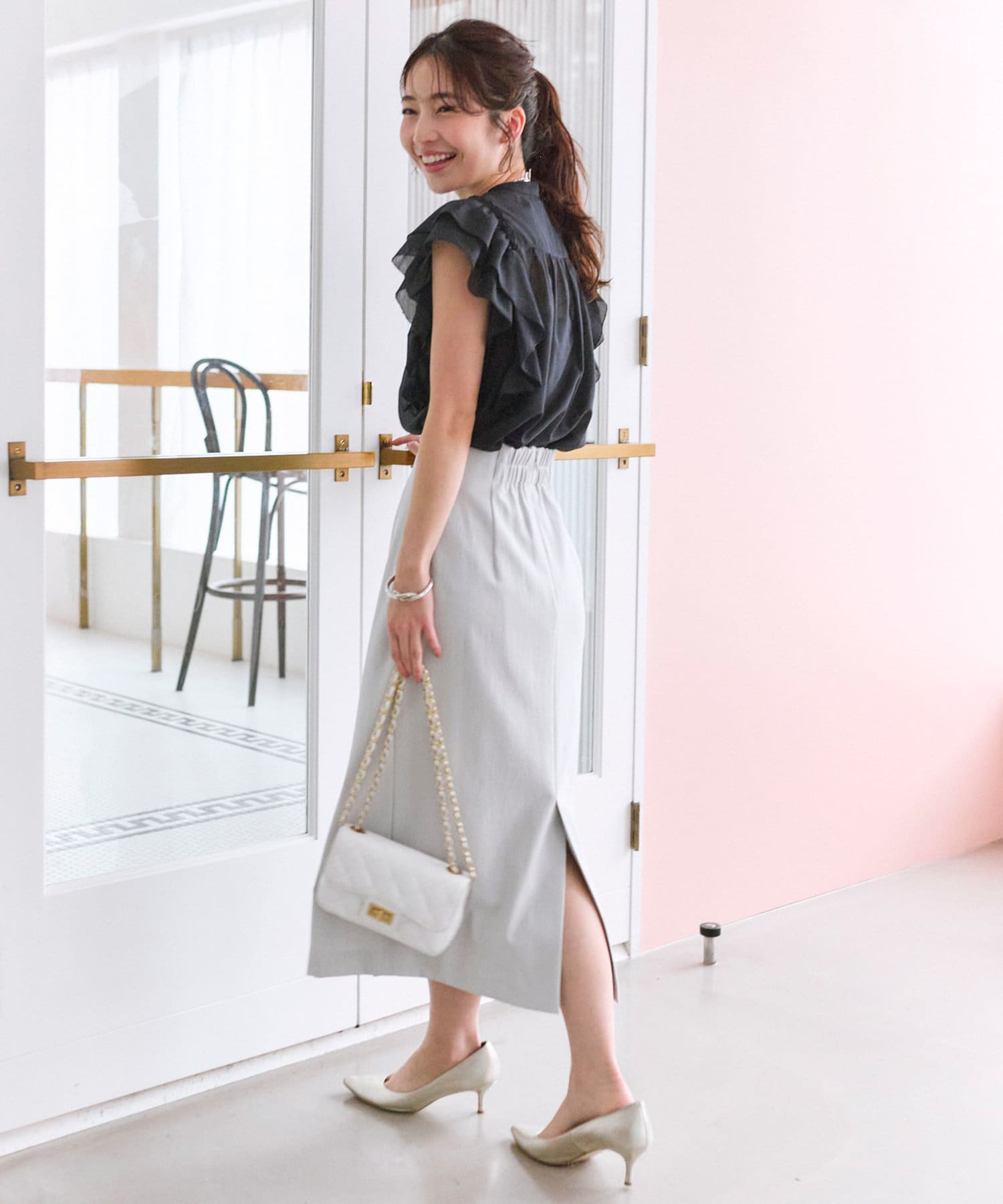 肩を飾るように大きくあしらわれたフリルが、女性らしい華やかな雰囲気を演出。
